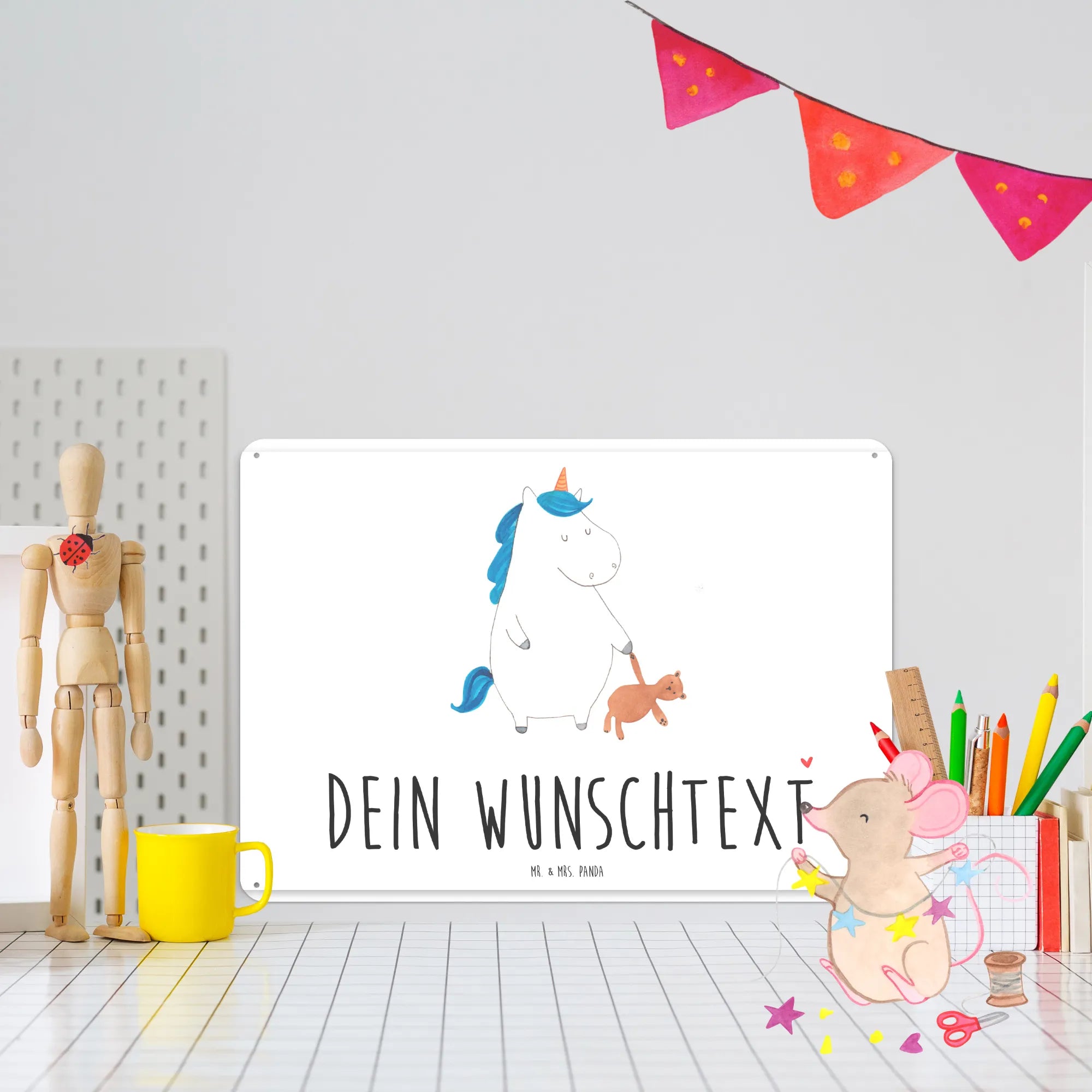 Entdecke das zauberhafte personalisierte Blechschild "Einhorn Teddy" aus der Einhorn-Kollektion von Mr. & Mrs. Panda! Dieses wunderschöne Schild ist nicht nur ein Blickfang, sondern auch der perfekte Begleiter für alle Einhorn-Fans, die eine liebevolle und magische Atmosphäre in ihrem Zuhause schaffen möchten.