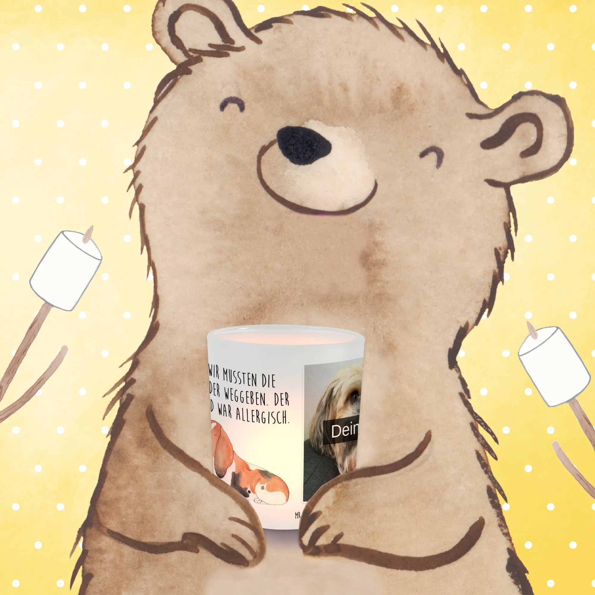Möchtest du deiner Wohnung das gewisse Etwas verleihen? Unser personalisiertes Foto Windlicht von Mr. & Mrs. Panda ist die perfekte Lösung! Es misst 70 mm x 80 mm und ist aus hochwertigem satiniertem Glas gefertigt. Mit deinem eigenen Wunschfoto personalisieren kannst du jedem Raum eine besondere Note verleihen. Denk daran, ein Bild in hoher Auflösung hochzuladen, um die Klarheit zu garantieren. Achte darauf, dass der Bildausschnitt gut passt, denn du willst ja nichts Wichtigeres verlieren! Das Windlicht schützt deine Teelichter nicht nur vor Wind, es schafft auch eine unglaublich romantische Stimmung. Pflege dein Windlicht mit sanfter Handwäsche, damit es lange so schön bleibt. Lass deine Räume in neuem Licht erstrahlen!