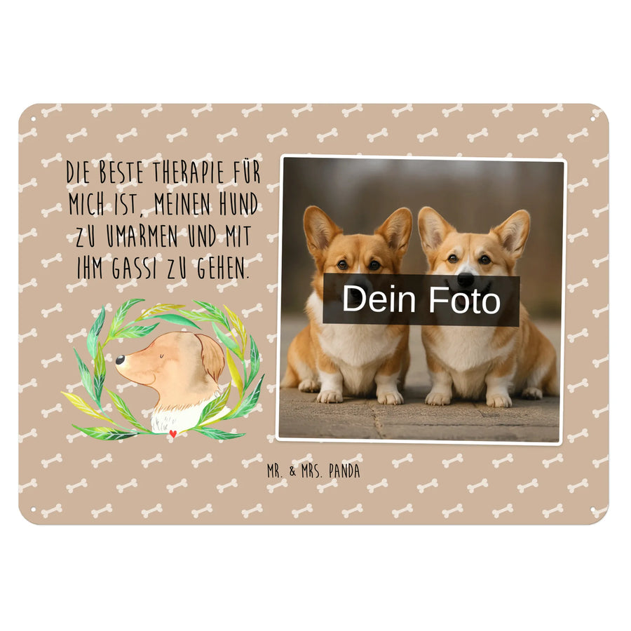 Personalisiertes Foto Blechschild „Hund Ranke" – ein liebevolles Unikat aus der Hunde Kollektion von Mr. & Mrs. Panda. Dieses Blechschild Mit Foto vereint dein persönliches Lieblingsbild mit dem süßen Hund-Motiv und dem Spruch: „Die beste Therapie für mich ist, meinen Hund zu umarmen und mit ihm Gassi zu gehen.“ Es ist die perfekte Kombination aus charmantem Retro-Charakter und moderner Personalisierung.