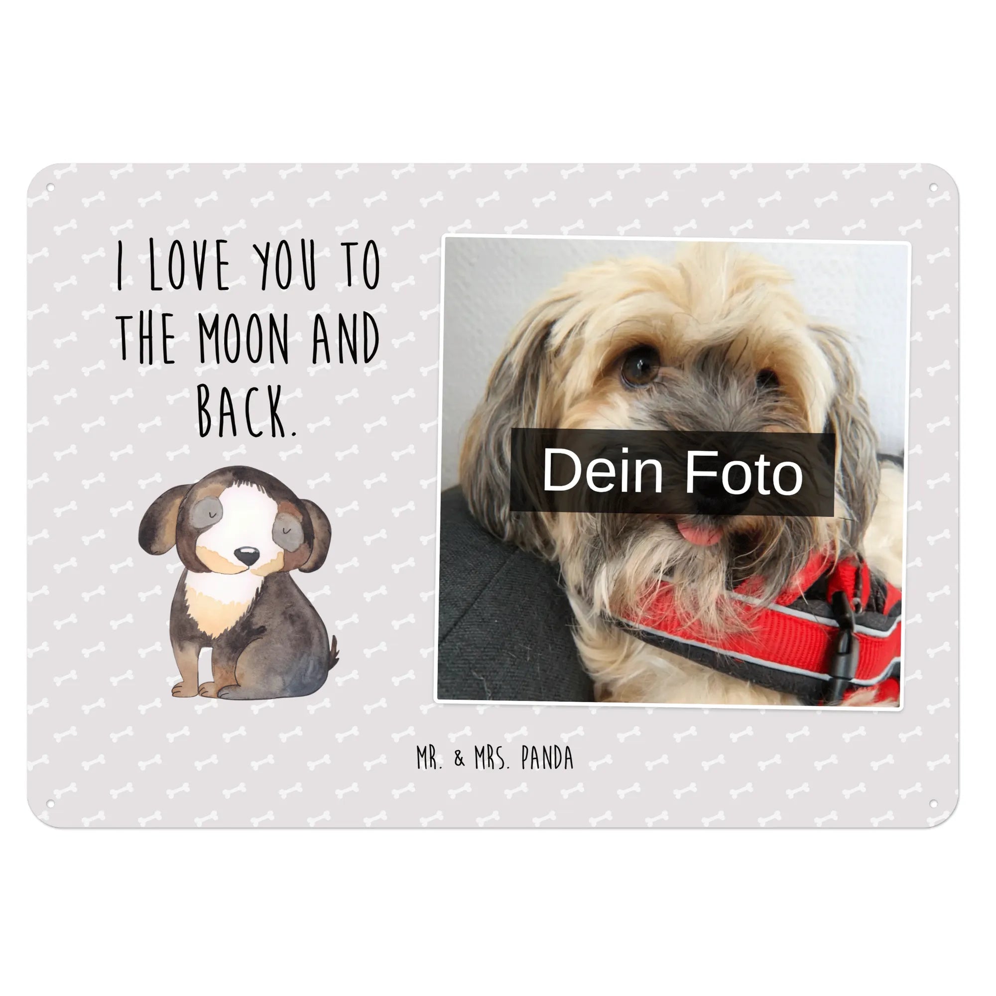 Ein kleines Stück Hundeglück für dein Zuhause: Unser personalisiertes Foto Blechschild aus der Hunde Kollektion von Mr. & Mrs. Panda bringt das entspannte Wesen deines Vierbeiners stilvoll an die Wand oder Tür. Das Motiv "Hund entspannt" zeigt einen lieben schwarz-weißen Hund – kombiniert mit dem warmen Spruch „I love you to the moon and back.“ wird das Schild zu einer besonders persönlichen Geschenkidee für Hundebesitzer und Tierliebhaber.