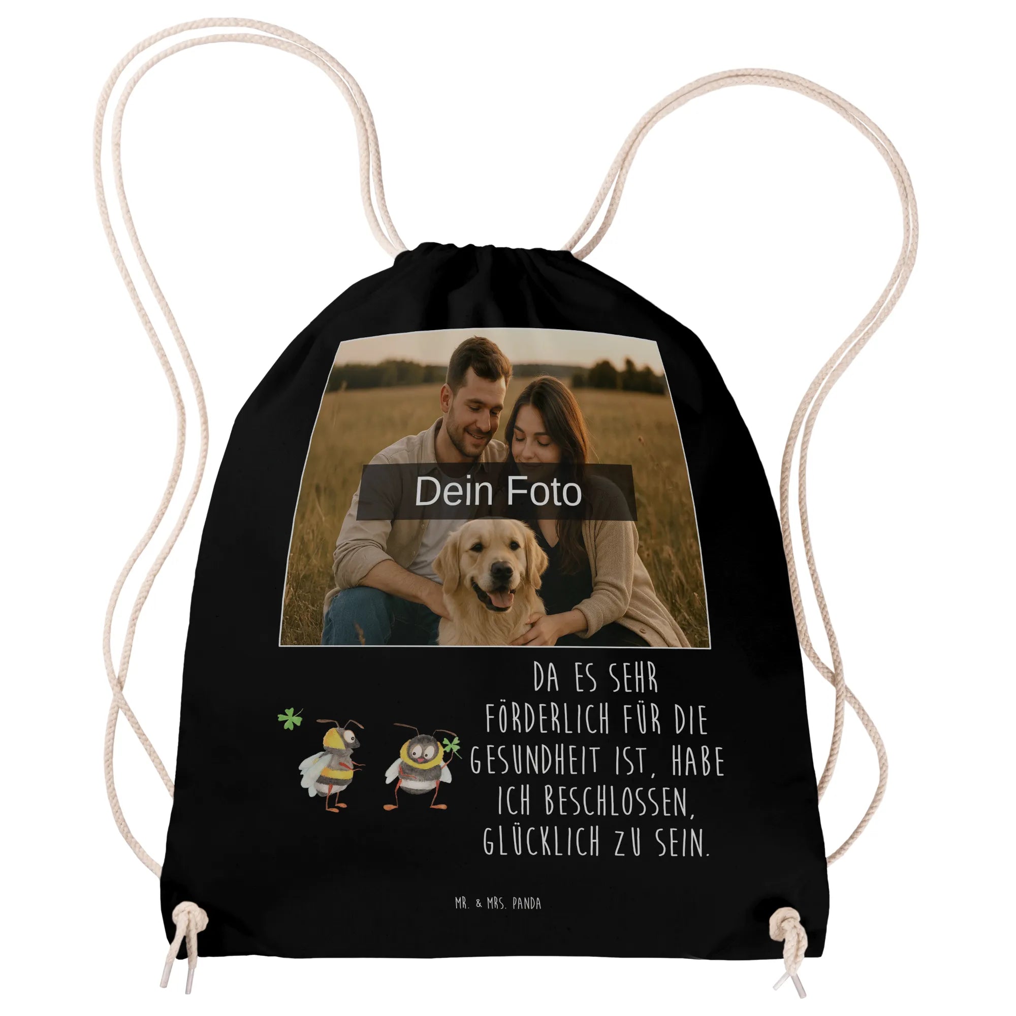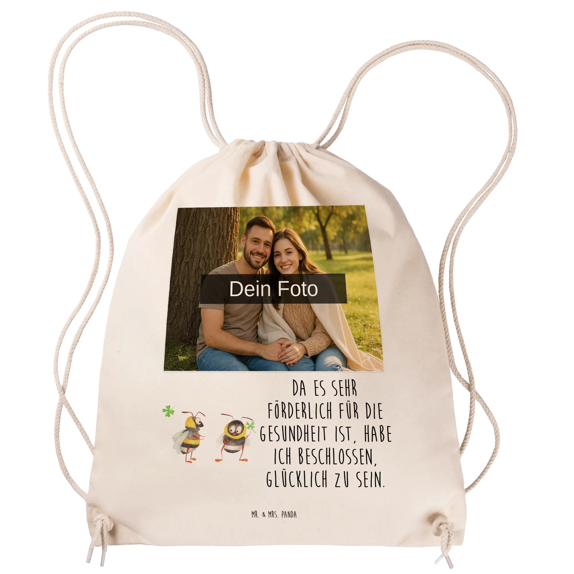 Personalisierter Foto Sportbeutel „Hummeln mit Kleeblatt“ – ein fröhlicher Begleiter aus der Small World Kollektion von Mr. & Mrs. Panda. Du kannst deinen Sportbeutel mit einem eigenen Foto individualisieren und so ein echtes Unikat gestalten. Das liebevoll aquarellierte Motiv zeigt zwei süße Hummeln, die ein Kleeblatt teilen, und der positive Spruch „Da es sehr förderlich für die Gesundheit ist, habe ich beschlossen, glücklich zu sein.“ macht das Design perfekt für alle, die gute Laune lieben. 🐝🍀