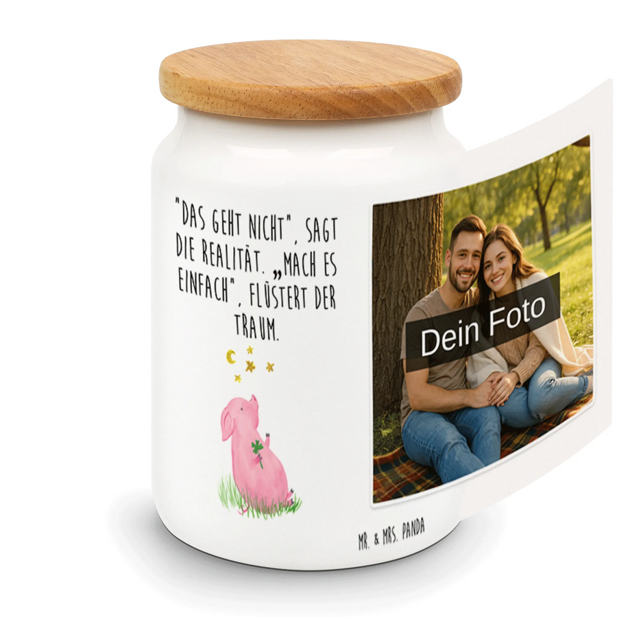 In einer Welt, in der Realität oft das letzte Wort zu haben scheint, erhebt sich ein kleines, mutiges Schweinchen, gewappnet mit einem Kleeblatt und umgeben von funkelnden Sternchen, um uns etwas Wichtiges zu lehren. Es lehrt uns, dass ungeachtet der vielen Stimmen, die sagen, „Das geht nicht“, irgendwo tief in uns ein zarter Traum flüstert: „Mach es einfach“. Dieses Glücksschwein von Mr. & Mrs. Panda, unser kleiner Glücksbringer, ist hier, um dich an die unglaubliche Kraft der Hoffnung und der unerschütterlichen Motivation zu erinnern. Lass es dein Wegweiser sein, wenn du deinen persönlichen Sternenhimmel erschaffst, indem du Schritt für Schritt auf deine Träume zugehst.