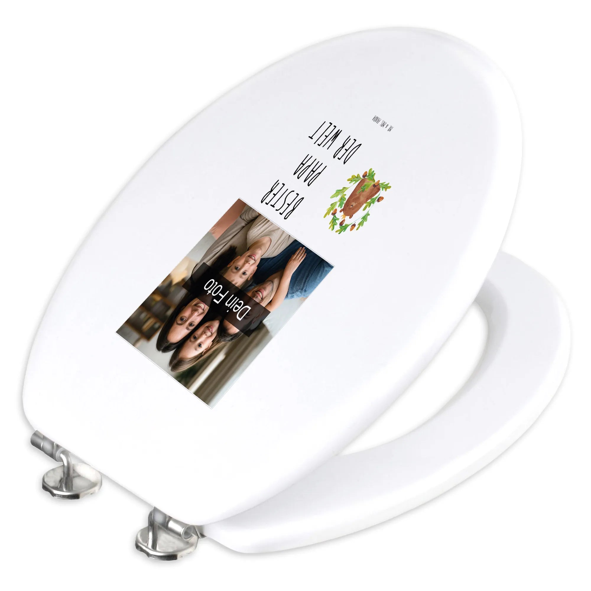 Mache dein Badezimmer zu einem Ort voller Freude mit unserem personalisierten Foto WC Sitz Motiv von Mr. & Mrs. Panda! Dieses einzigartige Möbelstück misst 430 mm x 370 mm x 50 mm und ist entweder aus edlem Bambus Holz (braun) oder praktischem MDF Holz (weiß) erhältlich. Der Sitz wird mit bezaubernden Motiven und fröhlichen Sprüchen bedruckt, die dein Bad in einen fröhlichen Raum verwandeln. Aber das Beste daran? Du kannst ihn mit deinem persönlichen Wunschfoto gestalten! Denk daran, dass das hochgeladene Bild in guter Auflösung sein sollte, damit alles optimal zur Geltung kommt. Dieser WC Sitz passt auf jede Euro-WC-Becken und wird mit sämtlichem Befestigungsmaterial geliefert. Er ist nicht nur angenehm und wärmespeichernd, sondern lässt sich auch einfach reinigen – ein feuchtes Tuch und milde Seife genügen! Mit dem langlebigen UV-Druck bleibt dein persönliches Motiv auch viele Jahre strahlend schön. Hol dir diesen einmaligen Toilettensitz und bringe gute Laune ins Bad!