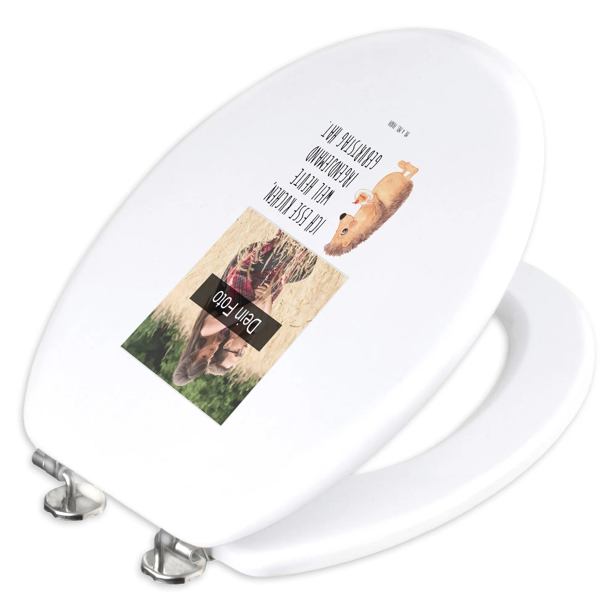 Mach dein Badezimmer zu einem besonderen Ort mit unserem personalisierten Foto WC Sitz Motiv! Der Sitz hat die Maße von 430 mm x 370 mm x 50 mm und ist wahlweise aus hochwertigem Bambus Holz (braun) oder robustem MDF Holz (weiß) gefertigt. Dieser liebevoll gestaltete Toilettensitz wird mit süßen Motiven und zauberhaften Sprüchen von Mr. & Mrs. Panda bedruckt. Lass deiner Kreativität freien Lauf und personalisiere ihn mit deinem eigenen Wunschfoto! Achte darauf, dass das hochgeladene Motiv hochauflösend ist, damit der Druck klar und lebendig wird. Denk daran, den richtigen Bildausschnitt zu wählen, damit keine wichtigen Details verloren gehen. Dieser WC Sitz passt auf alle Euro-WC-Becken und ist mit einem einfachen Montageset ausgestattet. Er bietet nicht nur hohen Sitzkomfort, sondern sorgt dank seiner speziellen Eigenschaften für ein angenehmes Sitzgefühl, selbst an kalten Tagen. Mit einem süßen Motiv bringst du mehr Lebensfreude in dein Badezimmer. Pflege dein neues Schmuckstück ganz einfach mit einem feuchten Tuch und handelsüblicher Seife, ohne aggressive Putzmittel. Der hochqualitative UV-Druck sorgt dafür, dass das Motiv lange strahlend bleibt. Hol dir jetzt diesen besonderen Toilettensitz und mach dein Bad einzigartig!