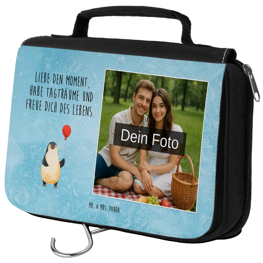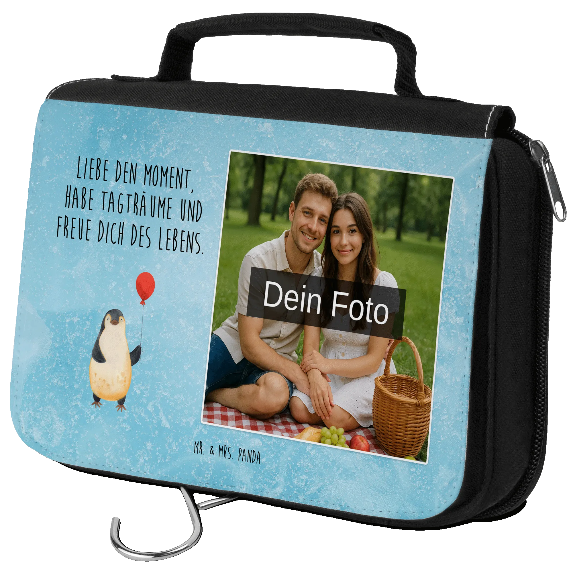 Personalisierter Foto Kulturbeutel Pinguin Luftballon - Eisblau