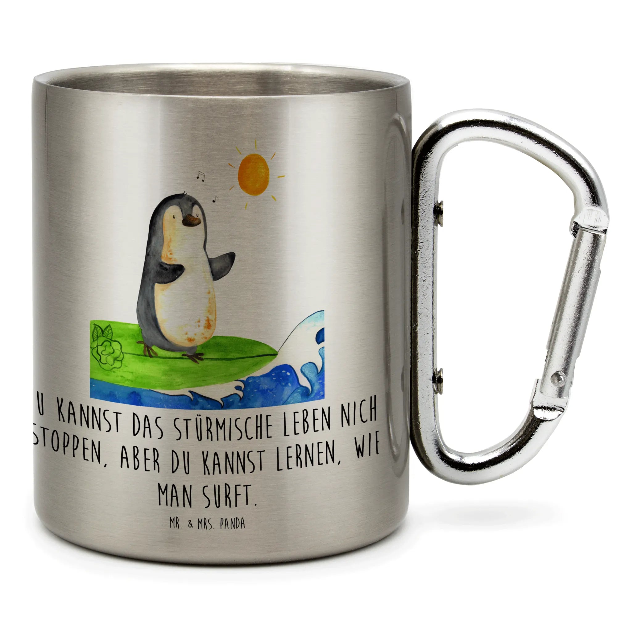 Introducing the delightful Stainless Steel Mug from Mr. & Mrs. Panda, featuring the charming Penguin Surfer design! This beautiful and robust stainless steel mug, with a capacity of 330 ml (11 oz), is perfect for outdoor enthusiasts, campers, and anyone who adores penguins and the spirit of adventure.