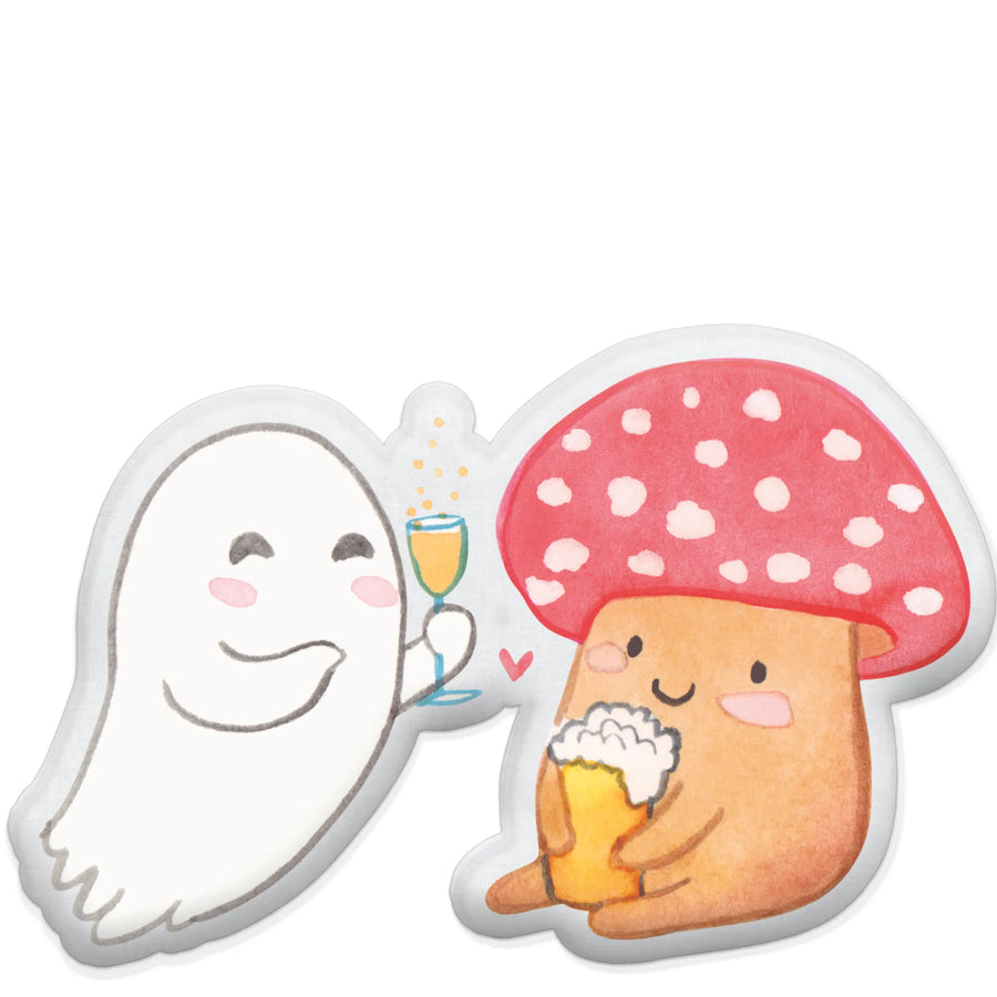 Die detailreiche Gestaltung zeigt ein freundliches Gespenst, das mit einem Glas Champagner anstoßt, und einen niedlichen Fliegenpilz mit einem Bier in der Hand. Ein Bild voller Lebensfreude und fröhlicher Stimmung!