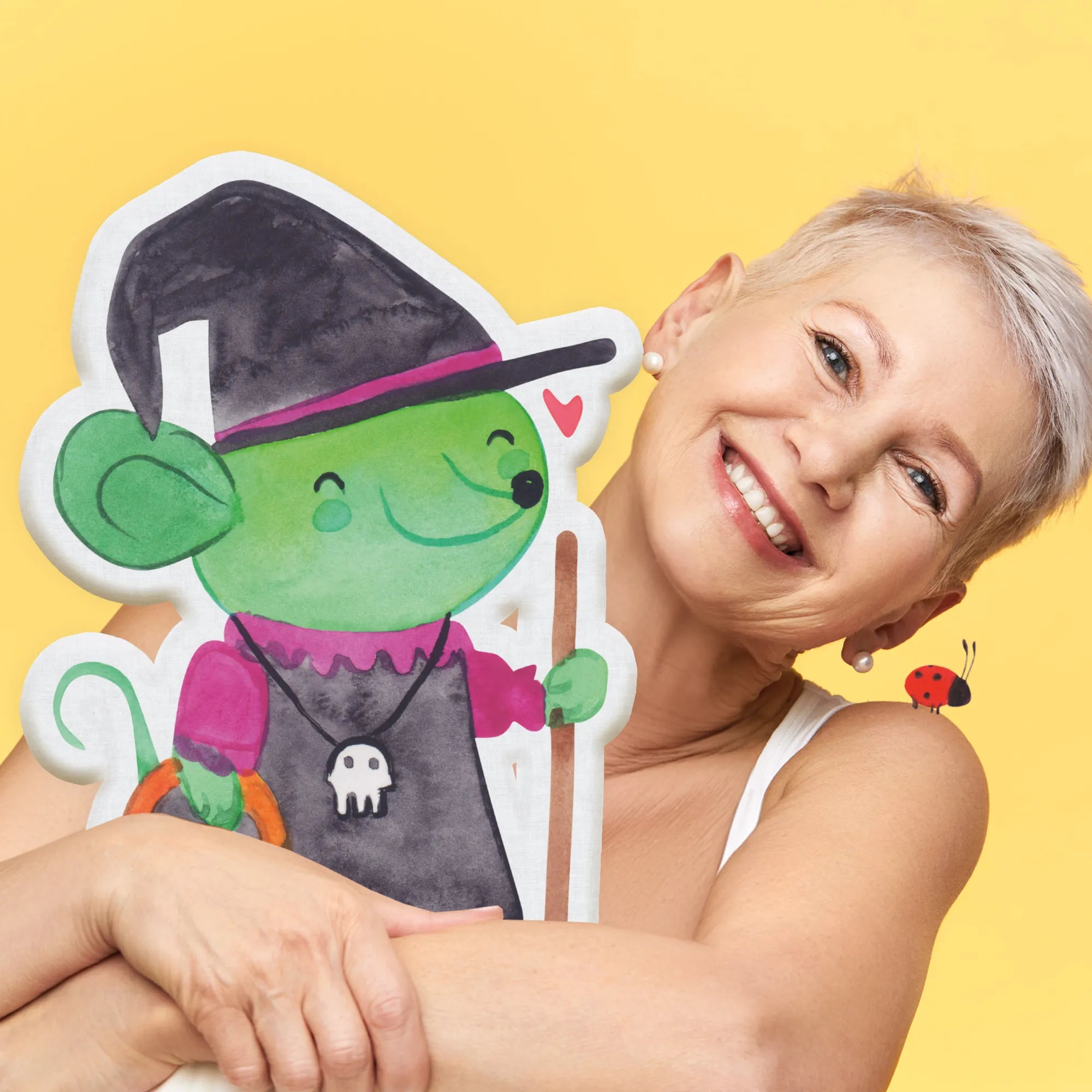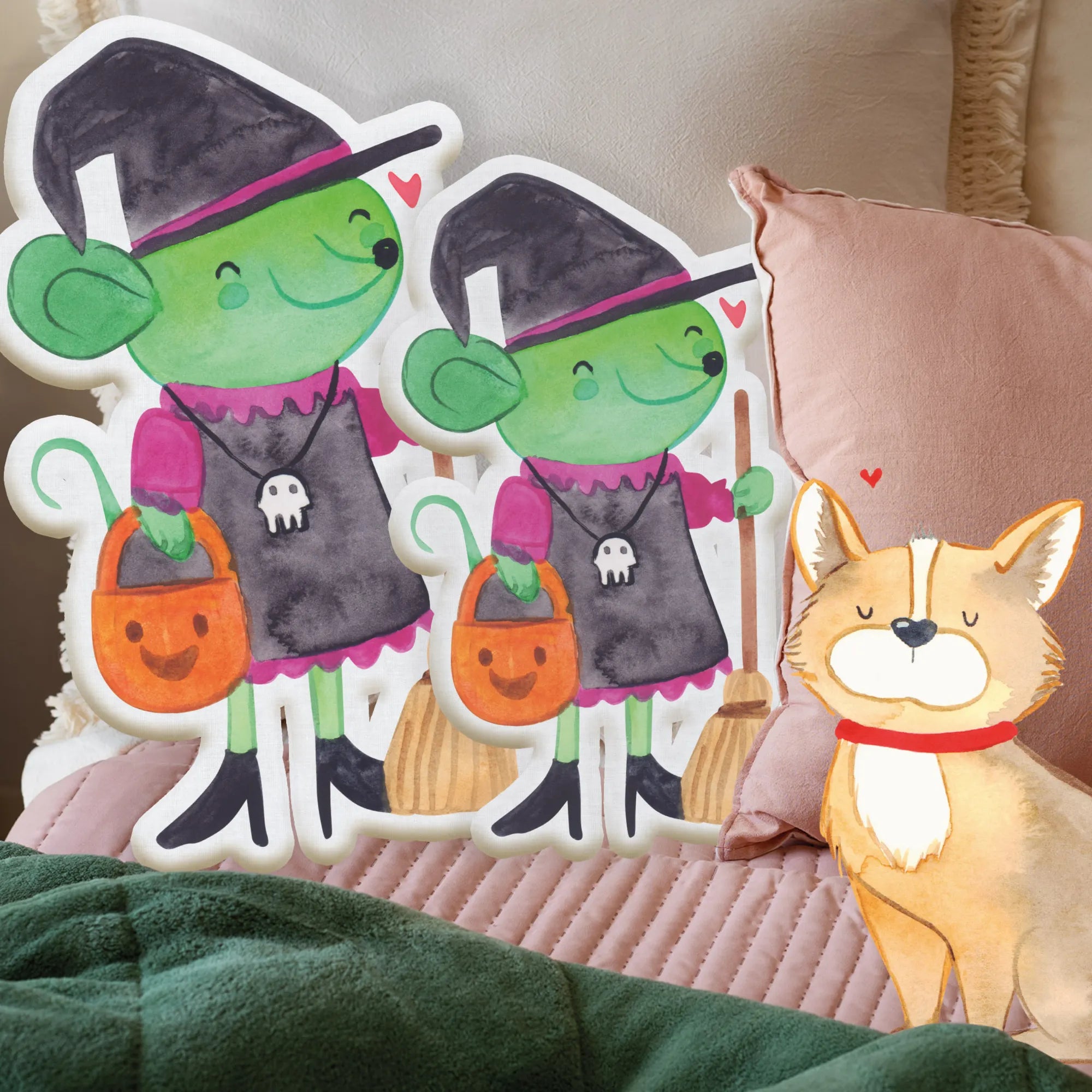 Meet our magical Mouse Witch, a delightful sight that will warm your heart! This cheerful green mouse is clad in a beautiful black dress, embellished with a cheeky white skull, and topped off with a classic witch hat. She carries an orange pumpkin basket overflowing with goodies, and in her other hand, she wields a broom, ready for her nightly escapades. Picture her zooming through the starry sky, spreading happiness and a sprinkle of mischief! This motif is not just a decoration; it’s a celebration of the joy and fun of Halloween. Perfect for adding a splash of whimsy to your living space or gifting it to someone who loves all things spooky yet sweet. Let this enchanting Mouse Witch bring a little extra magic to your life!