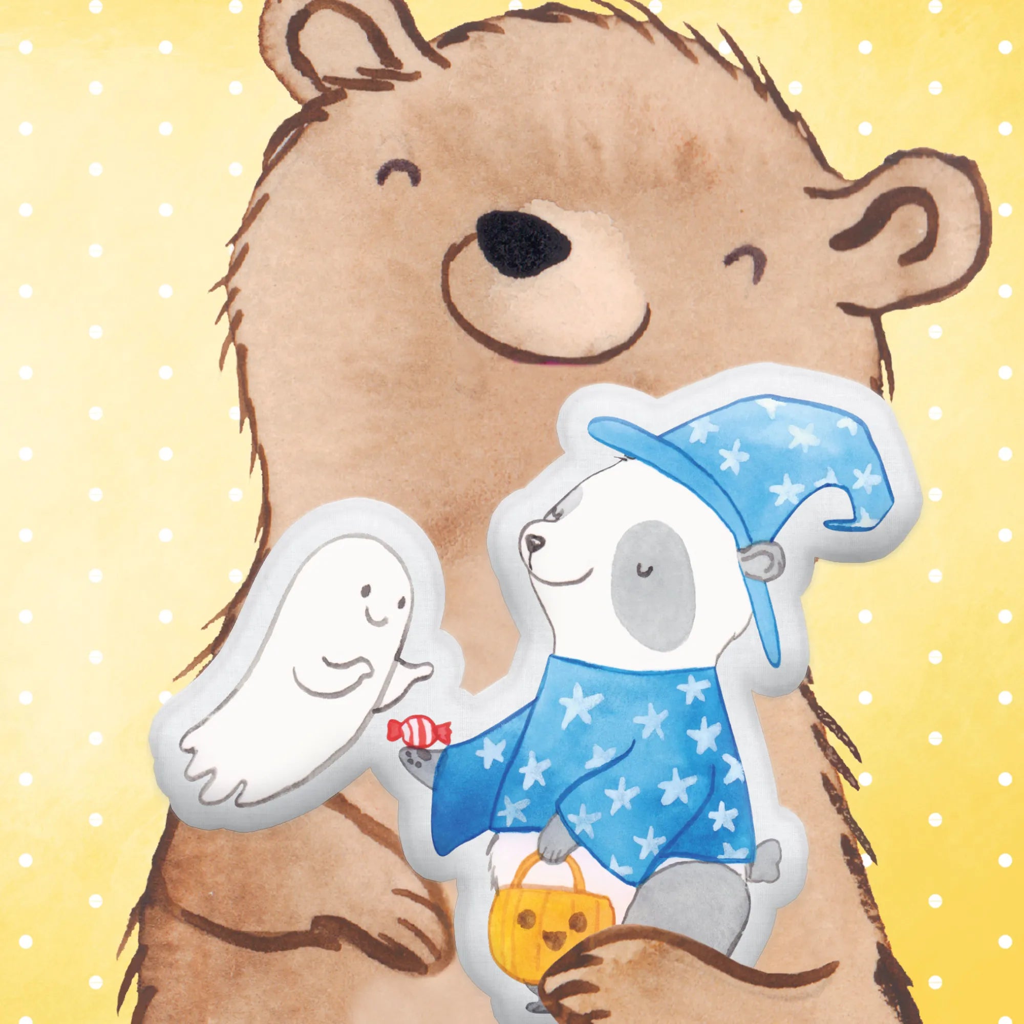 Der süße Panda, der sich mit einem blauen Umhang und einem großen Zauberhut mit funkelnden Sternen verkleidet hat, begeistert durch sein liebevolles Design und die fantasievollen Details. Hier schwingt ein kleiner Zauberer einen leckeren Bonbon an ein schwebendes Gespenst – eine Szene, die zum Träumen einlädt!