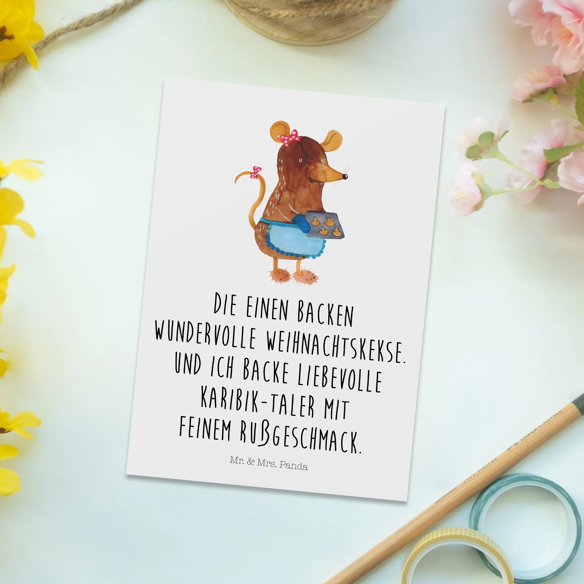 What makes this postcard even more special? It's designed for the chaos queens of the kitchen who embrace the beautiful mess of holiday baking! The whimsical slogan "Die einen backen wundervolle Weihnachtskekse. Und ich backe liebevolle Karibik-Taler mit feinem Rußgeschmack" pairs perfectly with the imagery, bringing lighthearted humor into your holiday greetings. Just imagine sending this card to a baking enthusiast who appreciates both the art and the craziness of holiday preparations – a guaranteed chuckle!