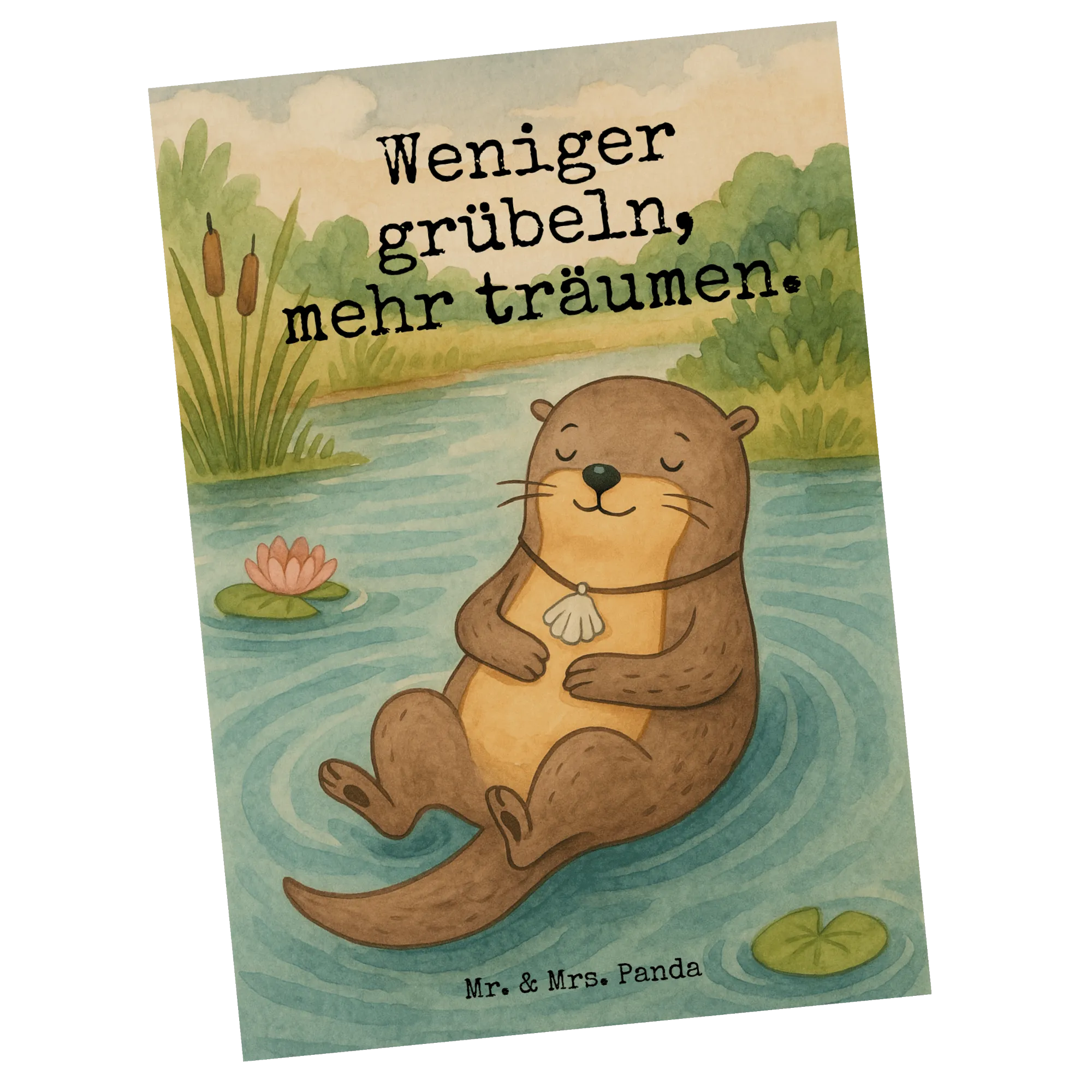 Otter Postkarte „Otter mit Muschelmedaillon“ – ein winziges Stück Meer für unterwegs! Diese liebevoll illustrierte Otter Karte aus der Otter - Kollektion von Mr. & Mrs. Panda bringt dir ein Lächeln und eine sanfte Erinnerung: Weniger grübeln, mehr träumen. 🐾