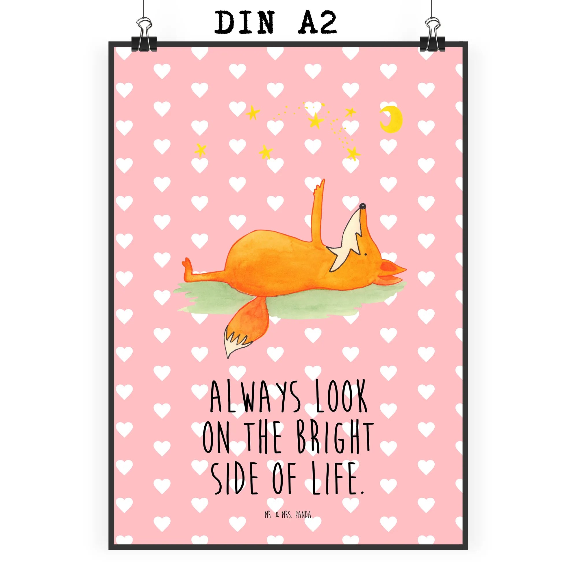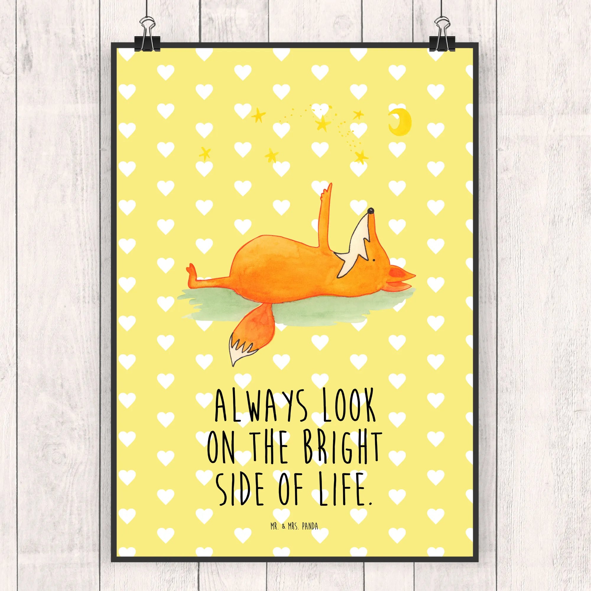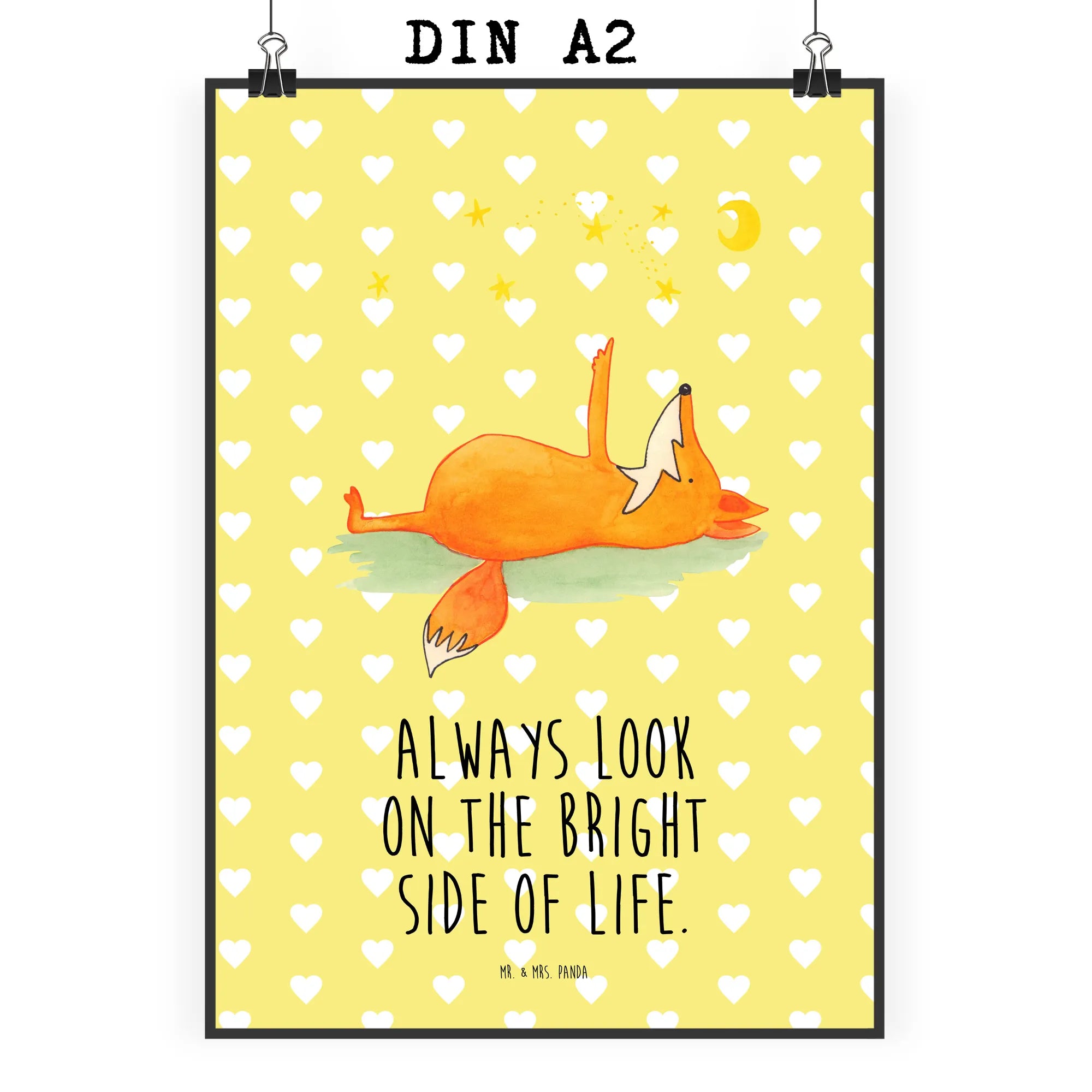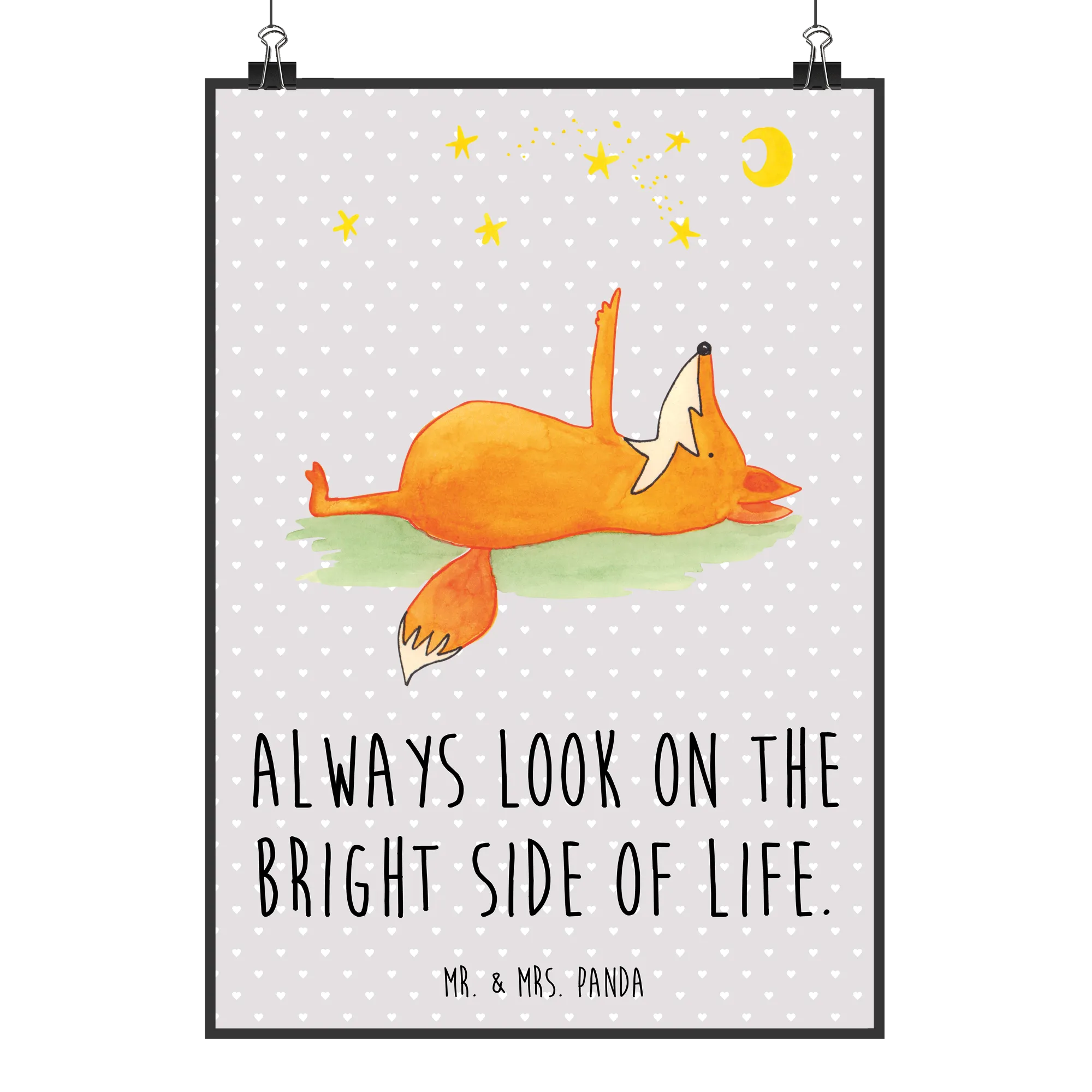 Unser „Fuchs Sterne“ Poster aus der Fuchs Kollektion von Mr. & Mrs. Panda vereint liebevolle Handzeichnung, pastellige Farben und einen aufmunternden Spruch: Always look on the bright side of life. Der süße Fuchs liegt entspannt auf dem Rücken und schaut begeistert zu den funkelnden Sternen – ein Motiv, das Wärme, Romantik und Zuversicht ausstrahlt.