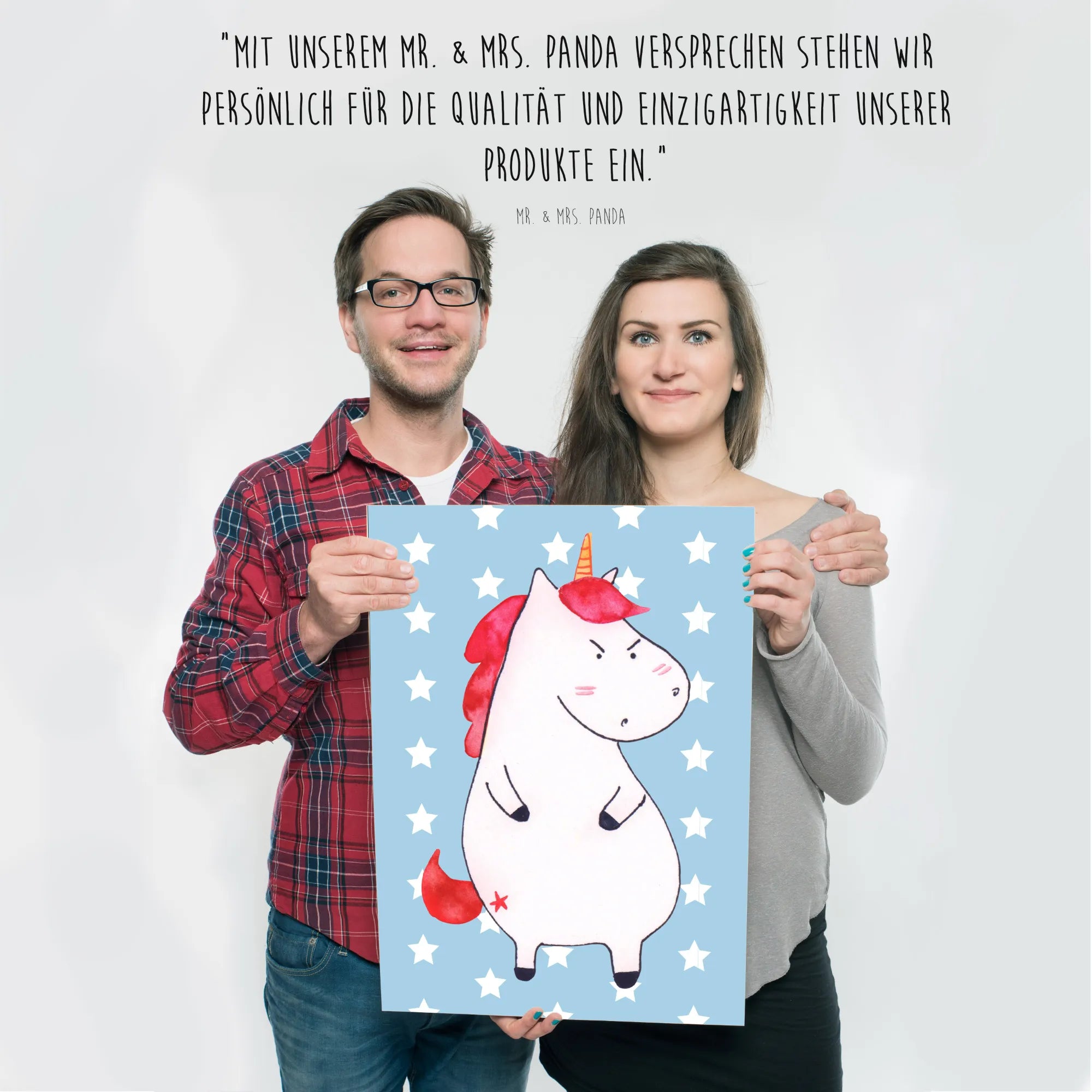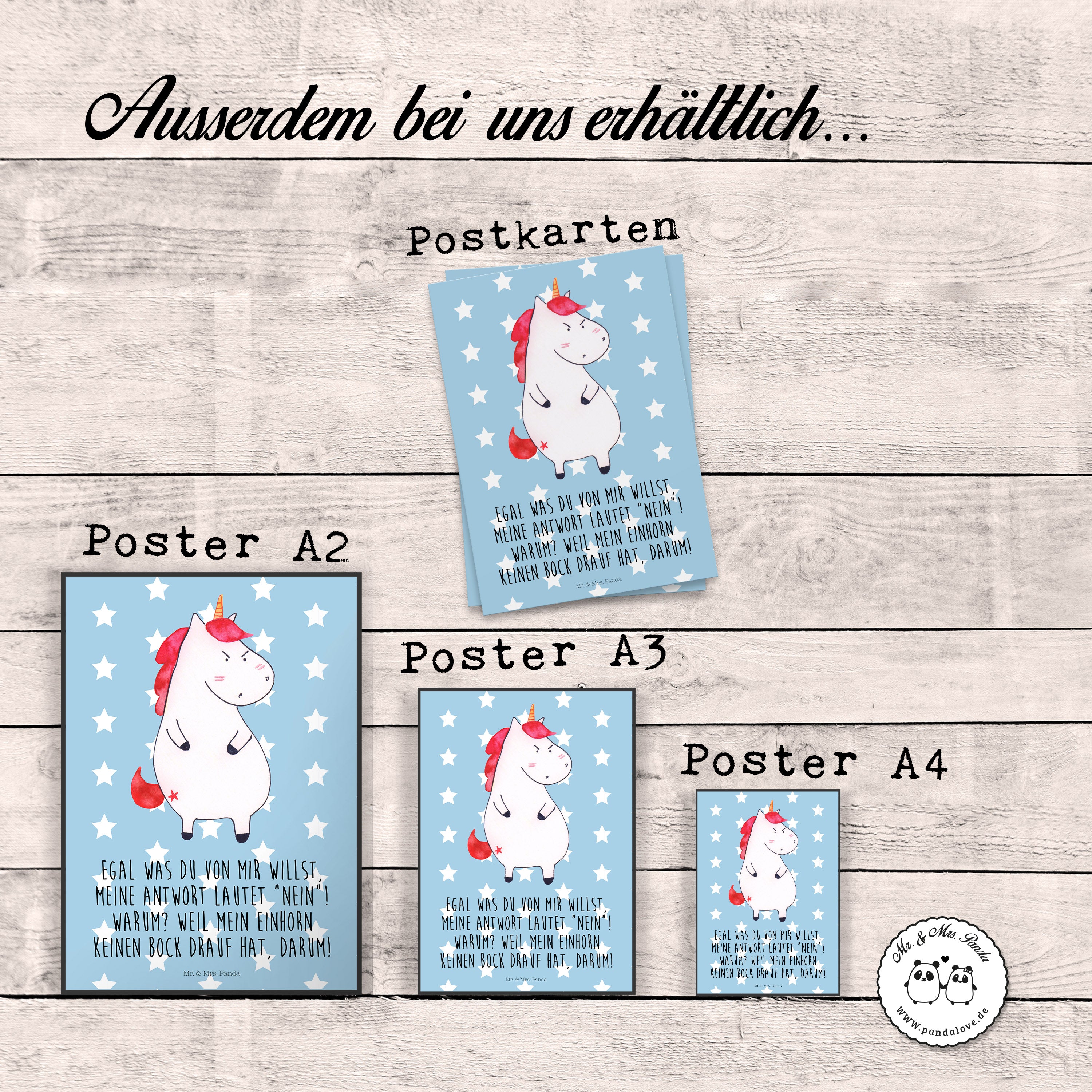 Charmant, frech und klar: Das Einhorn wütend Poster von Mr. & Mrs. Panda ist die perfekte Wanddekoration für Büro, Homeoffice oder Wohnzimmer. Das handgezeichnete Einhorn in Blau Pastell wirkt niedlich, vermittelt aber auf sympathische Weise: Heute ist keine Zeit für dumme Fragen.