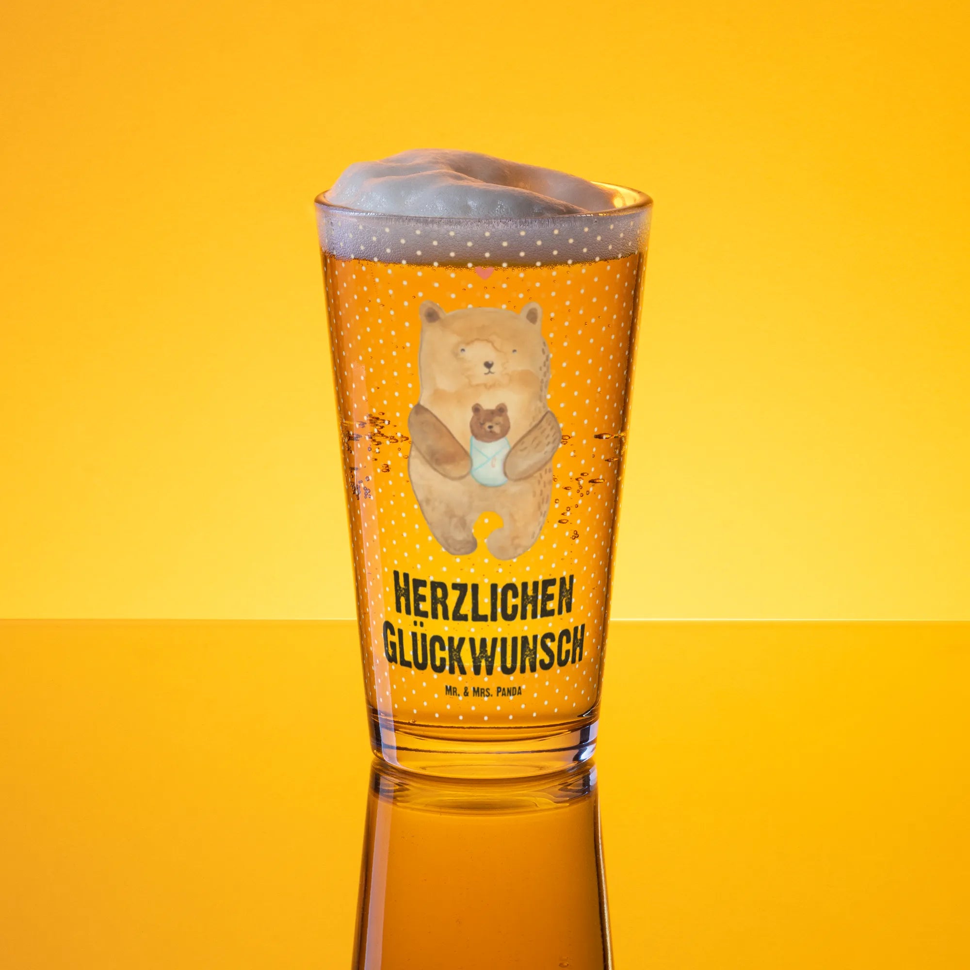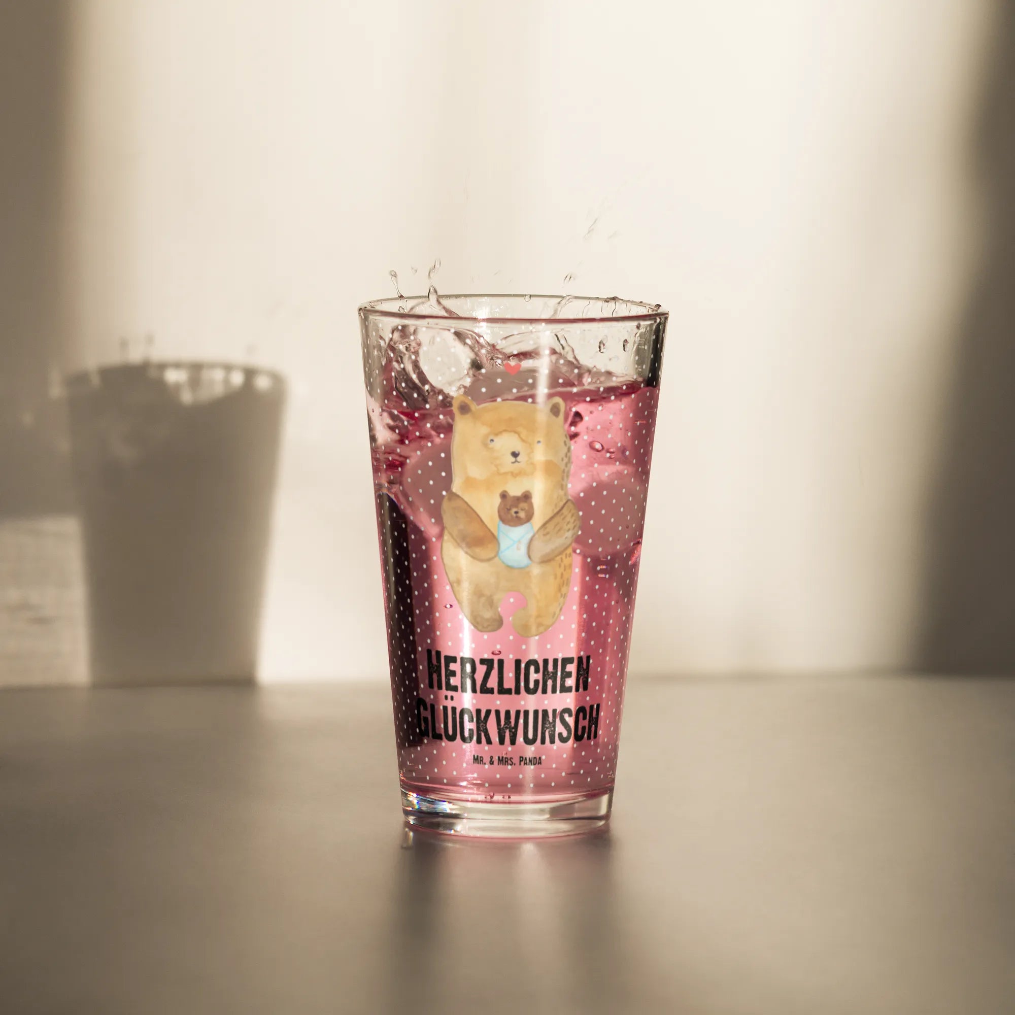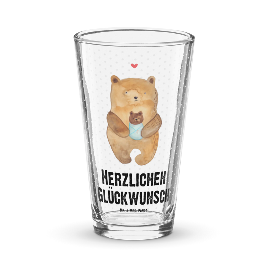 Dieses elegante Designer Trinkglas aus der Bär-Kollektion von Mr. & Mrs. Panda vereint zarte Illustration und hochwertige Verarbeitung. Das Motiv zeigt einen zärtlichen Bären, der ein Babybärchen hält, ergänzt durch den herzlichen Spruch „Herzlichen Glückwunsch“. Die handgezeichnete Aquarell-Illustration von Mrs. Panda verleiht dem Glas einen warmen, persönlichen Charakter.