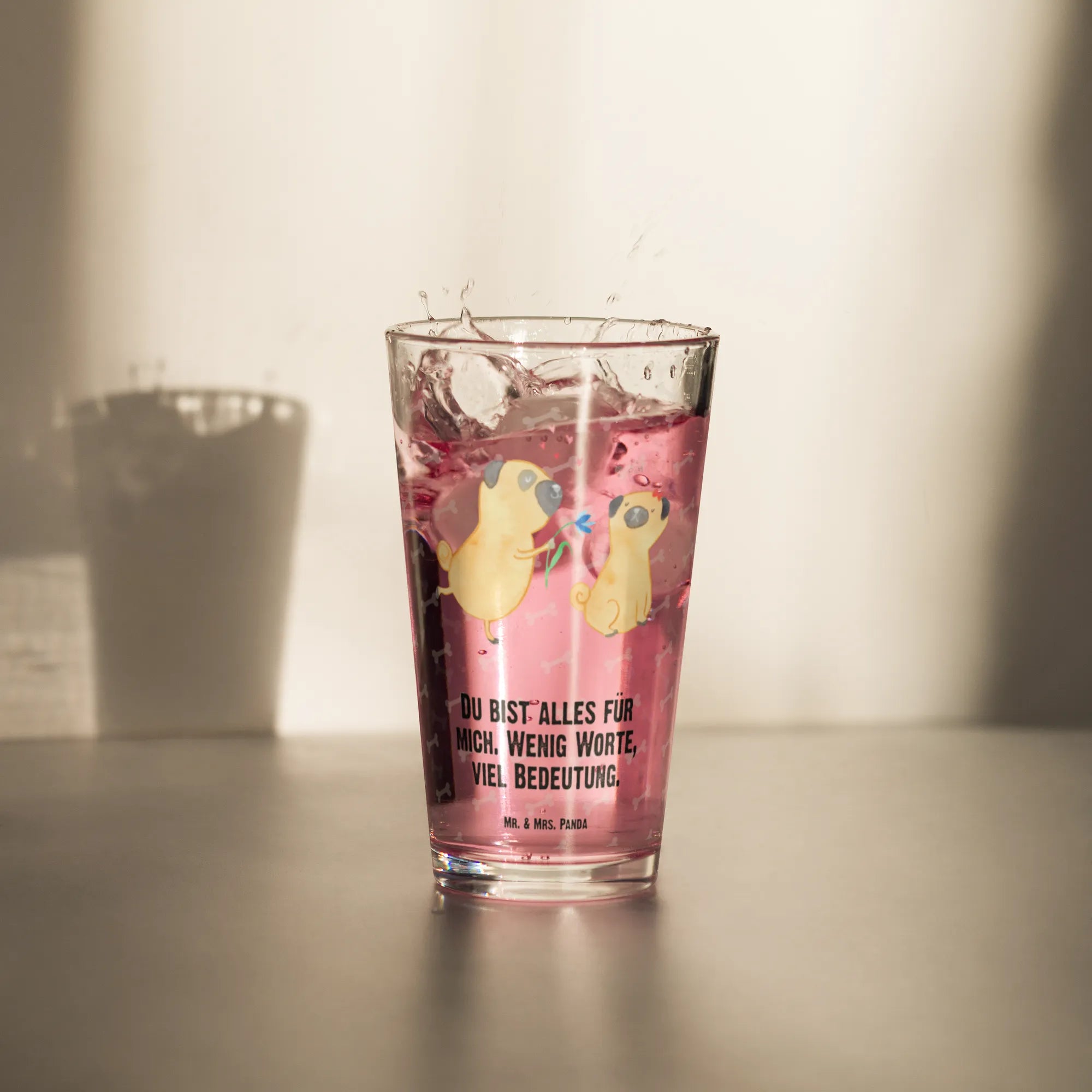 Dieses edle Designer Trinkglas aus der Hunde Kollektion vereint Zärtlichkeit und Stil: Zwei niedliche Möpse, einer schenkt dem anderen eine Blume, begleitet vom liebevollen Spruch „Du bist alles für mich. Wenig Worte, viel Bedeutung.“ Ein Geschenk, das direkt ins Herz trifft.