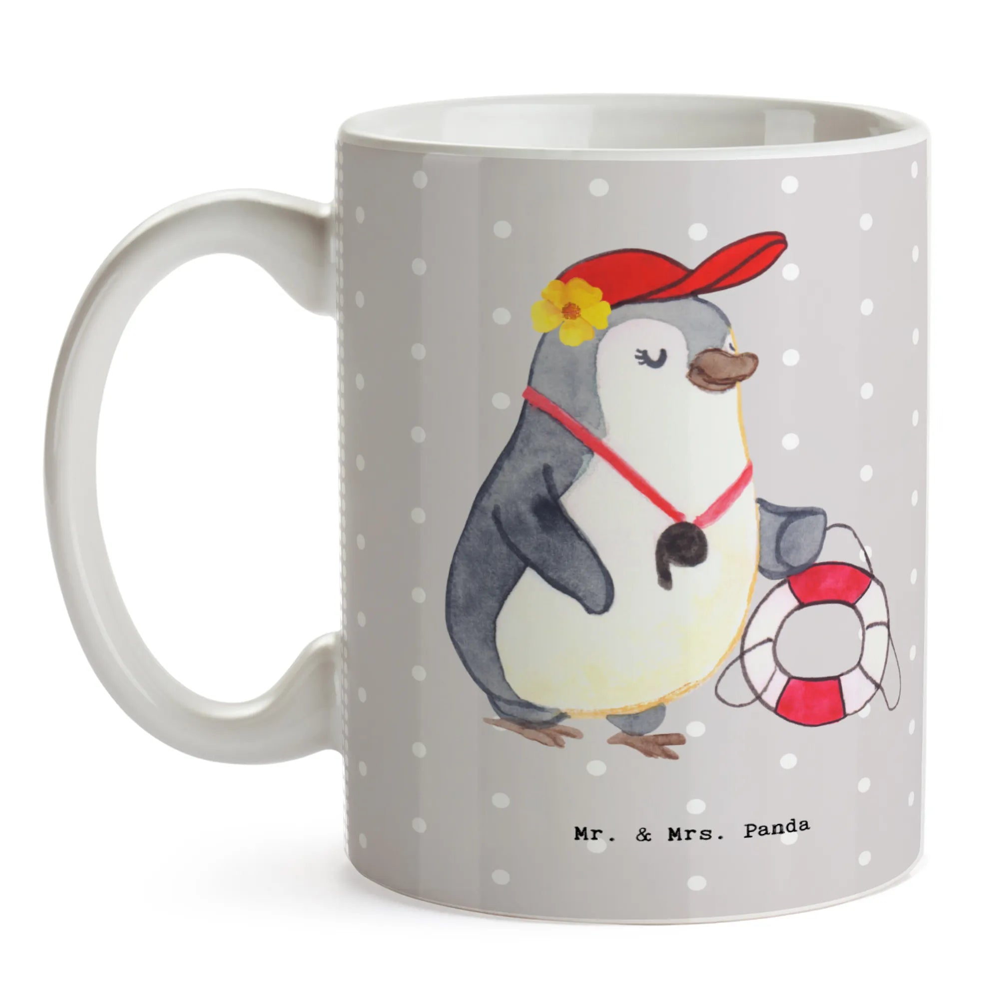 Imagine starting your day with a cozy drink in this charming mug, featuring a sweet penguin lady dressed as a lifeguard, holding a swim ring and a whistle. This adorable design encapsulates the joy and passion of being a lifeguard, making it the perfect novelty mug for both personal use and gift-giving. Ideal for occasions such as job starts, retirement celebrations, or even as a thoughtful farewell gift when someone special proudly leaves their position at the local swimming school.