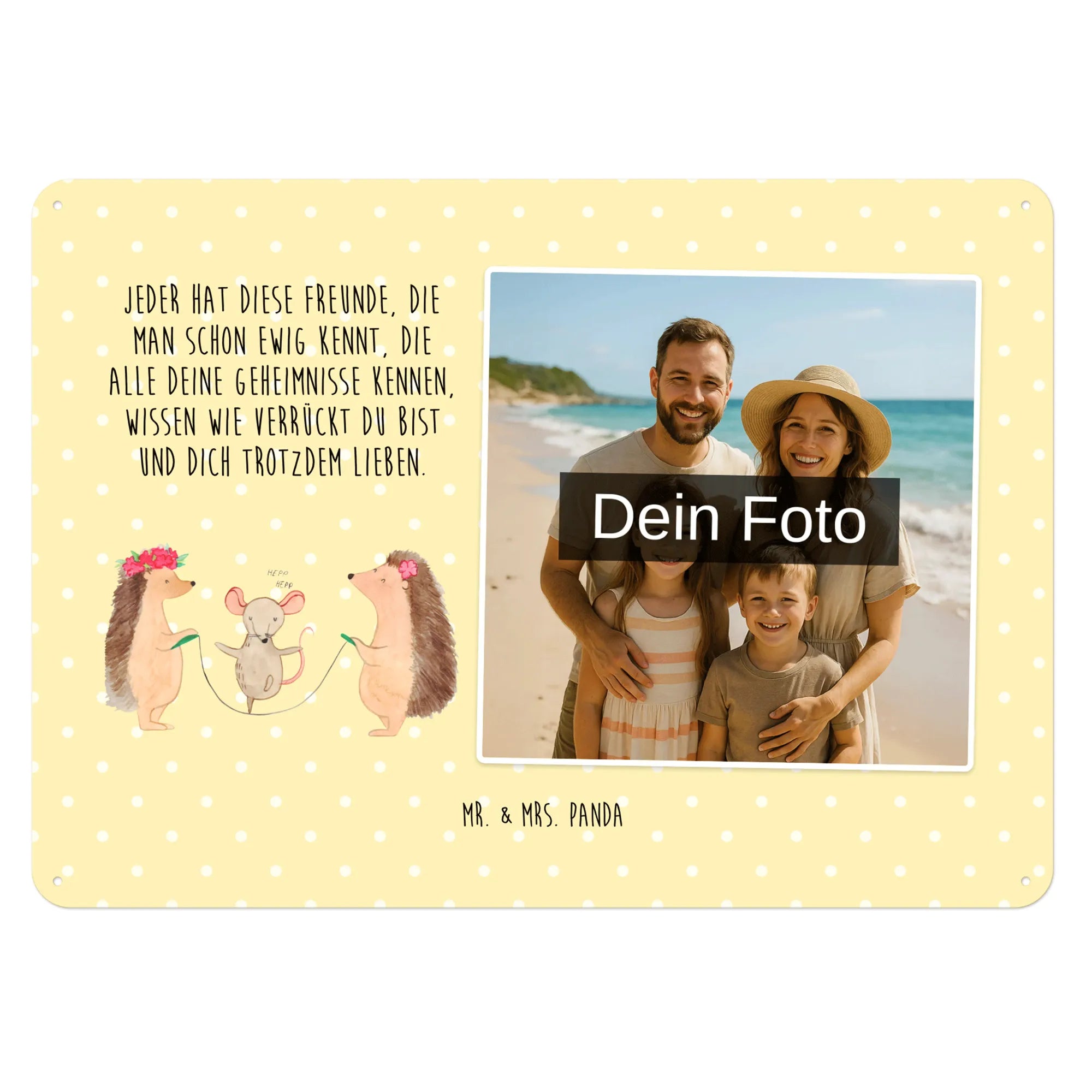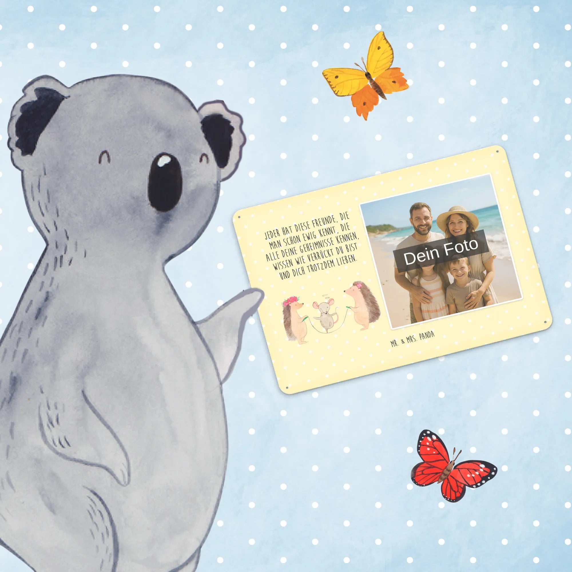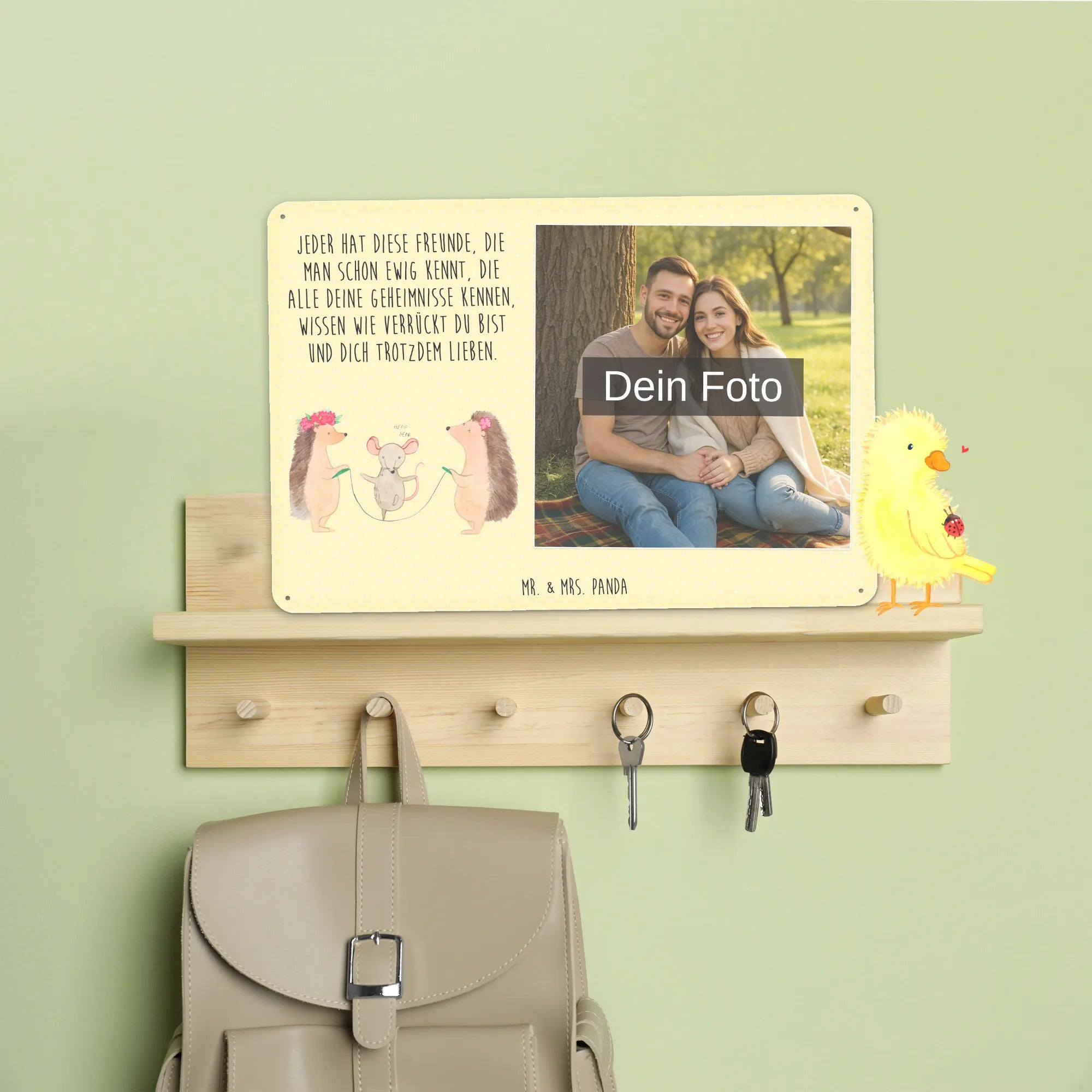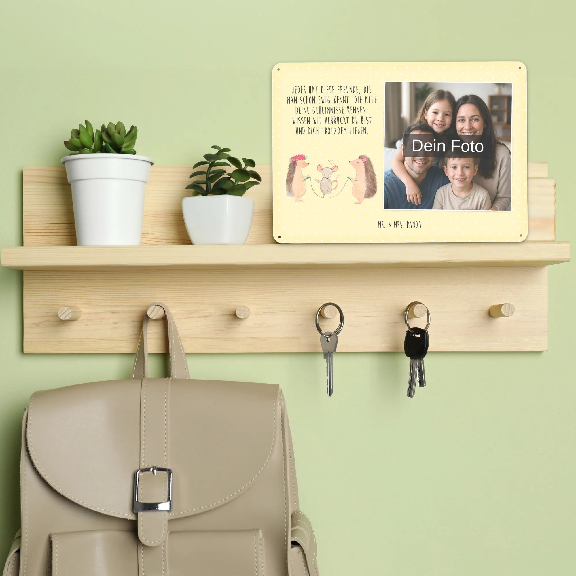 Personalisiertes Foto-Blechschild – ein liebevolles Unikat von Mr. & Mrs. Panda. Lass dein schönstes Foto zusammen mit unseren charmanten Sprüchen und Illustrationen auf hochwertigem Stahlblech verewigen. Damit das Ergebnis bezaubernd wird, achte auf eine ausreichend hohe Fotoauflösung und wähle einen passenden Bildausschnitt, damit Gesichter und Details optimal zur Geltung kommen. Verwende nur Bilder, für die du die Rechte besitzt. Das Schild ist aus edlem Stahlblech ohne Wölbung gefertigt, hat abgerundete Ecken und umgefalzte Kanten sowie eine seidenmatte Oberfläche. Maße: 70 mm x 297 mm x 210 mm. Der edle, langlebige Druck macht das Schild zur perfekten Innendekoration oder Geschenkidee. Vier Bohrungen sorgen für eine einfache und sichere Befestigung an Tür oder Wand im Innenbereich. Pflegeleicht: bei Bedarf mit einem feuchten Tuch abwischbar. Erhältlich in verschiedenen Größen, damit du genau die richtige Variante findest. Mit dem personalisierten Foto-Blechschild von Mr. & Mrs. Panda schenkst du ein Stück Herzenswärme, das lange Freude macht.