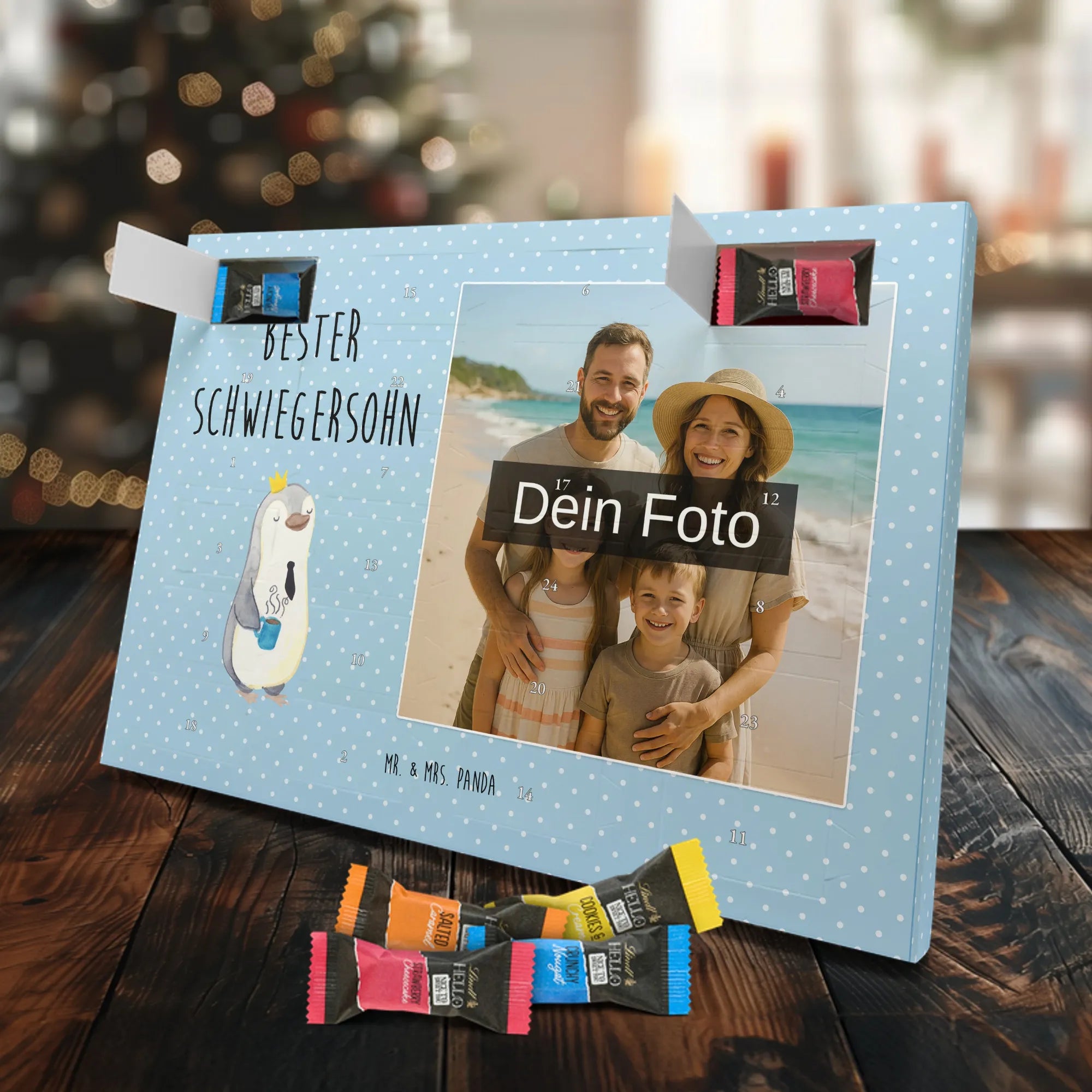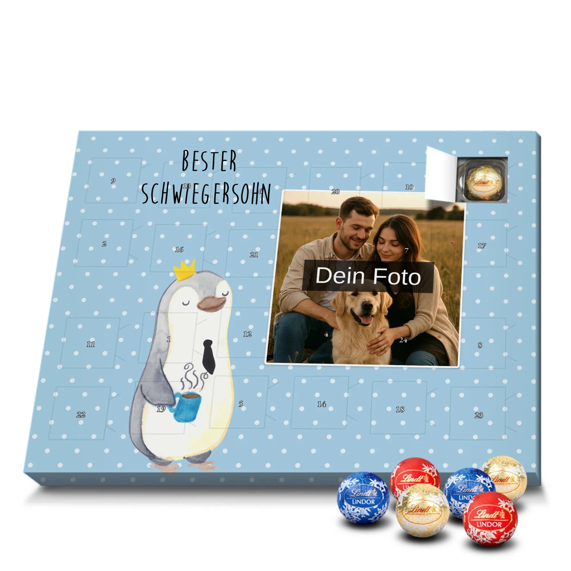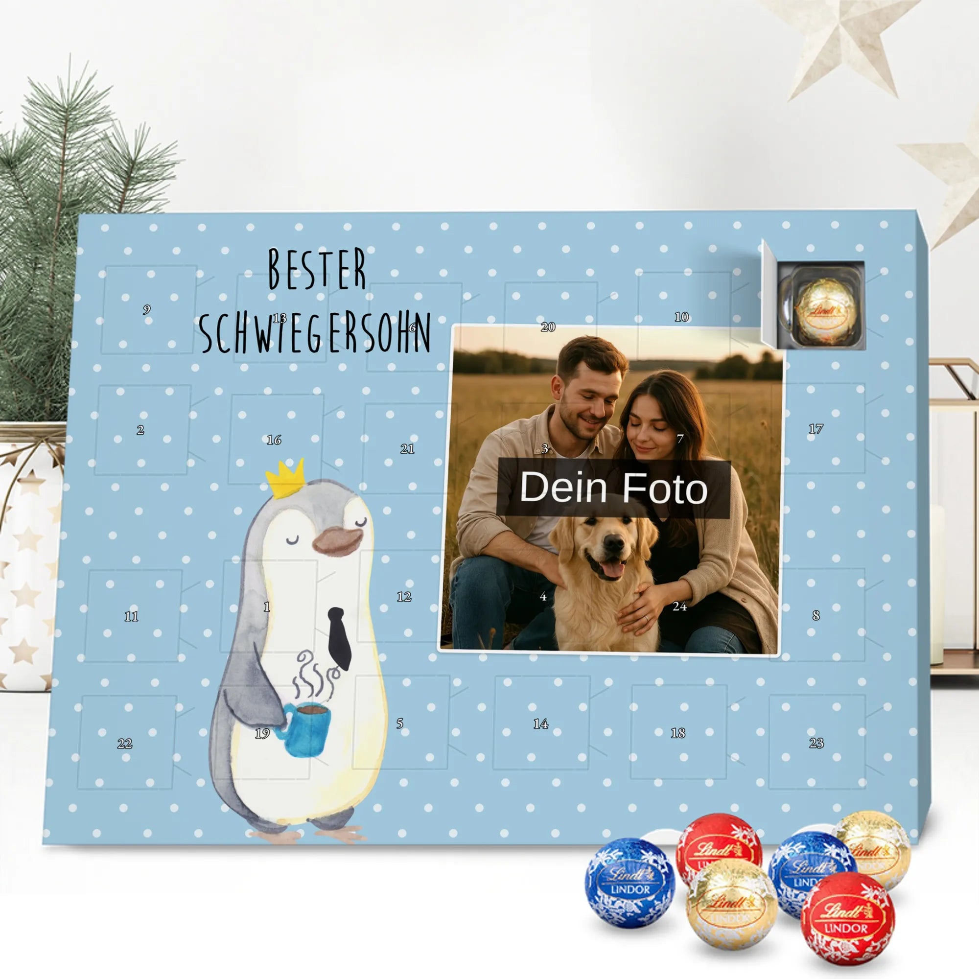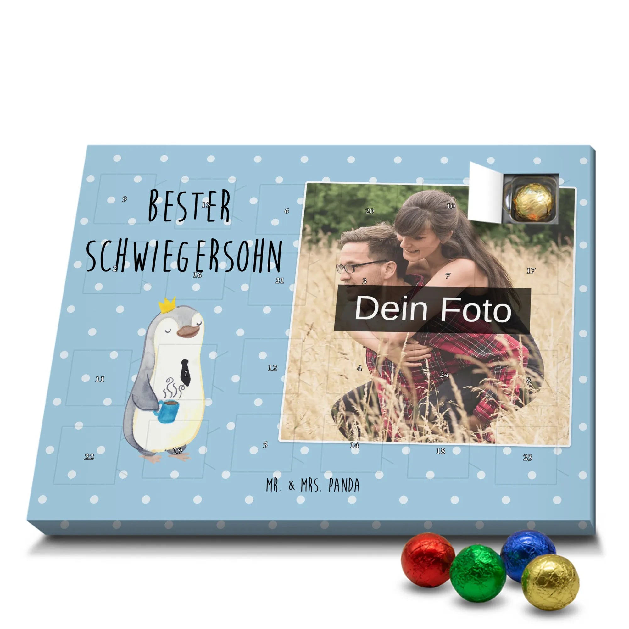 Discover the magic of waiting for Christmas with our exclusive Personalized Chocolate Photo Advent Calendar from Mr. & Mrs. Panda. This unique gift can be personalized with your own photo and is surrounded by beautiful designs and quotes. Enjoy a high-quality chocolate sphere in a variety of colors each day during the Advent season, while the silver sheen of the photo print in brilliant quality enchants your room. Perfect for capturing special moments and enhancing the anticipation of Christmas.