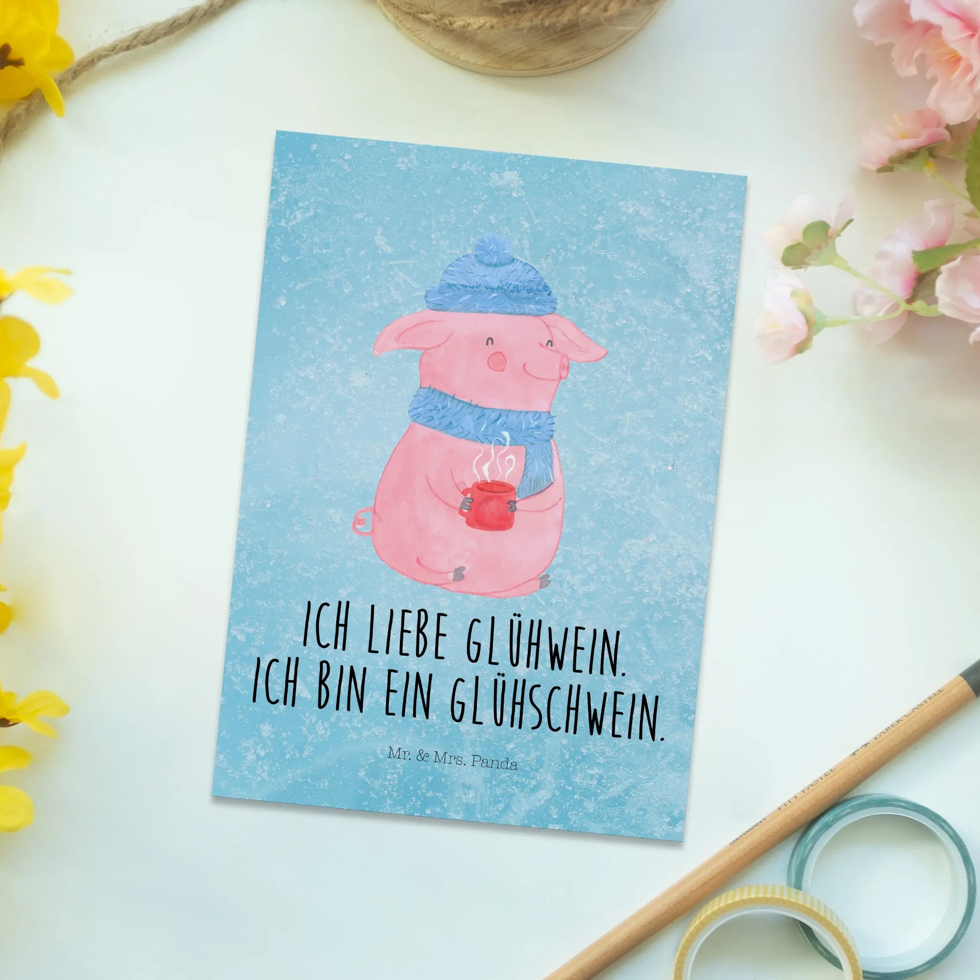 Picture a cozy winter day at the Christmas market, where the air is filled with the sweet scent of spices and warm happiness. Our beloved mulled pig, dressed snugly in its blue hat and matching scarf, proudly holds a steaming cup of mulled wine, radiating warmth and joviality. This charming piglet embodies the festive spirit of winter, making you want to cuddle up with a warm drink and enjoy the delightful camaraderie of the season. The saying 'Ich liebe Glühwein. Ich bin ein Glühschwein.' captures the essence of this joyful scene, inviting you to embrace the warmth and cheer of winter festivities alongside our lovable pig.