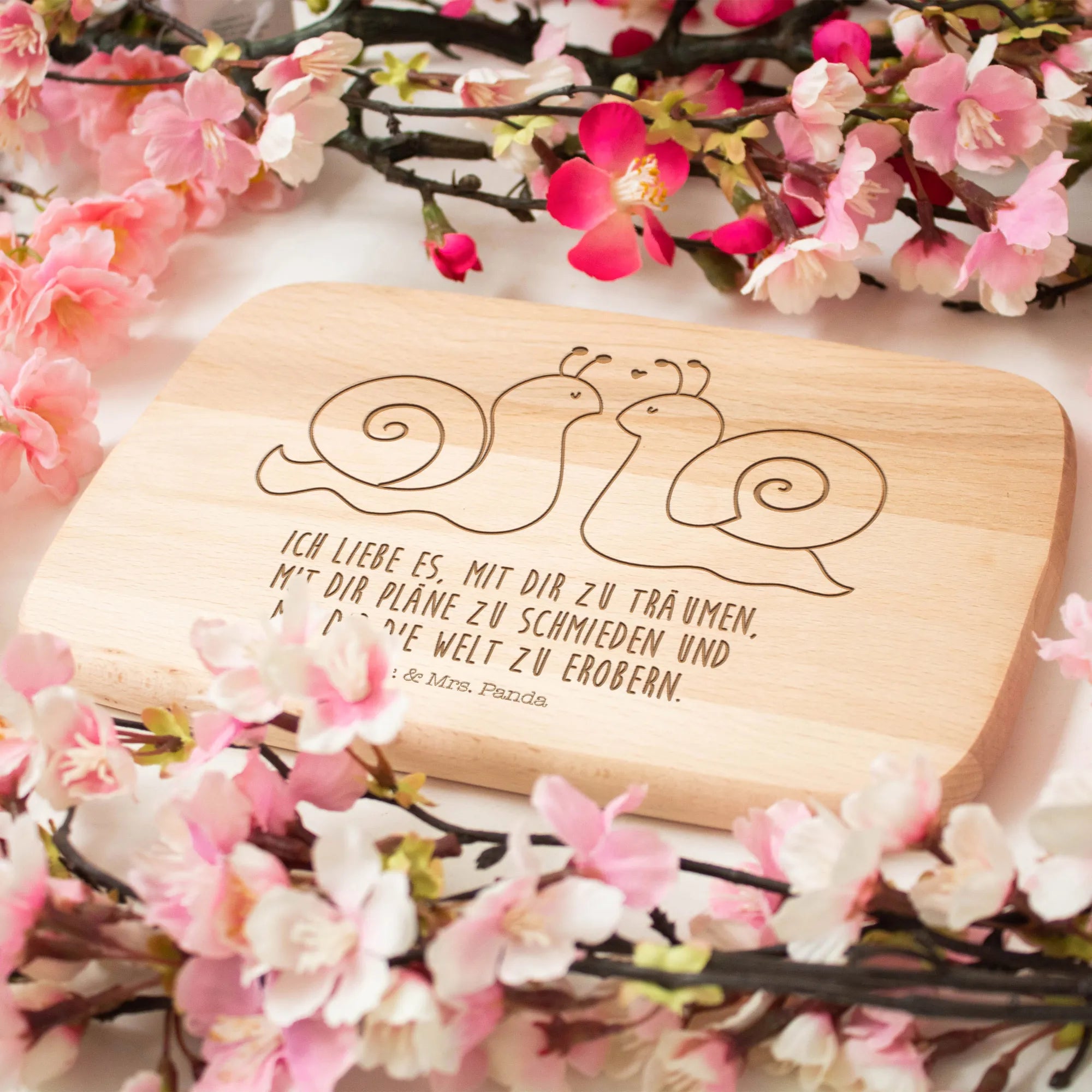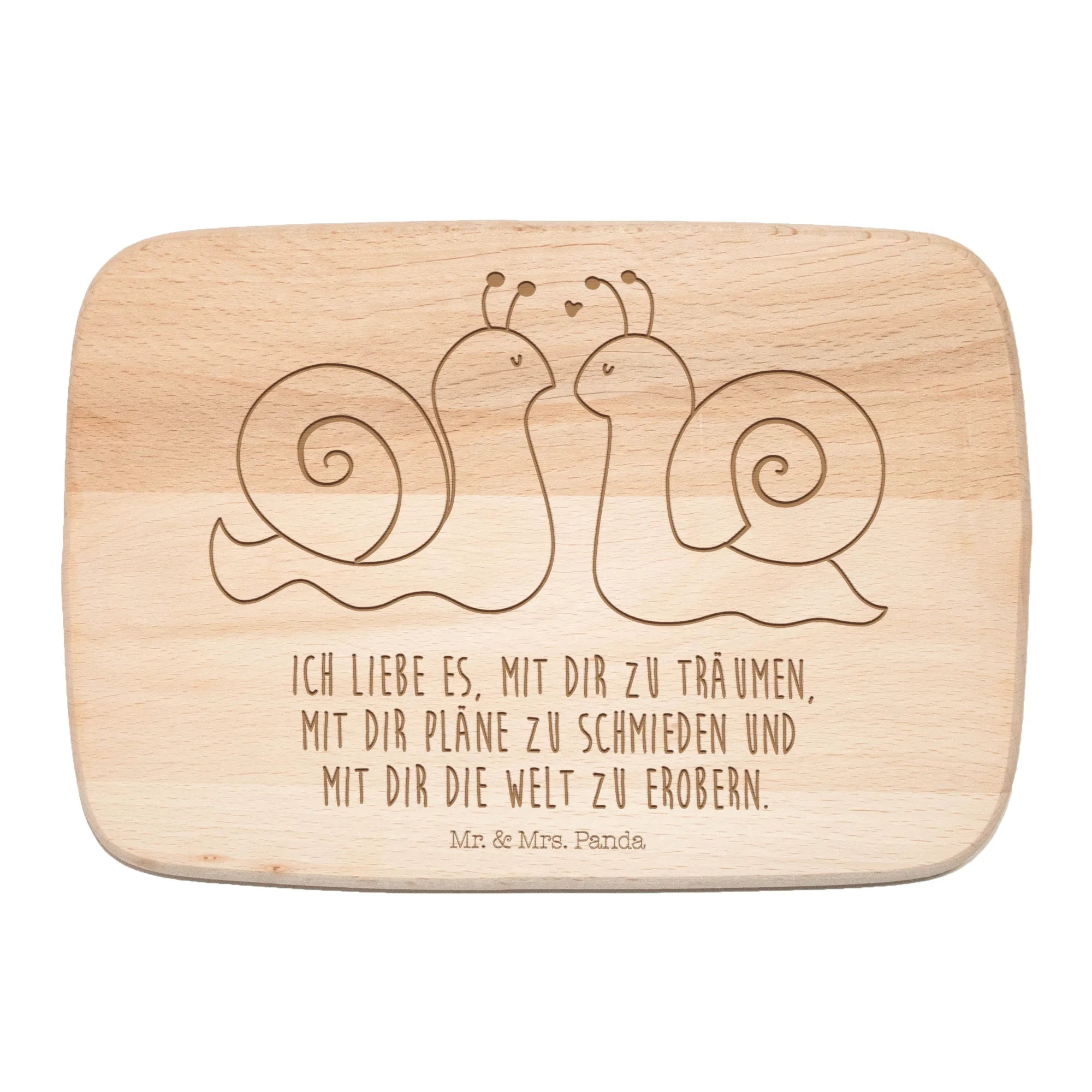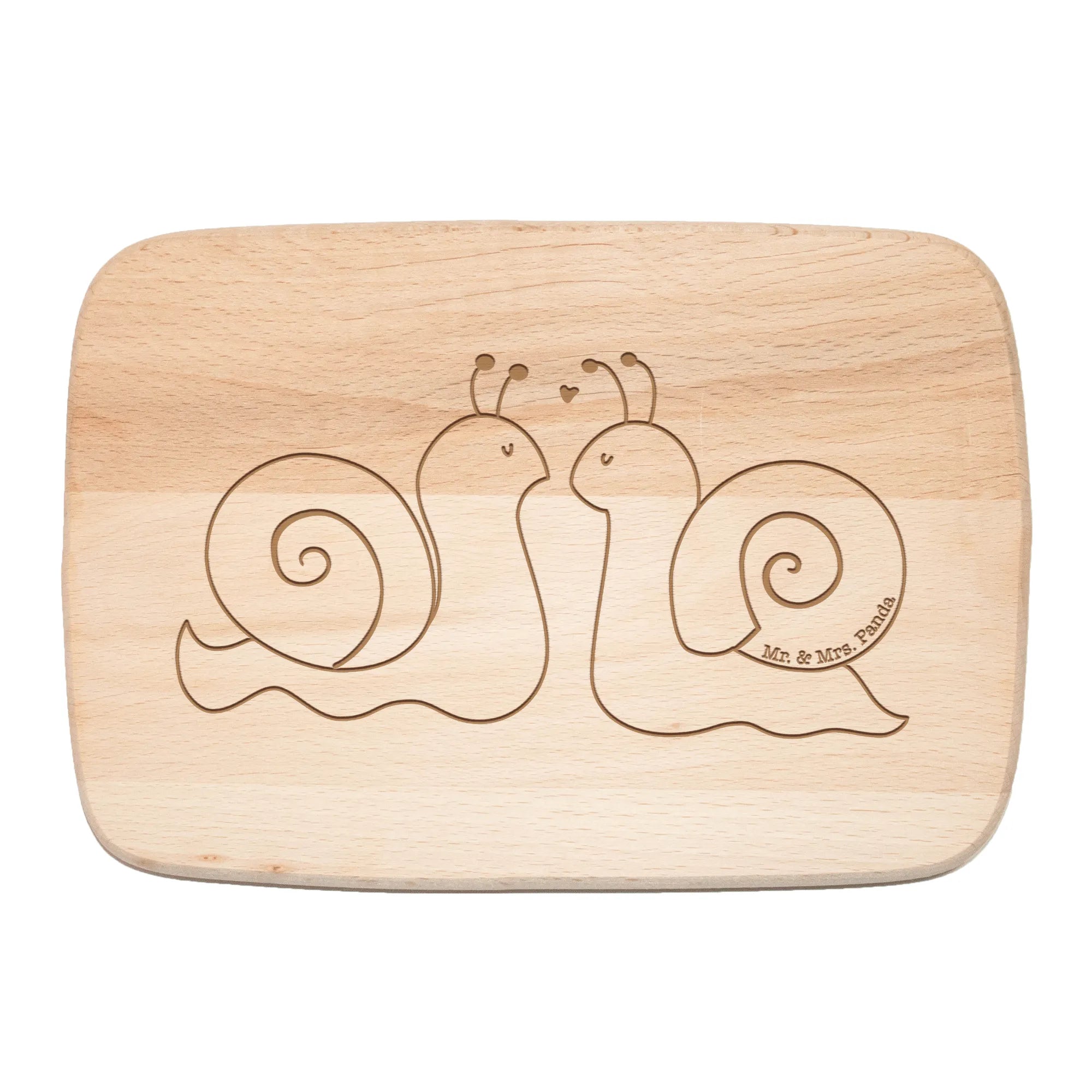 Perfectly crafted from high-quality FSC-certified beech wood, this serving board features a charming illustration of two adorable stylized snails, gazing at each other with affection. Their beautiful shells, adorned with intricate spiral patterns, and the two little red hearts floating above them perfectly symbolize love and connection.