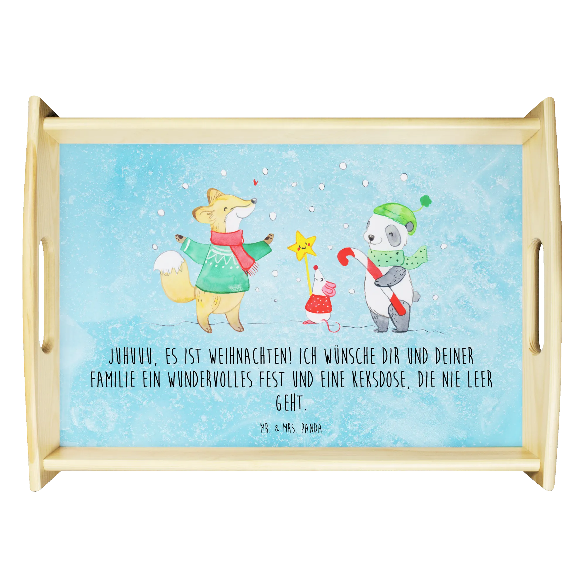 Zauberhafte Weihnachtsstimmung für dein Zuhause: Unser Serviertablett „Winter Weihnachtsfreude“ von Mr. & Mrs. Panda zeigt einen fröhlichen Fuchs, eine Maus und einen Panda im Schal, die im Schnee die Vorfreude auf Weihnachten teilen. Dazu gehört der liebevolle Spruch: „Juhuuu, es ist Weihnachten! Ich wünsche dir und deiner Familie ein wundervolles Fest und eine Keksdose, die nie leer geht.“ Dieses Tablett vereint liebevolles Design mit funktionaler Alltagstauglichkeit.