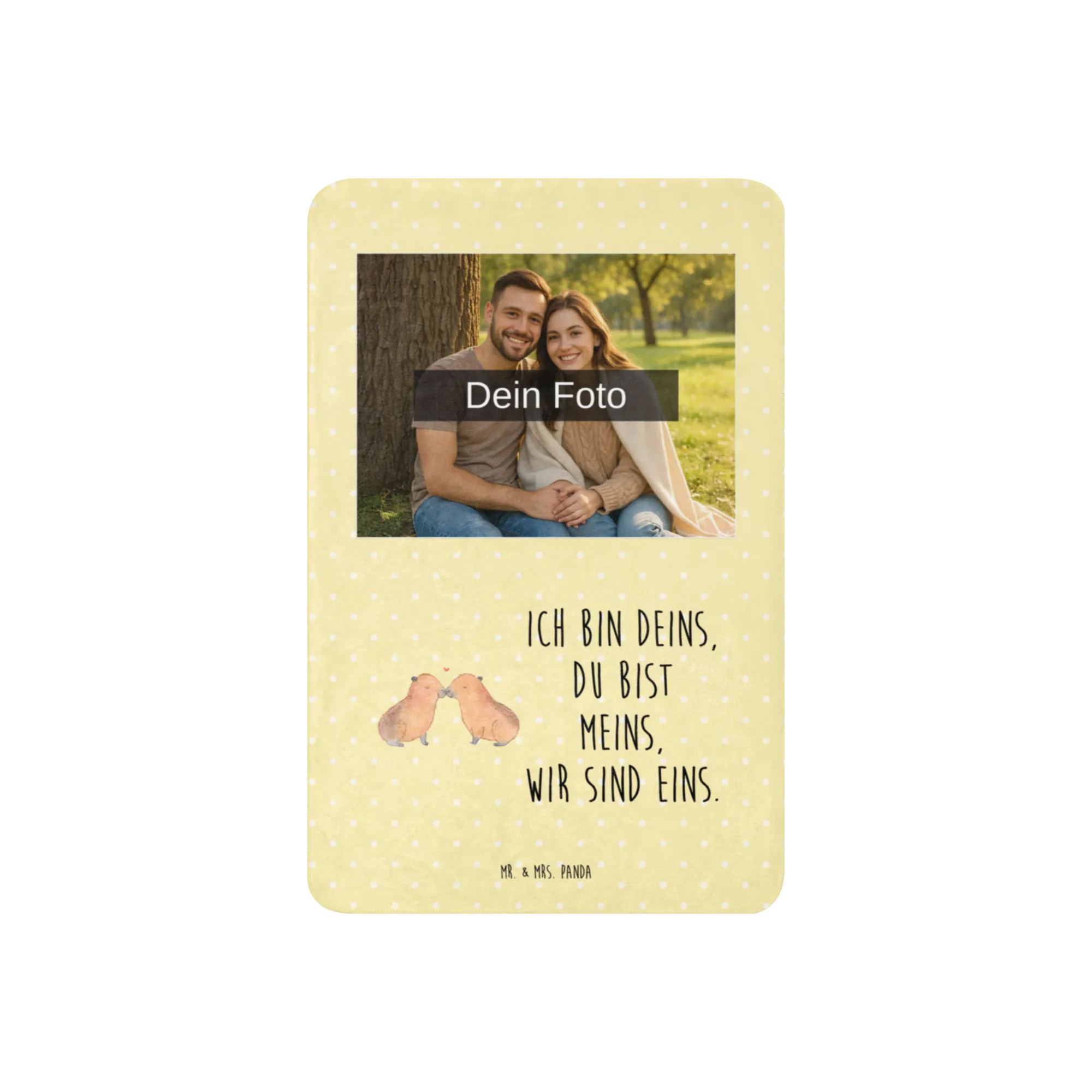 Die herzerwärmende Darstellung von zwei Capybaras auf diesem bezaubernden Motiv von Mr. & Mrs. Panda zeigt die Zuneigung auf wundervolle Weise. Sie berühren sich sanft an der Nase, sodass sich ihre Schnauzen zu einem herzförmigen Muster formen. Über ihnen schwebt ein kleines, rotes Herz, das ihre Liebe wunderschön symbolisiert. Die handgezeichneten pelzigen Gefährten sind in sanften Brauntönen gehalten und strahlen Gelassenheit und Freude aus. Mit dem berührenden Spruch 'Ich bin deins, du bist meins, wir sind eins.' vermittelt dieses Motiv eine tiefe Botschaft der Liebe und Einheit und ist daher die perfekte Geschenkidee für Verliebte und Romantiker, sei es zum Jahrestag, Valentinstag oder einfach als Liebesbeweis.