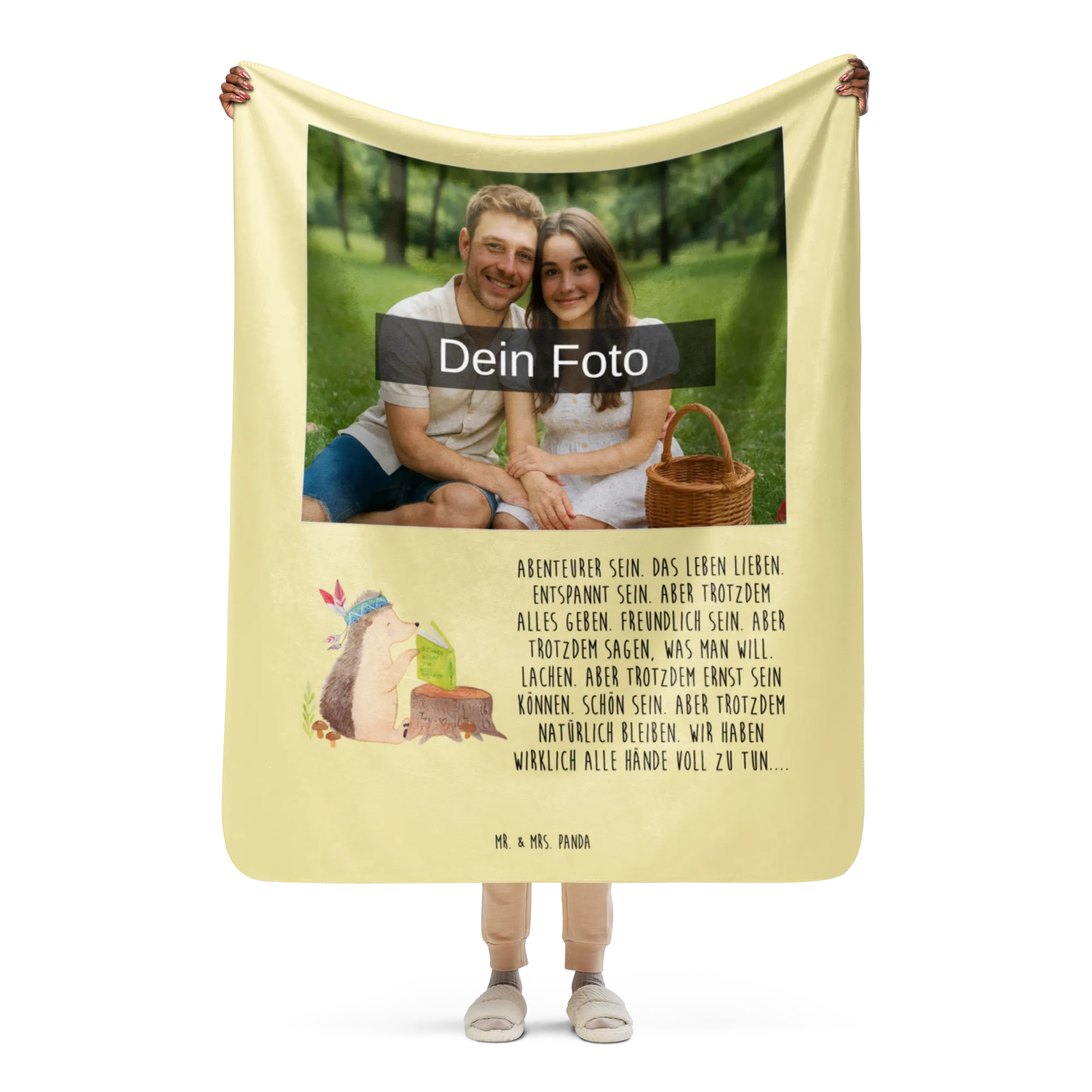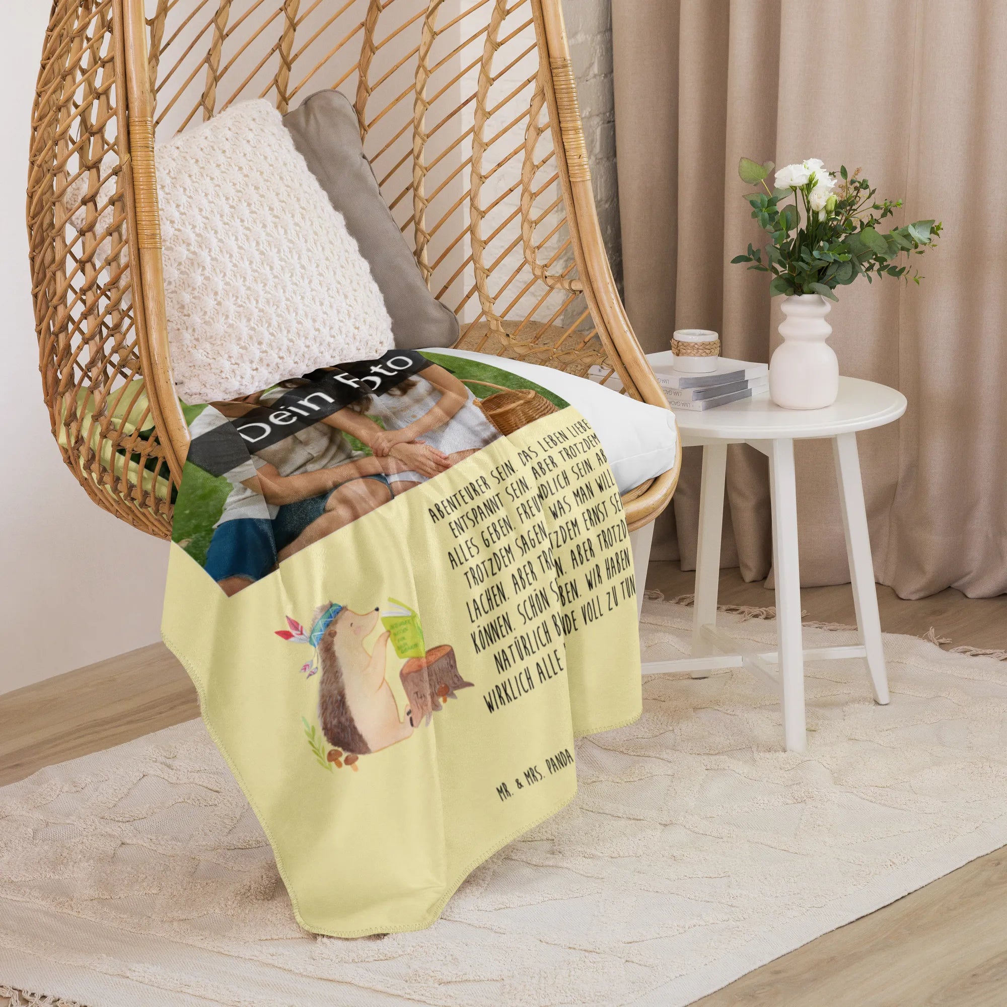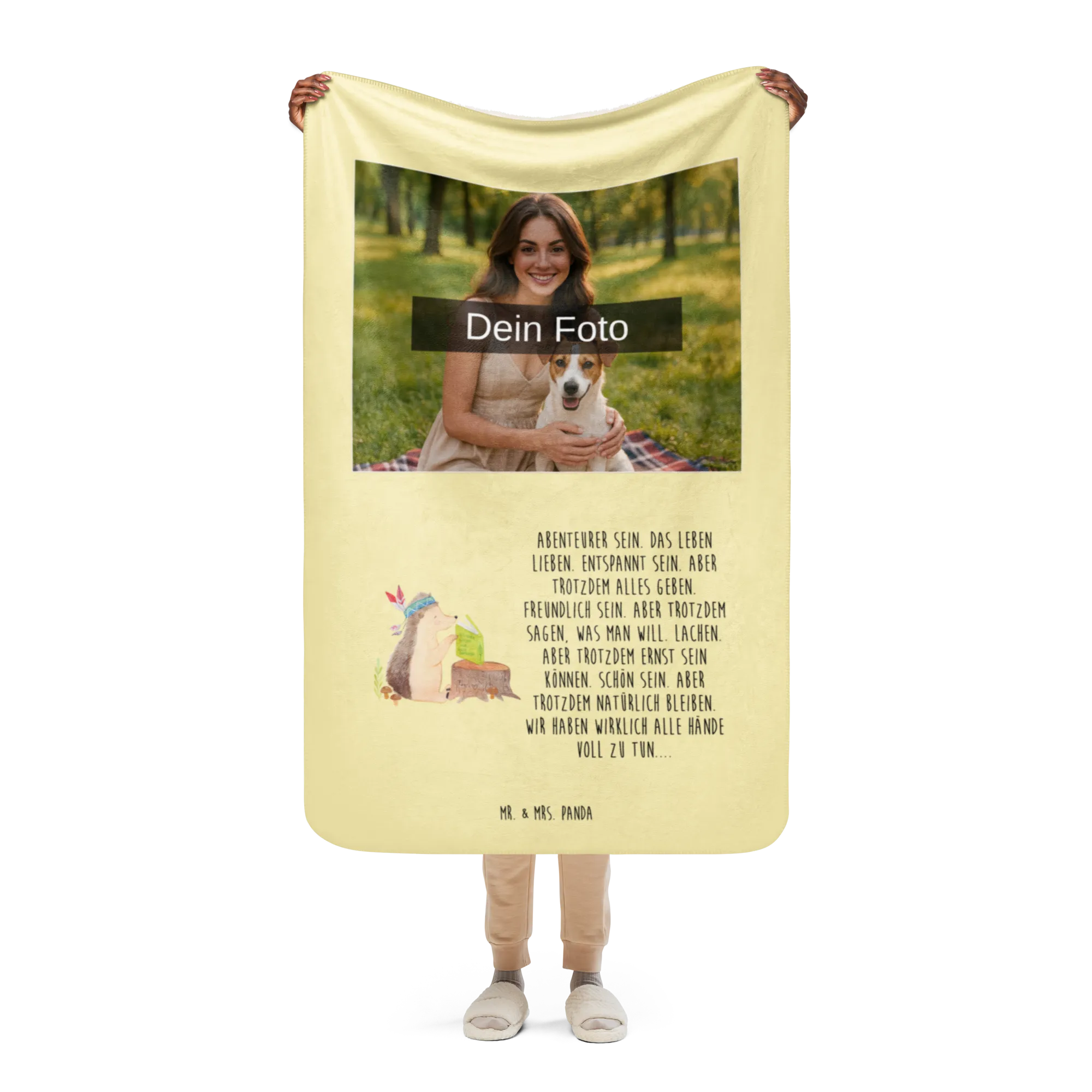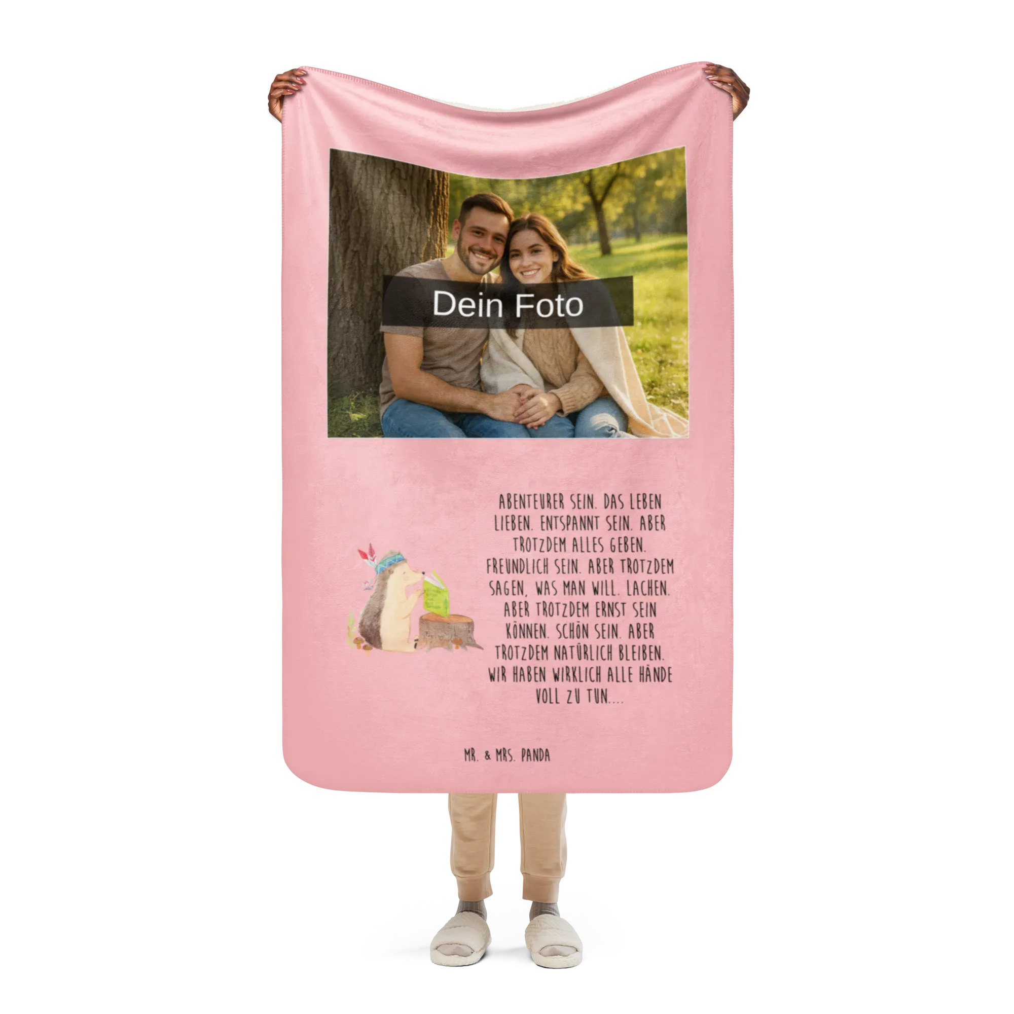 Erlebe die warme Umarmung unserer Sherpa Foto Kuscheldecke von Mr. & Mrs. Panda! Mit einer großzügigen Größe von 1300 mm x 1550 mm bietet sie ausreichend Platz, um dich darin einzukuscheln. Die Decke besteht aus 100 % ultrweichen Polyesterfasern, die perfekt in 51,5 % glattem Obermaterial und 48,5 % kuscheligem Sherpa unterteilt sind. Das Anfassgefühl ist einfach himmlisch! Mit einer Stoffstärke von 220 g/m² und 240 g/m², ist diese Decke nicht nur funktional, sondern auch ein optisches Highlight in jedem Raum. Ihre leuchtenden Farben und das liebevolle Design mit Sprüchen und Motiven von Mr. & Mrs. Panda verleihen jedem Moment magische Momente. Perfekt für gemütliche Filmabende oder entspannende Stunden zu Hause. Vergiss nicht, die Decke vor der ersten Nutzung zu waschen, um ihre volle Pracht zu genießen!