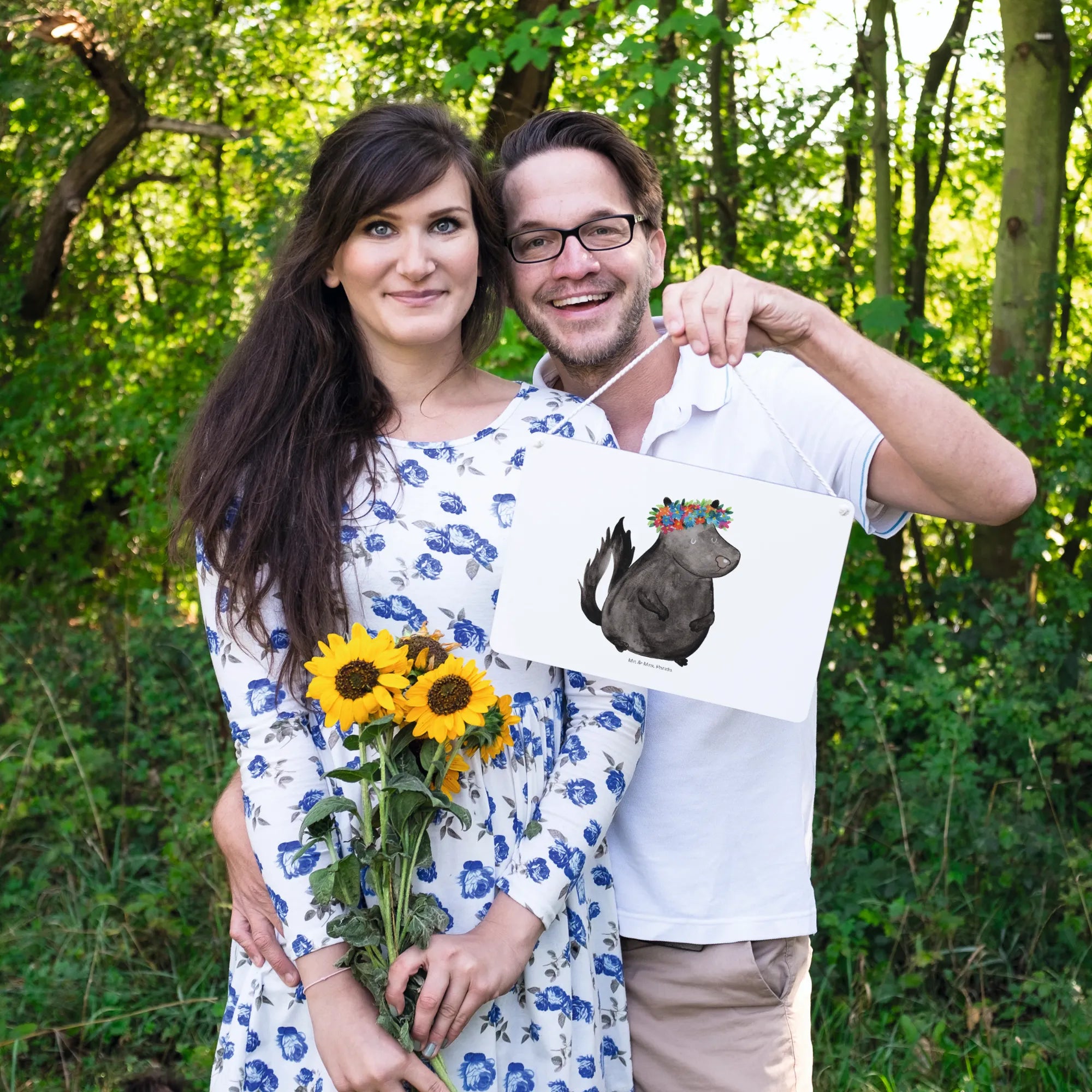 Das Deko Schild "Stinktier Blumenmädchen" von Mr. & Mrs. Panda ist der perfekte Begleiter für dein Zuhause. Mit einem charmanten Design, das ein süßes Stinktier mit einem bunten Blumenkranz zeigt, bringt es fröhliche Naturverbundenheit in jeden Raum.