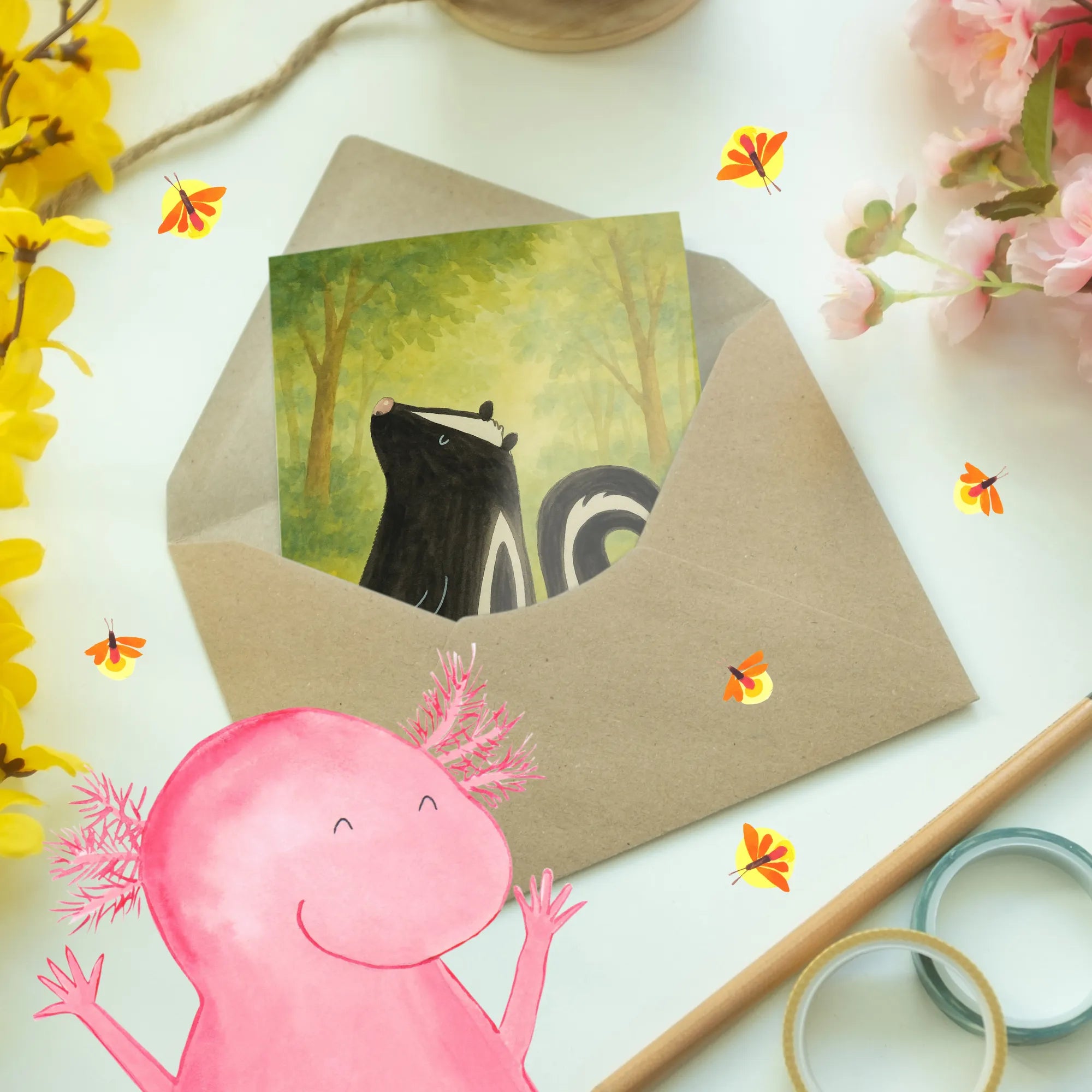 Meet our charming skunk, sitting contentedly in all its wild glory. This adorable little creature is more than just a stinker; it's a representation of individuality and self-love. In the office or at home, this delightful motif reminds you to embrace your uniqueness and to not take life too seriously. Whether you're a know-it-all lawyer, a wild adventurer, or simply someone who appreciates the beauty of nature, this skunk brings a splash of joy to the everyday grind. With its subtle yet striking watercolor details, this motif captures the spirit of self-acceptance and warmth. So, next time you're feeling a bit too conventional, remember our stinky friend, and let it inspire you to express your true self.