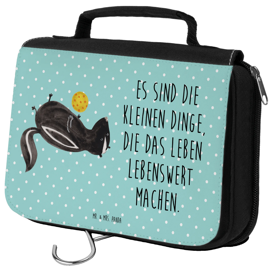 The adorable skunk motif, a playful creation of Mrs. Panda, adds a light-hearted charm to your travel gear. Imagine this sweet skunk merrily playing with a ball, reminding you to enjoy the little moments in life, just like our slogan says: "Es sind die kleinen Dinge, die das Leben lebenswert machen." This design pays homage to Mr. Flower, Mrs. Panda's beloved pet, making it a sentimental piece that adds a unique story to your travels.