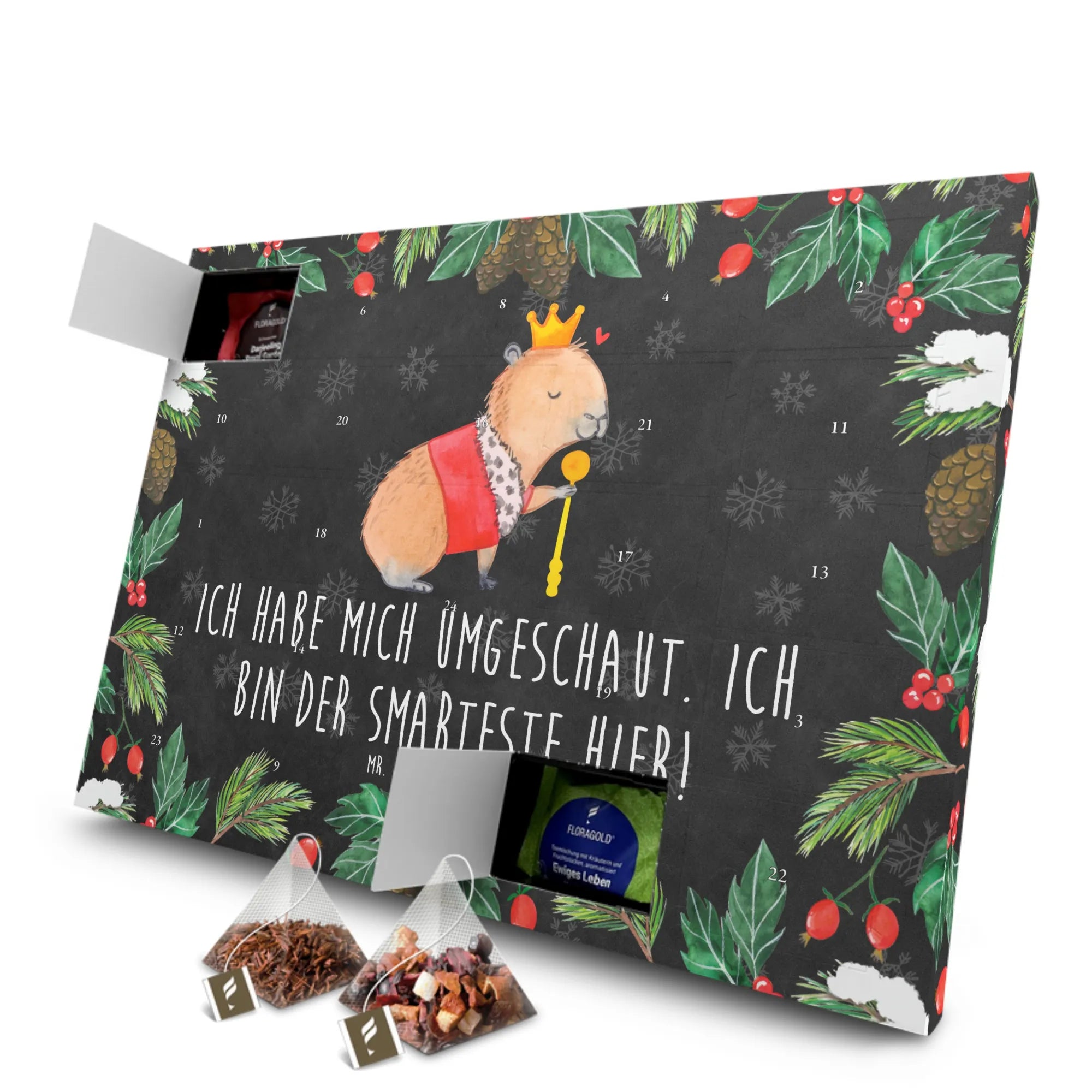 Meet our regal friend, the Capybara King! This charming creature, adorned with a golden crown and a splendid purple cloak trimmed with soft white fur, embodies tranquility and authority. He sits contentedly, his eyes gently closed, while holding his golden scepter firmly in his paw. A small red heart floats nearby, a symbol of his loving essence. This motif beautifully captures the essence of royalty while reminding us that true nobility comes from within. As our Capybara King wisely states, 'Ich habe mich umgeschaut. Ich bin der Smarteste hier!' – a gentle nudge to recognize our own unique wisdom.