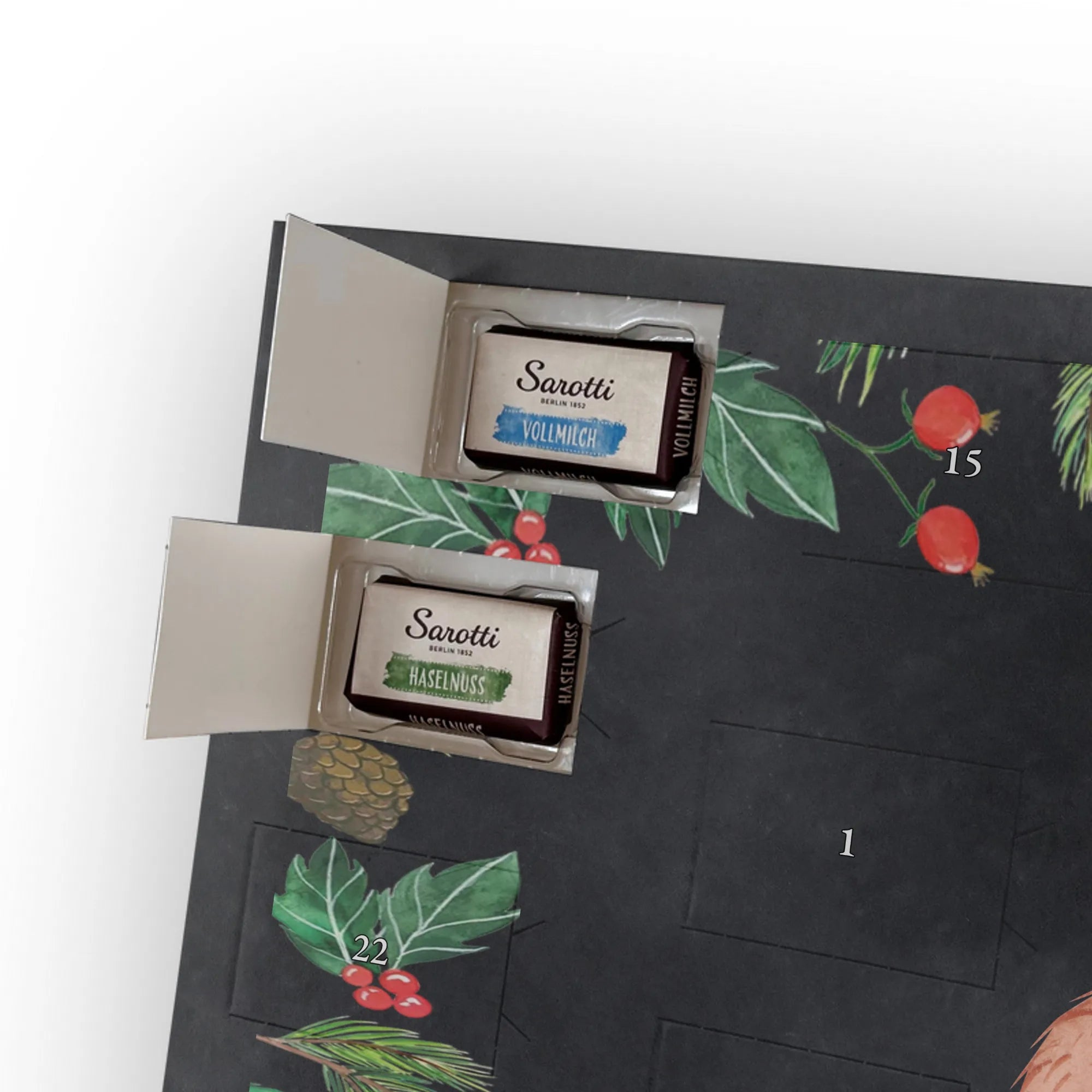 This handy advent calendar 2020 from Mr. & Mrs. Panda is really something very special - it is decorated with wonderful motifs and has the size 24m x 18cm x 2,5cm. It is filled with 24 chocolate balls and costs 14,90€ - the calendar can be hung up or set up using the set-up function on the back. Please note that we also have a larger calendar with delicious chocolate from Hello Lindt.