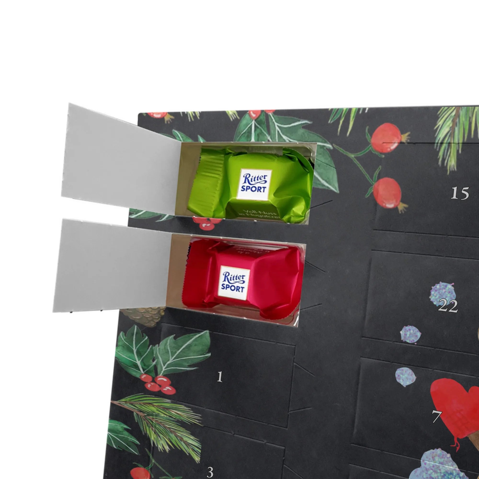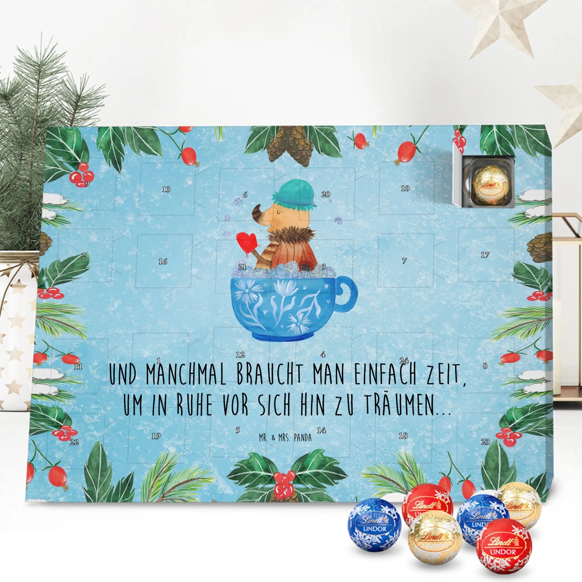 This handy advent calendar 2020 from Mr. & Mrs. Panda is really something very special - it is decorated with wonderful motifs and has the size 24m x 18cm x 2,5cm. It is filled with 24 chocolate balls and costs 14,90€ - the calendar can be hung up or set up using the set-up function on the back. Please note that we also have a larger calendar with delicious chocolate from Hello Lindt.