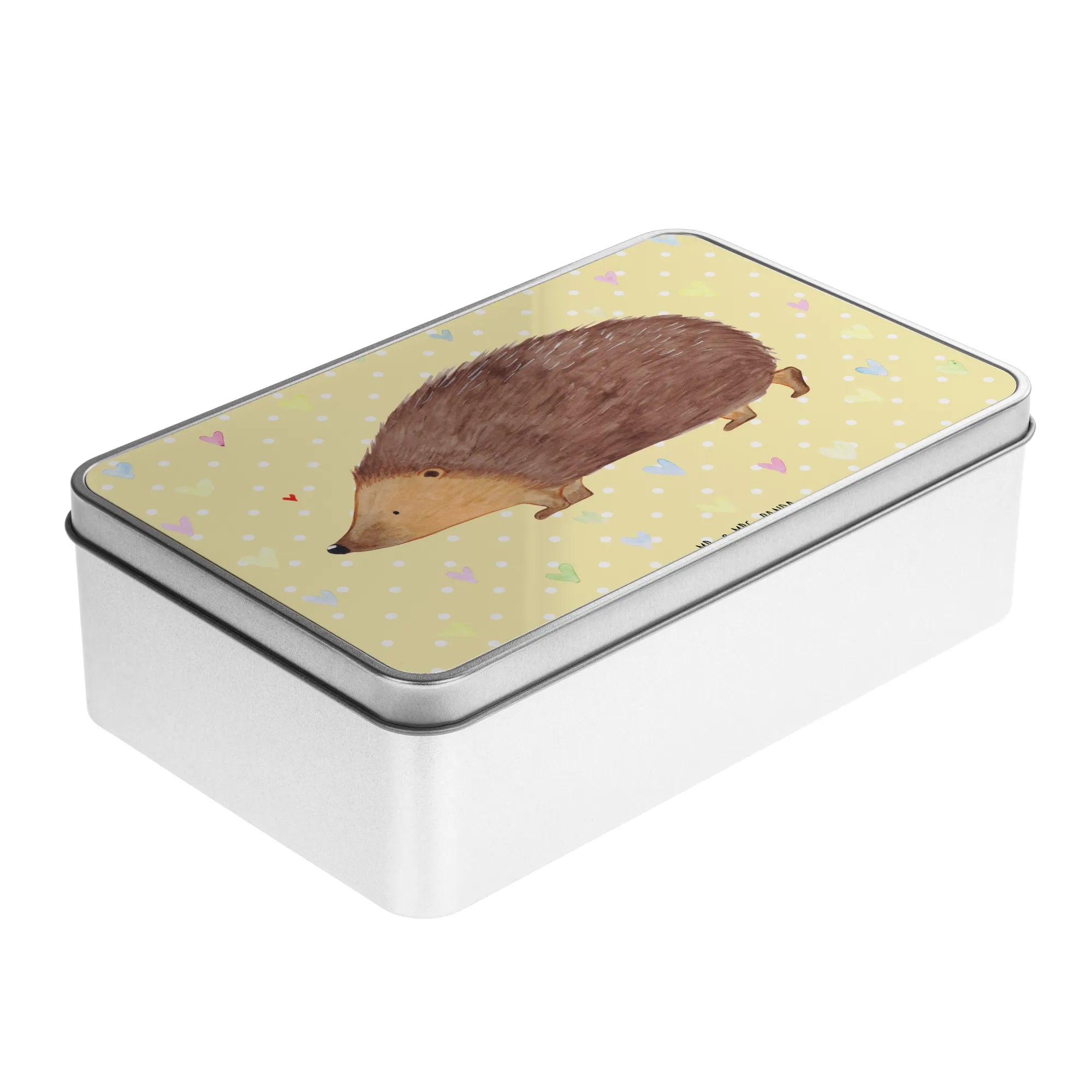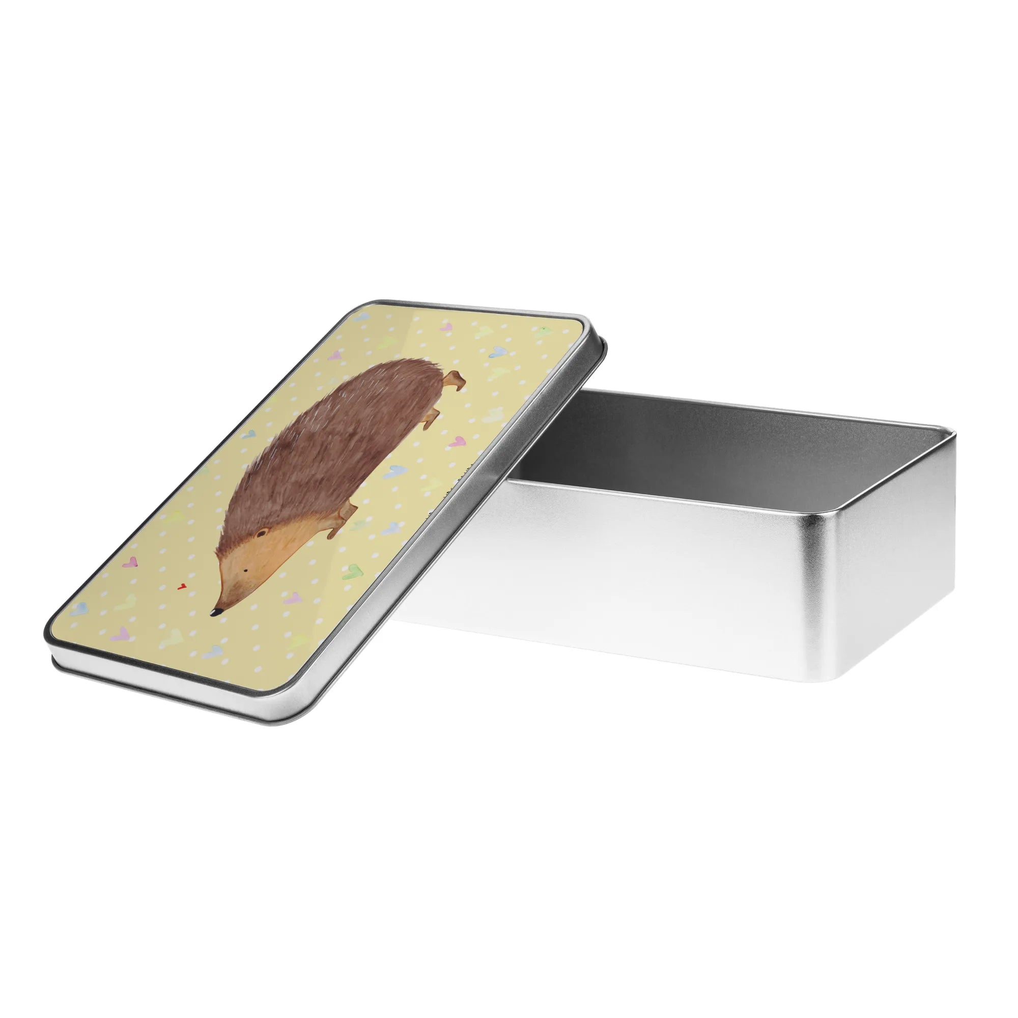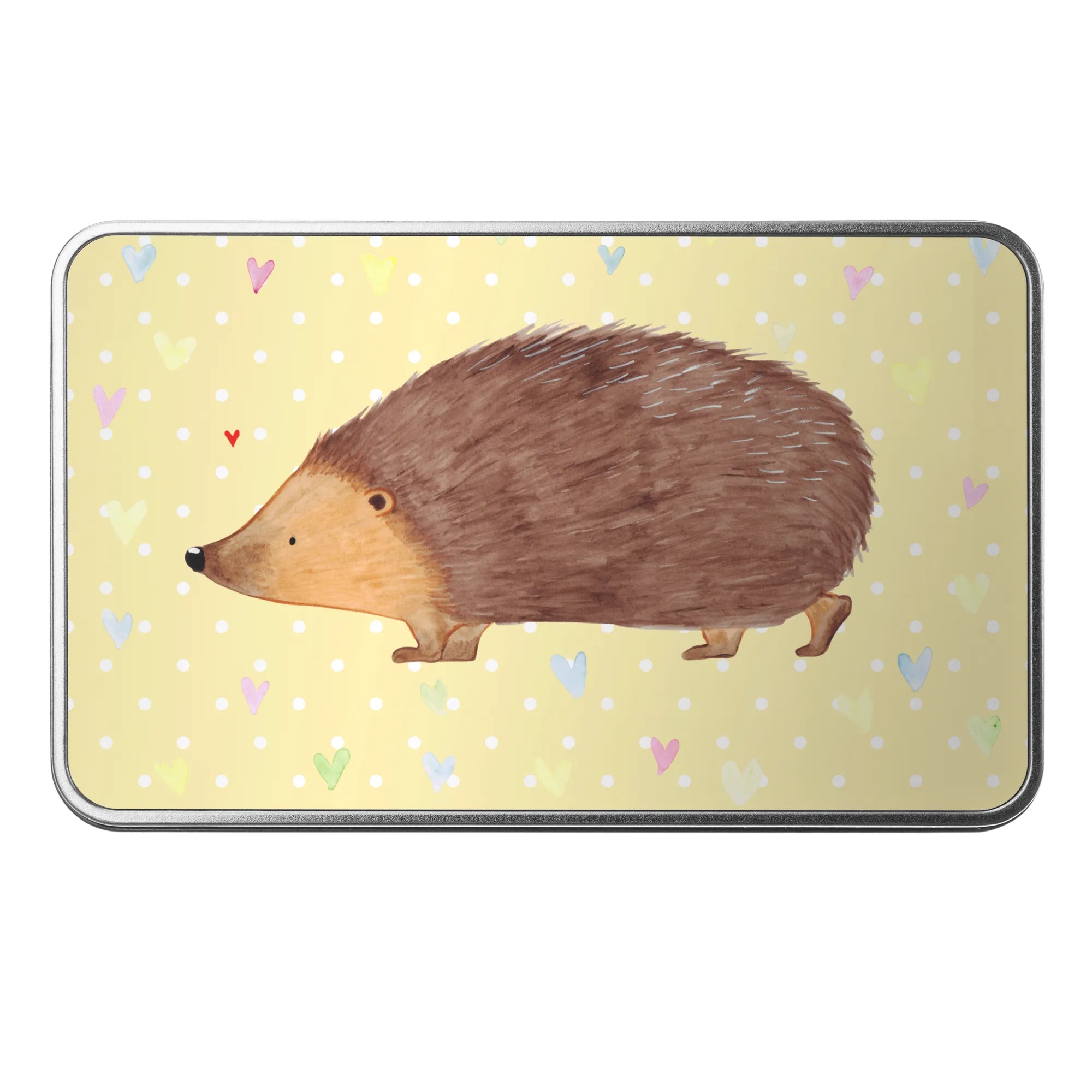 Crafted from high-quality aluminum, this cookie tin features a sweet hedgehog surrounded by hearts, evoking feelings of love and trust. The adorable design, hand-drawn by Mrs. Panda, is set against a cheerful pastel yellow background that makes it a standout piece in any home. The vivid colors and whimsical imagery create a cozy atmosphere, ensuring that wherever you place this tin, it will become a talking point.