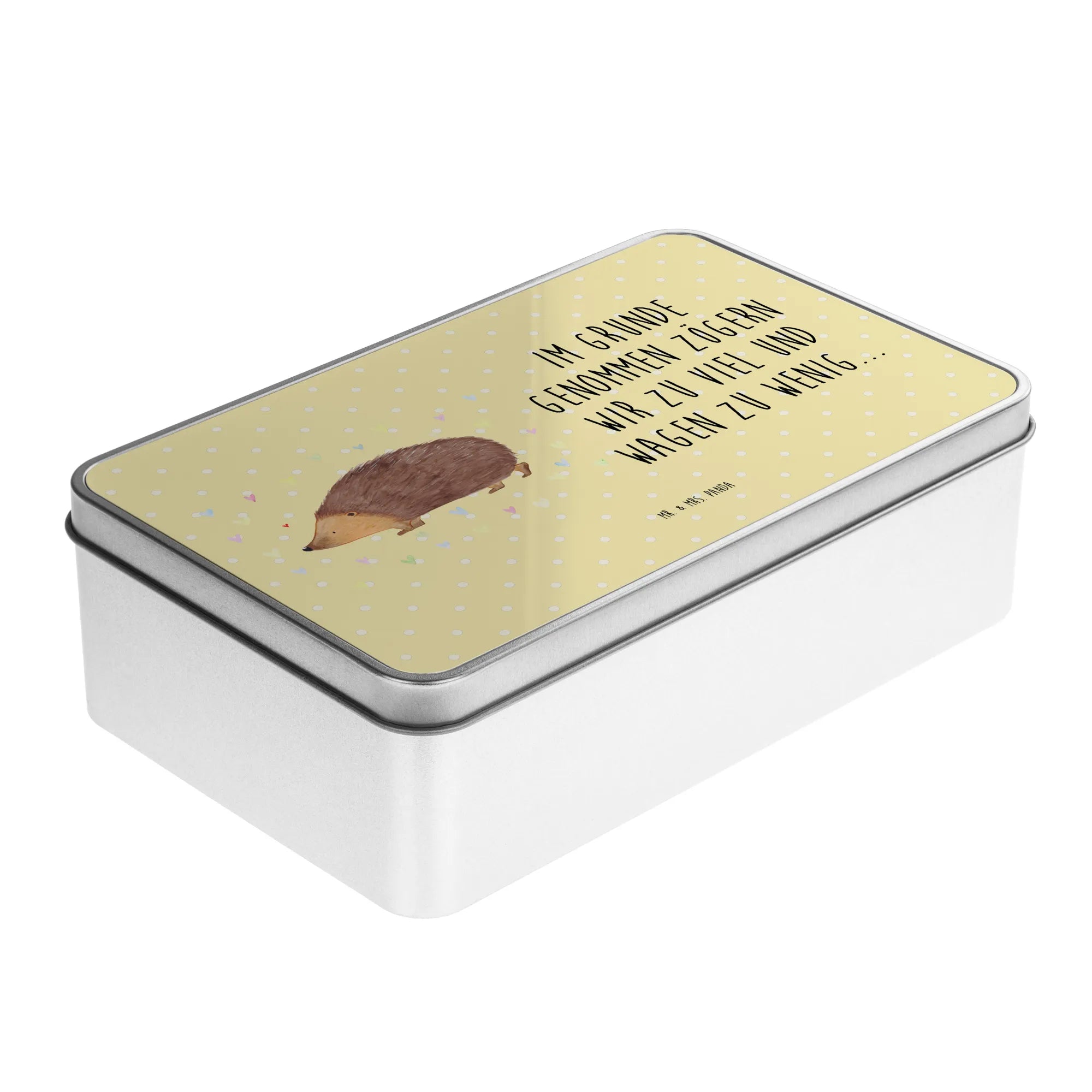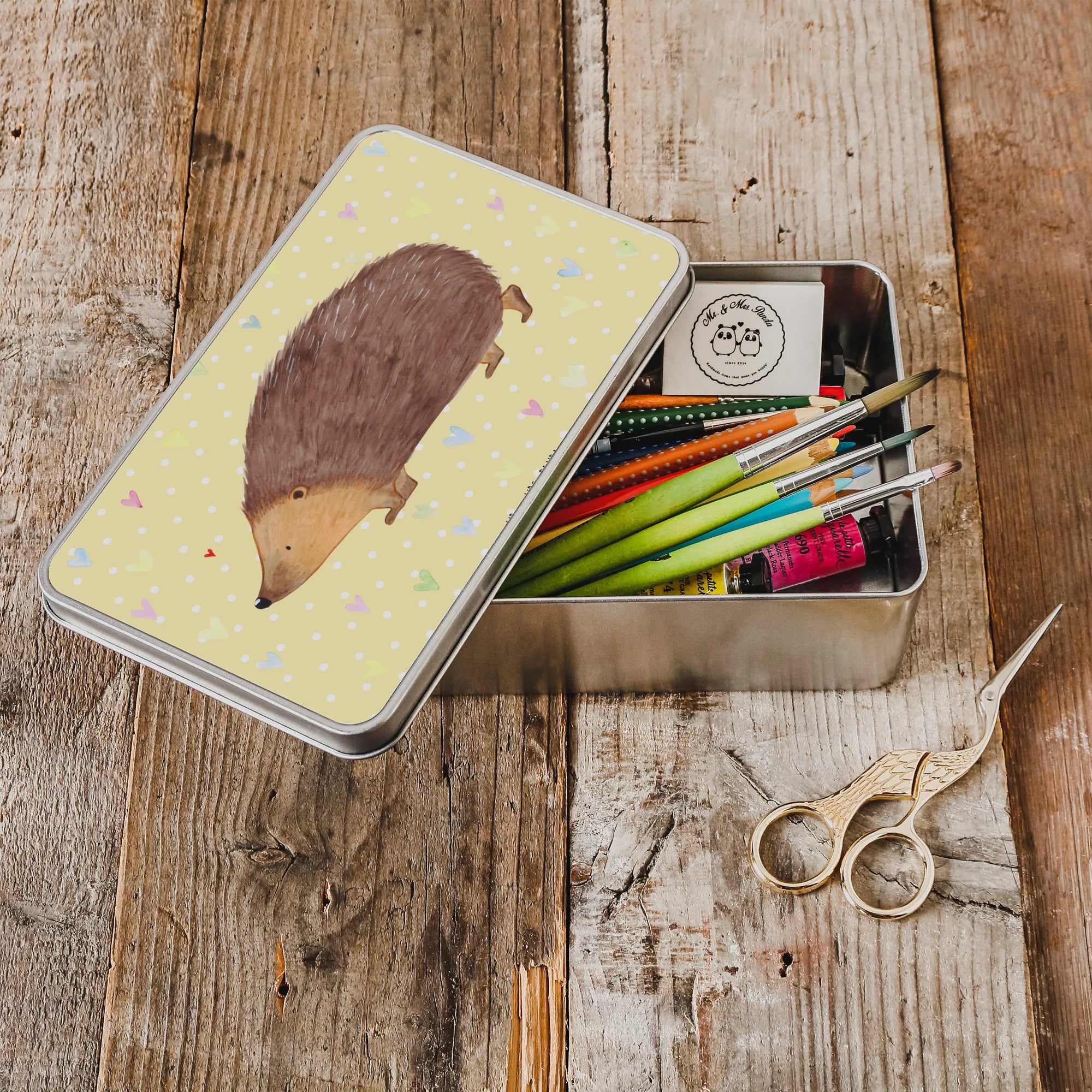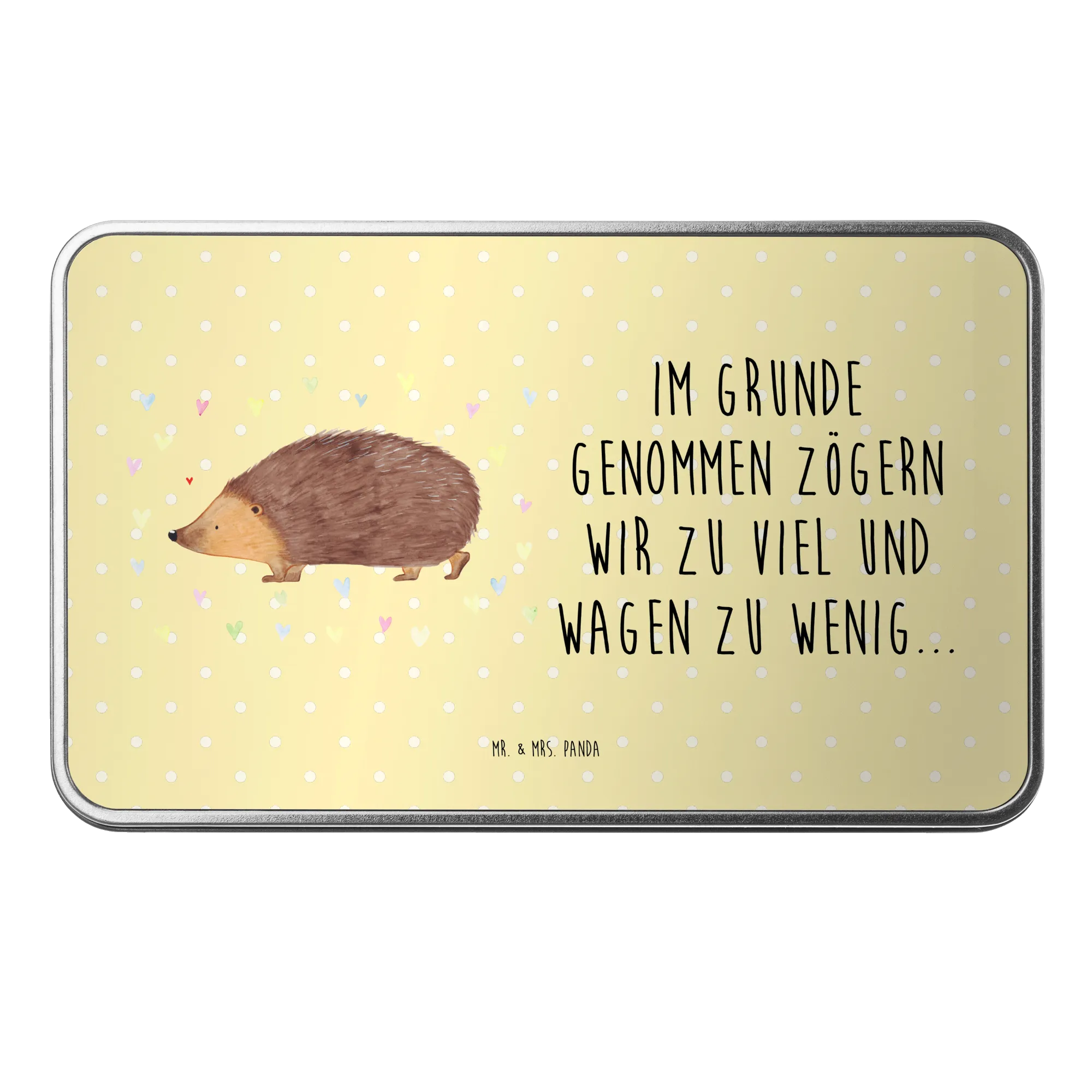 Crafted from high-quality aluminum, this cookie tin features a sweet hedgehog surrounded by hearts, evoking feelings of love and trust. The adorable design, hand-drawn by Mrs. Panda, is set against a cheerful pastel yellow background that makes it a standout piece in any home. The vivid colors and whimsical imagery create a cozy atmosphere, ensuring that wherever you place this tin, it will become a talking point.