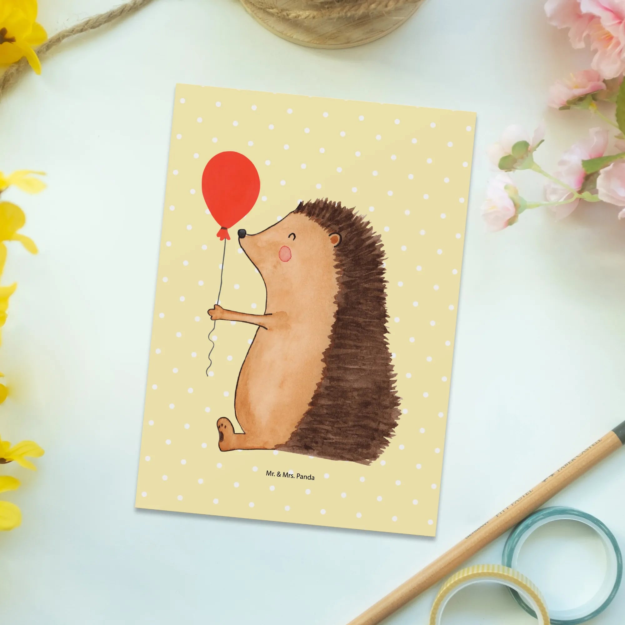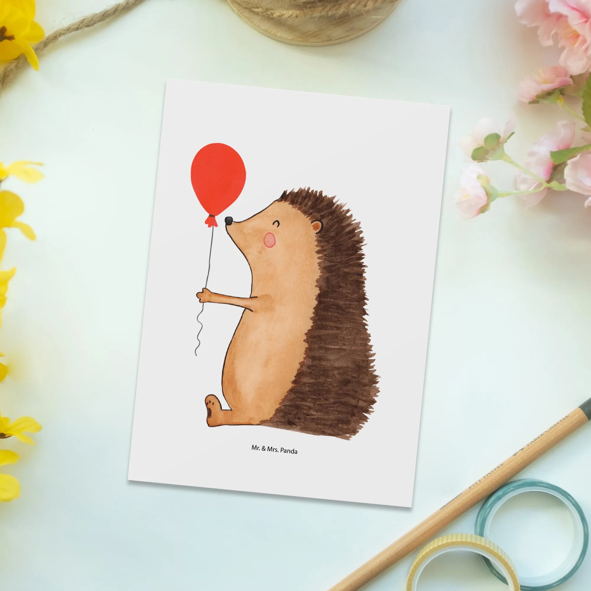 Whether you're an animal lover, a friend looking to put a smile on someone's face, or just someone who appreciates cute illustrations, this postcard is crafted for you. So why wait? Celebrate that special day with the heartfelt charm of our delightful Hedgehog with Balloon postcard from Mr. & Mrs. Panda.