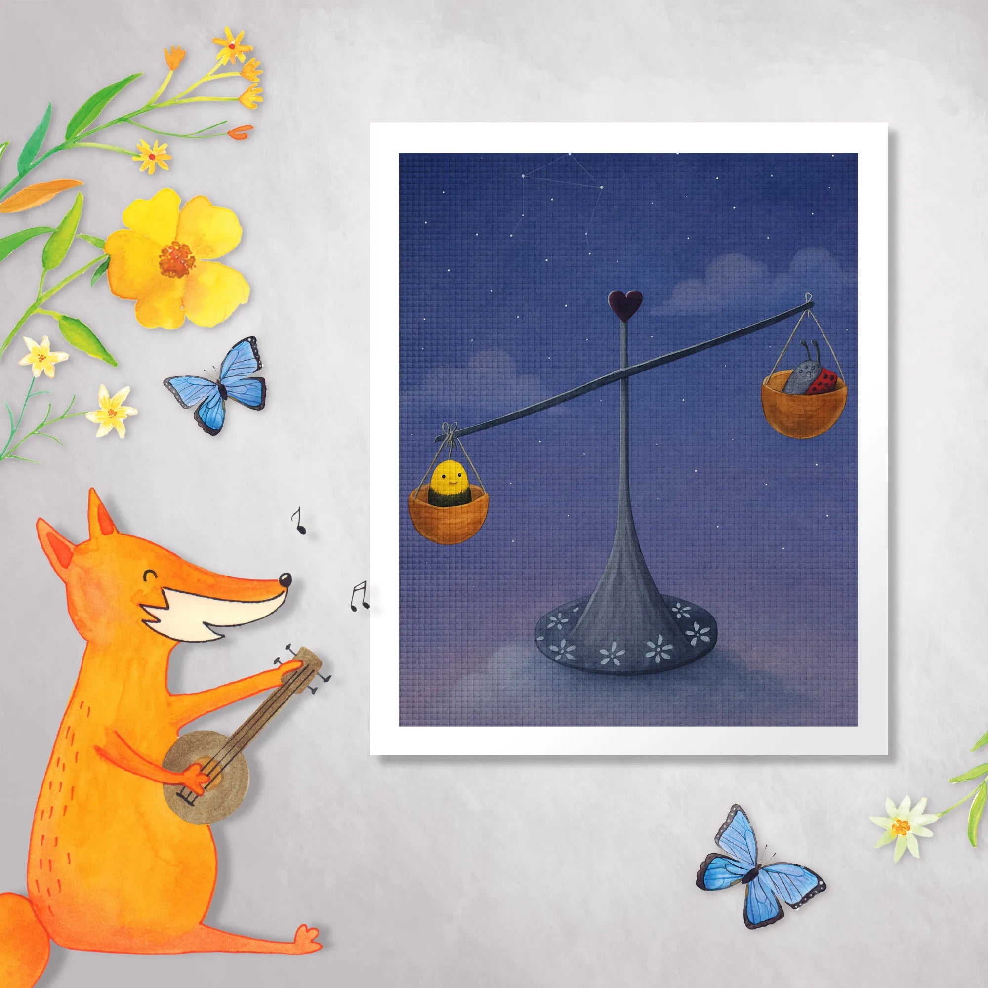 Mit dieser liebevollen Darstellung der Waage bringen wir den Zauber des Sternzeichens direkt zu dir. Die Waage steht für Diplomatie und das Streben nach Ausgewogenheit. In der Darstellung sitzt ein fröhlicher Marienkäfer auf der linken Seite und eine fleißige Hummel auf der rechten Seite. Beide sind gleich schwer und zeigen, wie wichtig es ist, die Balance im Leben zu halten. Waagen sind bekannt für ihren Sinn für Harmonie und ihre Fähigkeit, auch in stürmischen Zeiten ruhig zu bleiben. Dieses Motiv ist nicht nur ein tolles Geschenk für Waage-Geborene im September oder Oktober, sondern auch eine schöne Erinnerung an die Dinge, die im Leben wirklich wichtig sind – Freundschaft, Liebe und das Streben, das Beste aus jedem Moment zu machen. Es eignet sich hervorragend als Waage Geschenk und wird jeden, der sich für die Sterne interessiert, in seinen Bann ziehen!