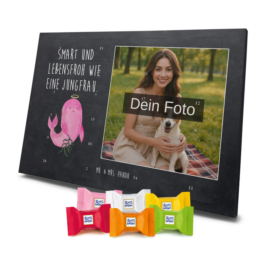 Foto-Adventskalender mit Schokolade von Mr. & Mrs. Panda – personalisiere den Advent mit deinem Lieblingsfoto und unseren liebevollen Motiven & Sprüchen. Dieser Kalender ist ideal, wenn du etwas Persönliches schenken willst: Einfach Foto hochladen, auf hohe Auflösung achten und den passenden Bildausschnitt wählen. Denk daran, nur Bilder zu verwenden, bei denen du die Bildrechte besitzt. Fotos werden nicht nachbearbeitet oder zugeschnitten; Rücknahme bei personalisierten Foto Artikeln ist ausgeschlossen. Die Druckqualität ist brillant, mit seidenmatter Oberflächenveredelung und bedruckten Seitenflächen für ein hochwertiges Erscheinungsbild. Maße: 325 mm x 225 mm x 27 mm. Besonderheit: Du kannst den Kalender sowohl aufhängen als auch aufstellen. Gefüllt ist er mit Ritter Sport Schokowürfeln – köstliche Sorten wie Mousse au Chocolat, Schoko Crisp, Voll-Nuss in Nougatcreme, Karamell Duo, Joghurt und Erdbeer-Joghurt warten hinter den Türchen. Ein liebevoll gestaltetes Geschenk, das Erinnerungen und Genuss verbindet und die Vorfreude auf Weihnachten jeden Tag versüßt.