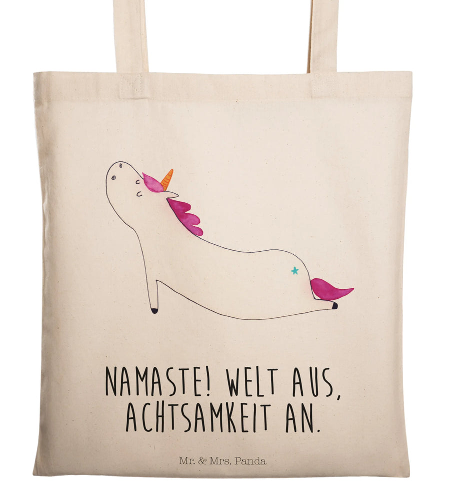 Die Tragetasche ist formbeständig durch umsäumte Innennähte und bietet lange Tragegriffe mit stabilem Cross Stitching – so hält die Stofftasche auch schwere Einkäufe sicher. Das Motiv ist von Mrs. Panda handgezeichnet und macht die Tasche zum idealen Geschenk für Yogafans, Einhorn-Liebhaberinnen oder als liebevolle Geste für deine beste Freundin.