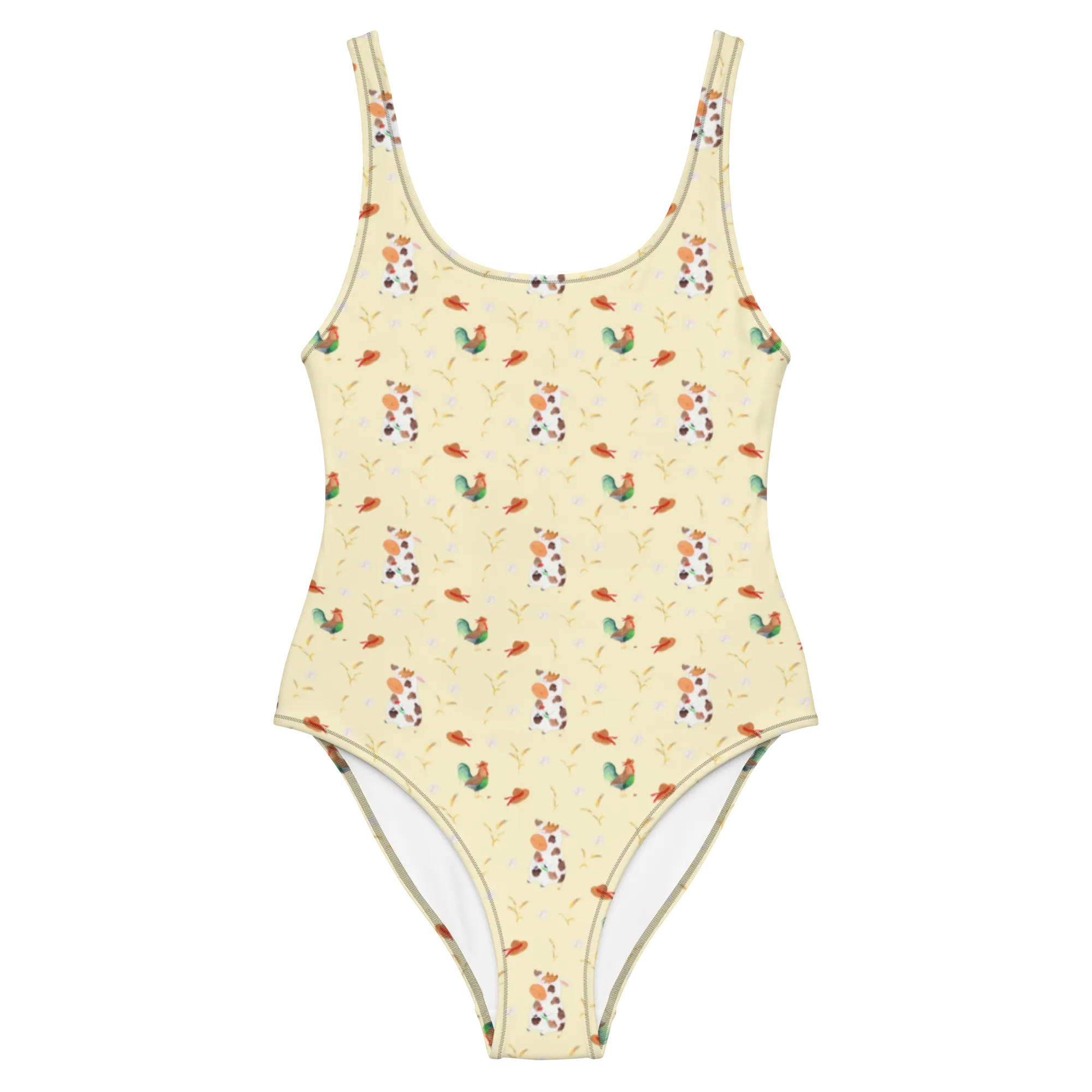 Designed for those who cherish the whimsy of farm life, this swimsuit is ideal for any animal lover or anyone dreaming of joyful days spent near the barnyard. The cute cow, holding a flower, embodies the carefree spirit that comes with summer adventures and memories by the pool or beach.