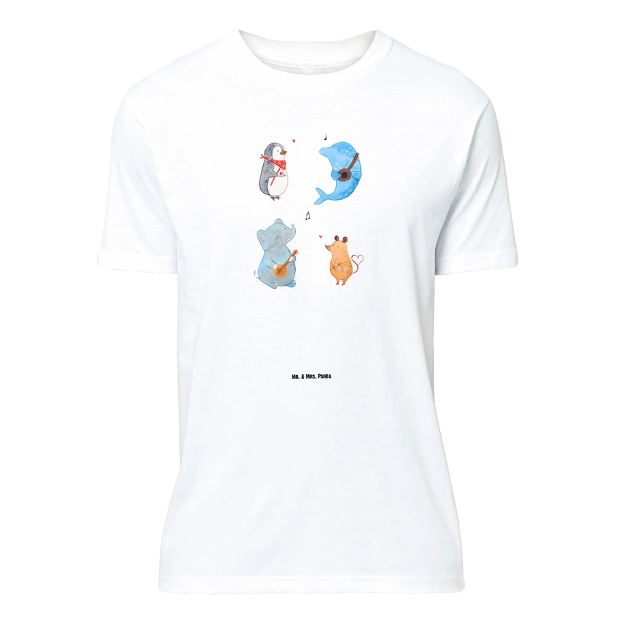 Suchst du ein fröhliches, besonderes Geschenk oder ein neues Lieblingsteil? Unser Größe L T-Shirt mit dem Big-Band-Motiv bringt Musik und Tierliebe in deinen Alltag. Ein Pinguin, eine Maus, ein Delfin und ein Elefant musizieren hier gemeinsam und sorgen für gute Laune. Das liebevoll aquarellierte Design wurde von Mrs. Panda gezeichnet und hebt sich auf dem schwarzen Background besonders schön ab.
