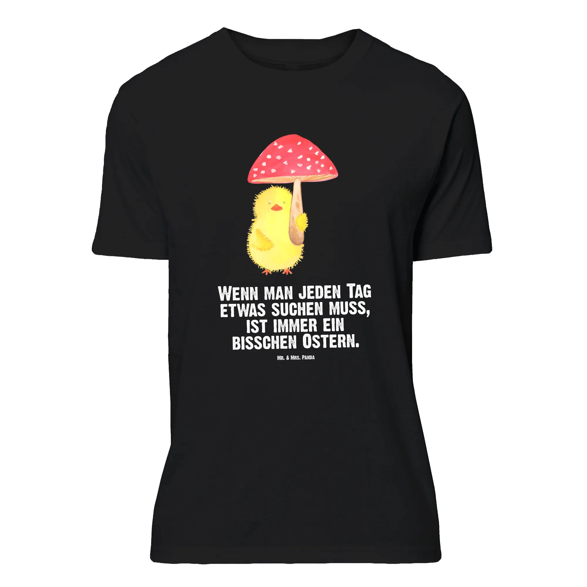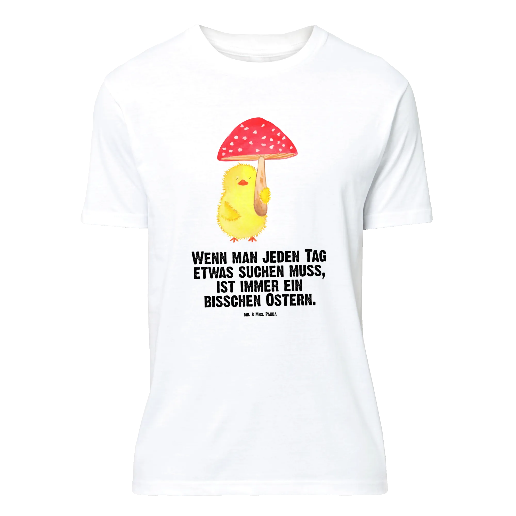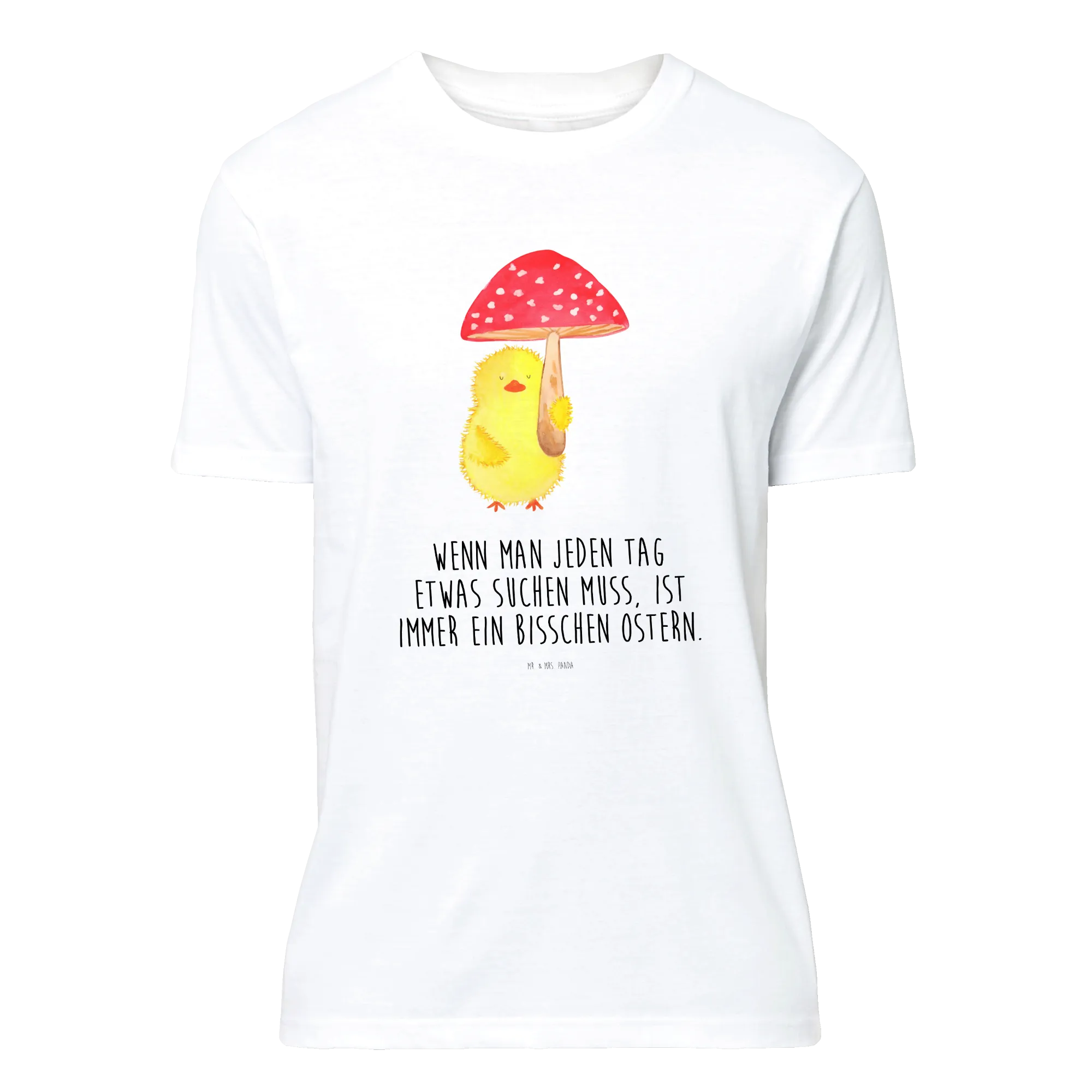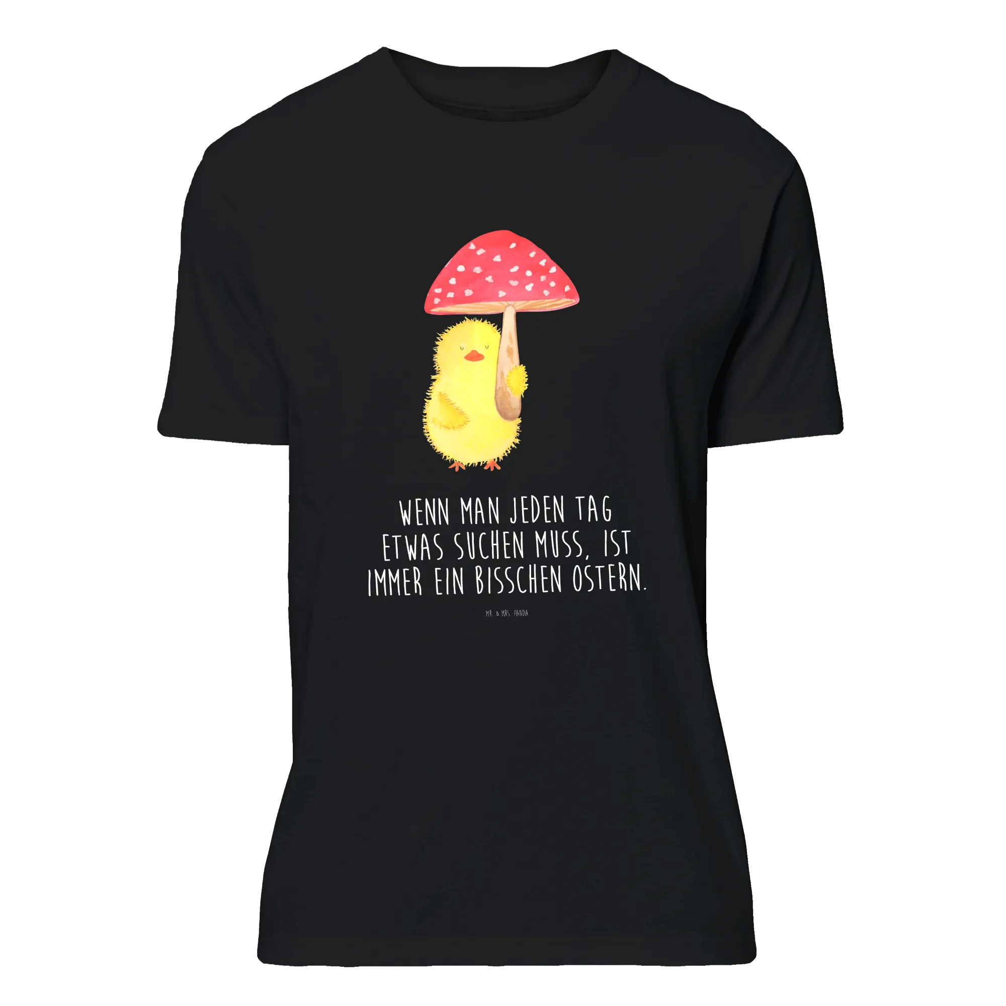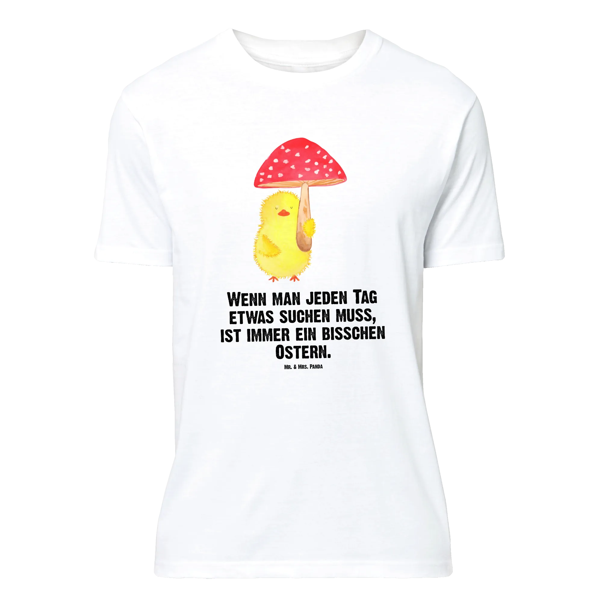 Embrace the delightful essence of Easter with this charming motif where a cheerful little chick holds a whimsical fly agaric toadstool as if it were an umbrella! It's not just a cute image; it encapsulates the spirit of joy and the luck that comes with the season. The saying, 'Wenn man jeden Tag etwas suchen muss, ist immer ein bisschen Ostern,' beautifully highlights that every day is an opportunity to find happiness. This endearing chick reminds us to keep seeking out the magic in life, whether through springtime blooms or the laughter of friends. Celebrate and let this design bring a splash of alegría to your world!
