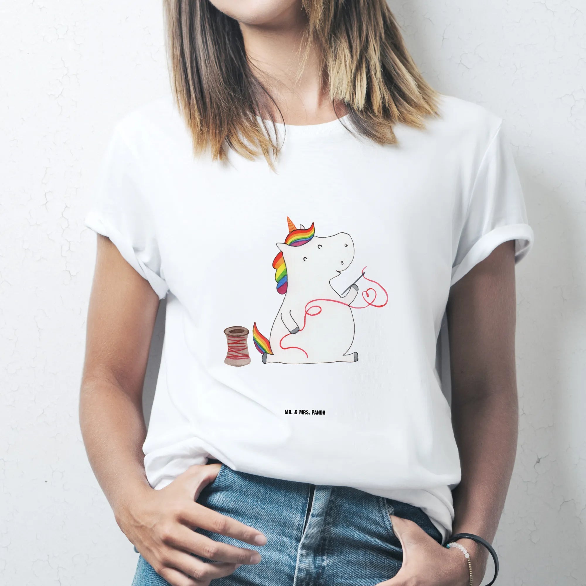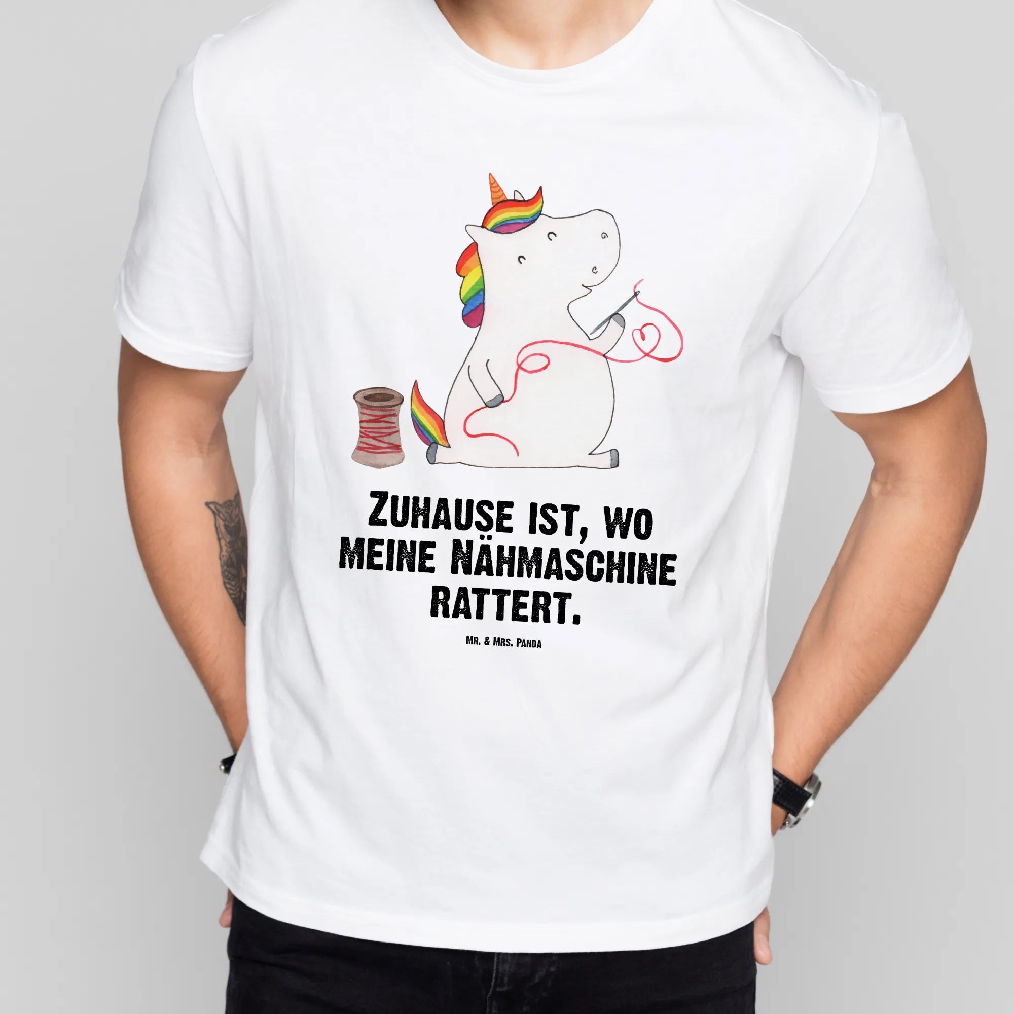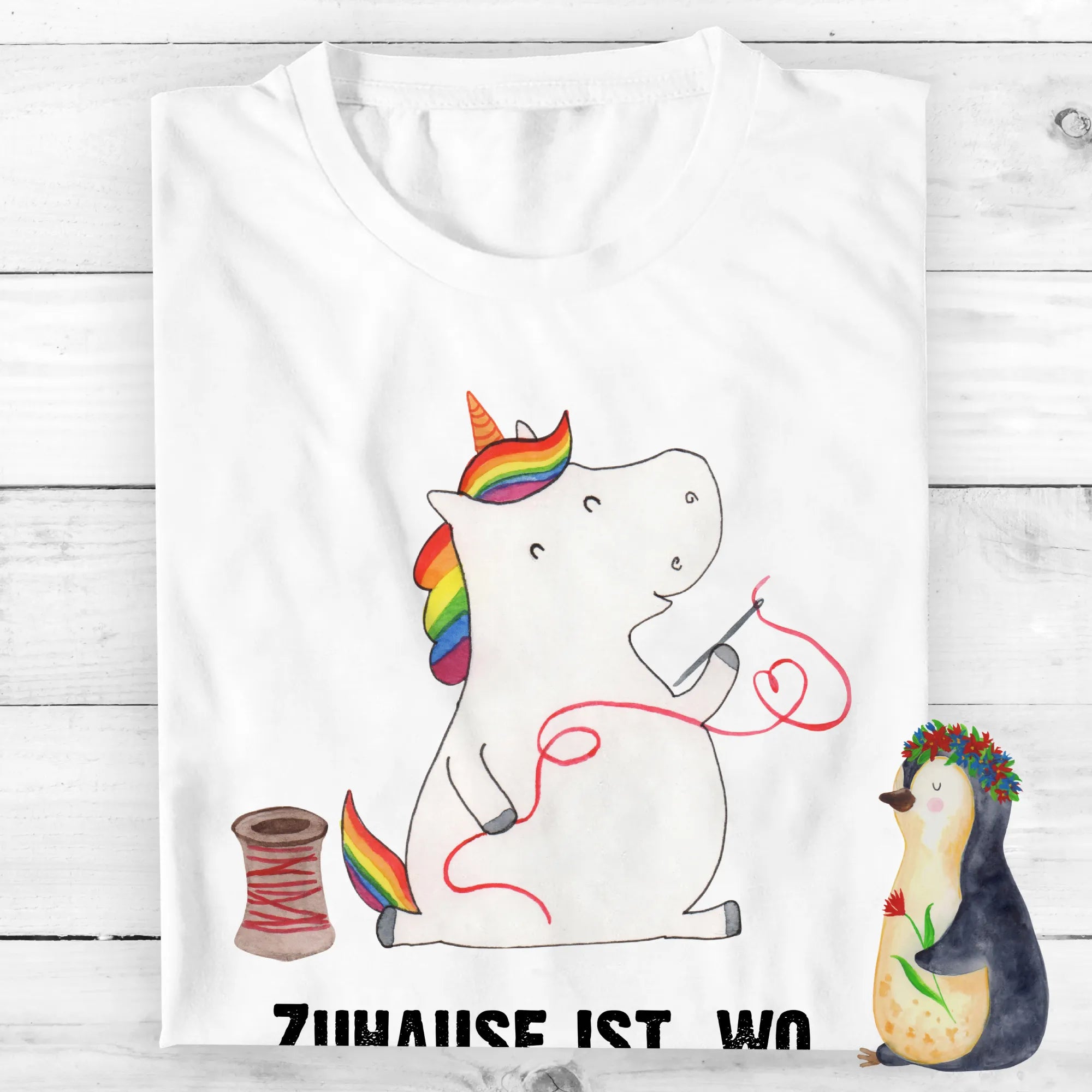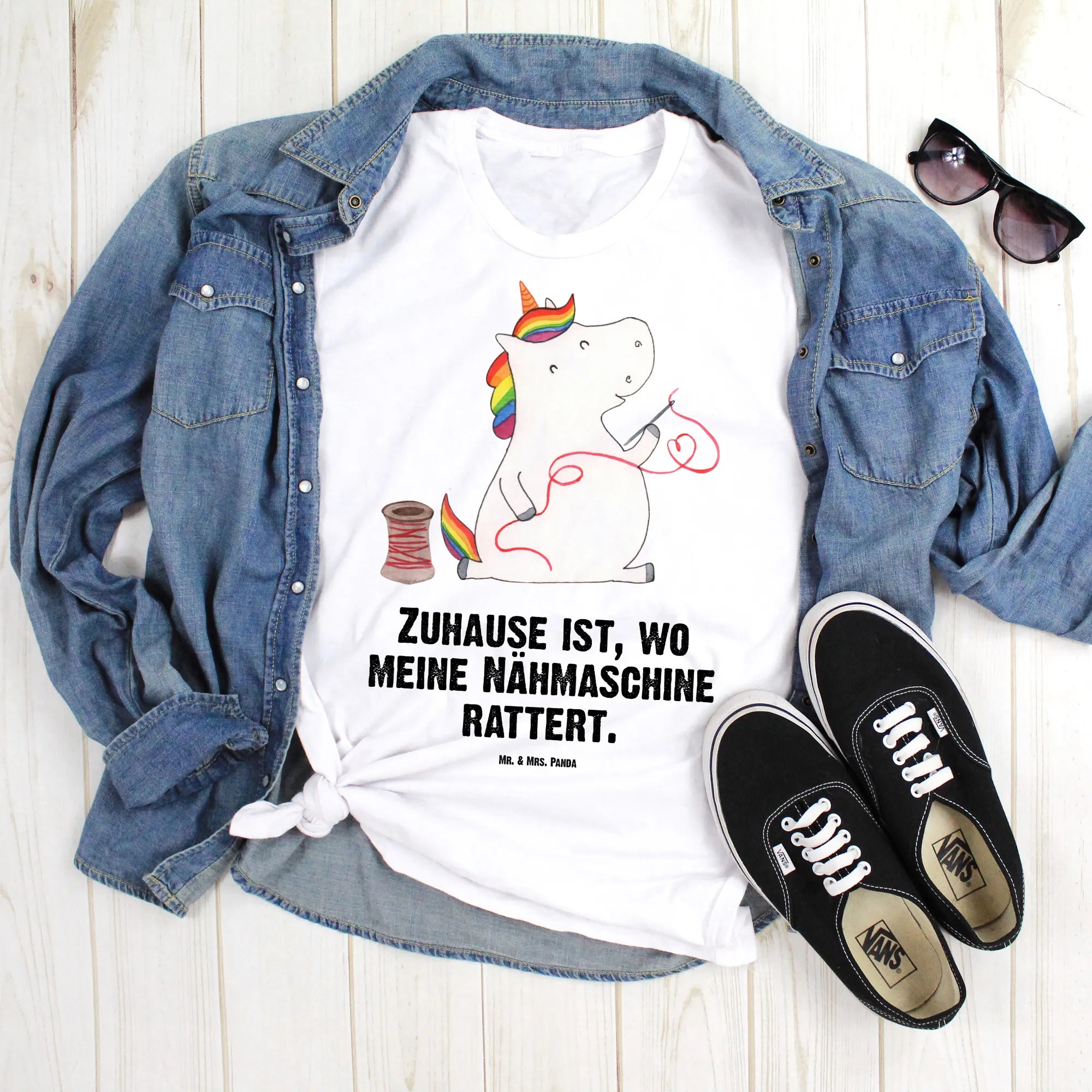 Zauberhaftes Einhorn trifft Nähleidenschaft: Du suchst ein besonderes Geschenk für eine kreative Freundin? Das Einhorn Näherin T-Shirt aus der Einhorn - Kollektion von Mr. & Mrs. Panda vereint liebevolles Design mit einem frechen Spruch: „Zuhause ist, wo meine Nähmaschine rattert.“ 🧵🦄