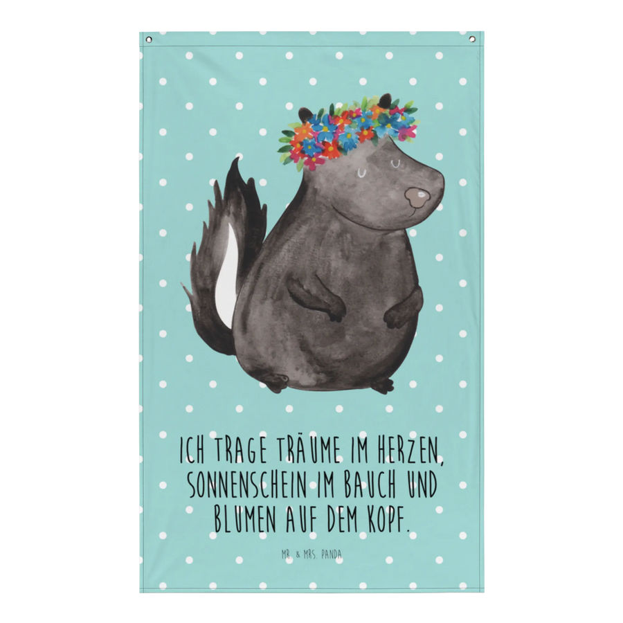 Dive into joy with our Skunk Flower Girl! This delightful skunk, adorned with a vibrant crown of flowers, embodies a carefree spirit that encourages us to let our uniqueness shine. Her heartfelt slogan, "Ich trage Träume im Herzen, Sonnenschein im Bauch und Blumen auf dem Kopf," beautifully captures the essence of living joyfully. It’s about filling our hearts with dreams, feeling the warmth of sunlight within, and celebrating each day like it’s a garden in full bloom. Let her inspire you to practice yoga, laugh often, and love fiercely. With her presence, the sky’s the limit—be wild, be free, and embrace every quirk that makes you, you!