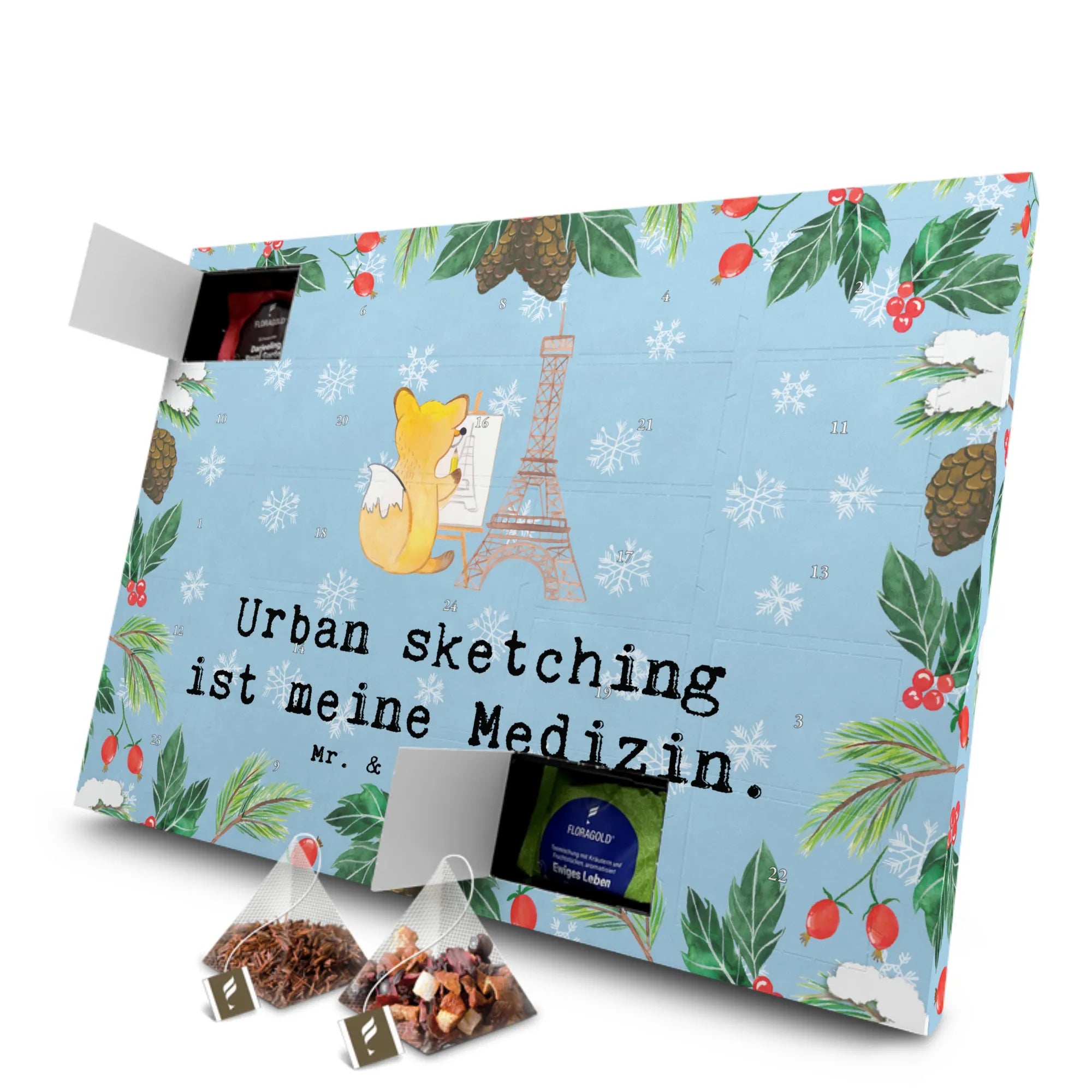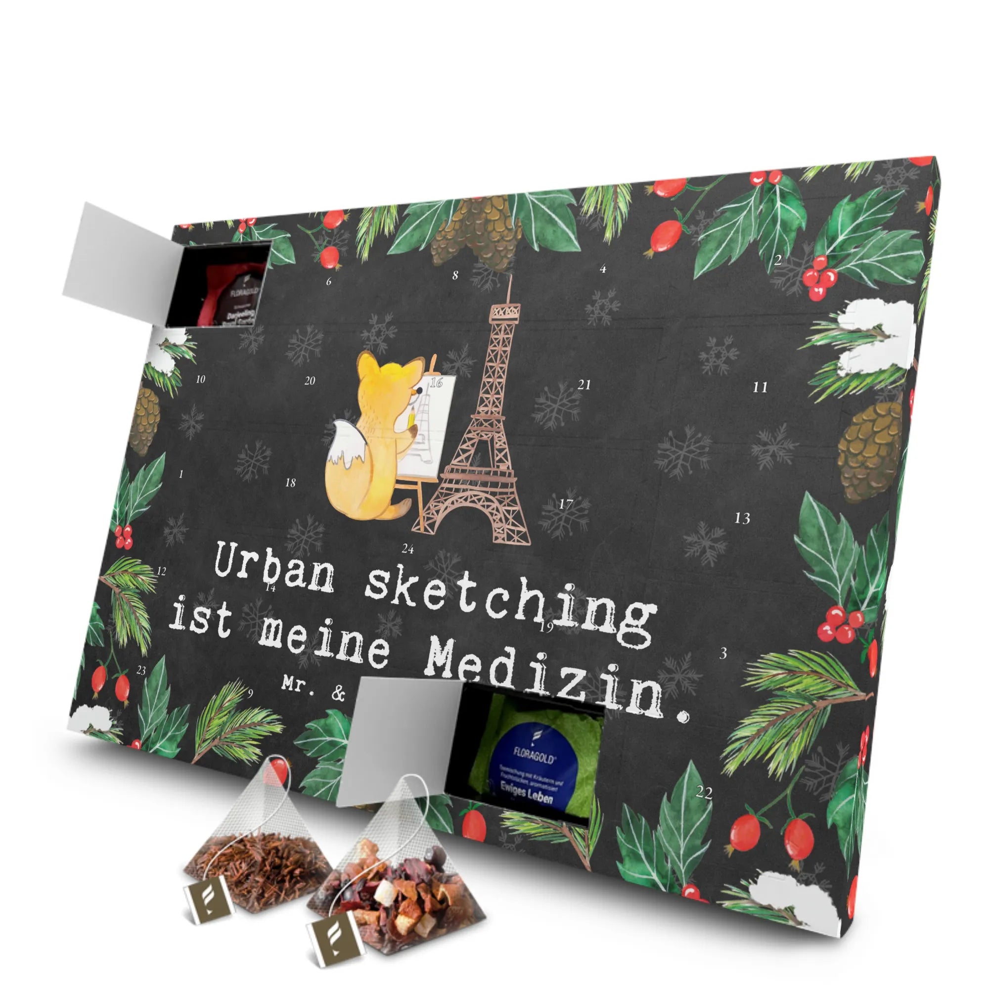 Entdecke den einzigartigen Tee Adventskalender "Fuchs Urban sketching Medizin" von Mr. & Mrs. Panda – ein perfektes Geschenk für alle, die das Zeichnen und Malen lieben!