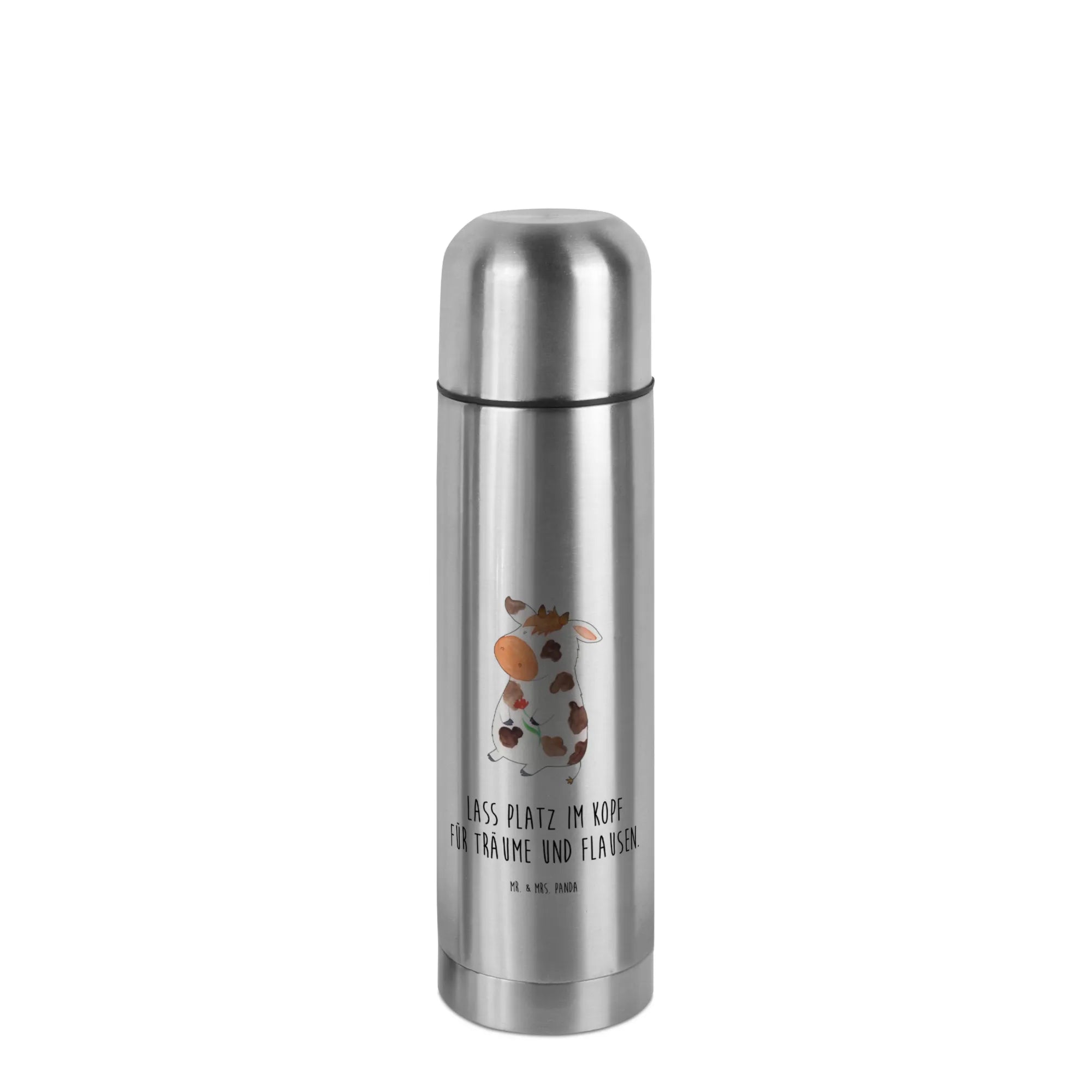 Die Thermoskanne ist aus robustem Edelstahl gefertigt und überzeugt mit einer brillanten Druckqualität auf silbernem Untergrund. Mit einem niedlichen Kuhmotiv, das liebevoll von Mrs. Panda handgezeichnet wurde, bringt sie ein Stück Bauernhof-Atmosphäre direkt in deinen Alltag.