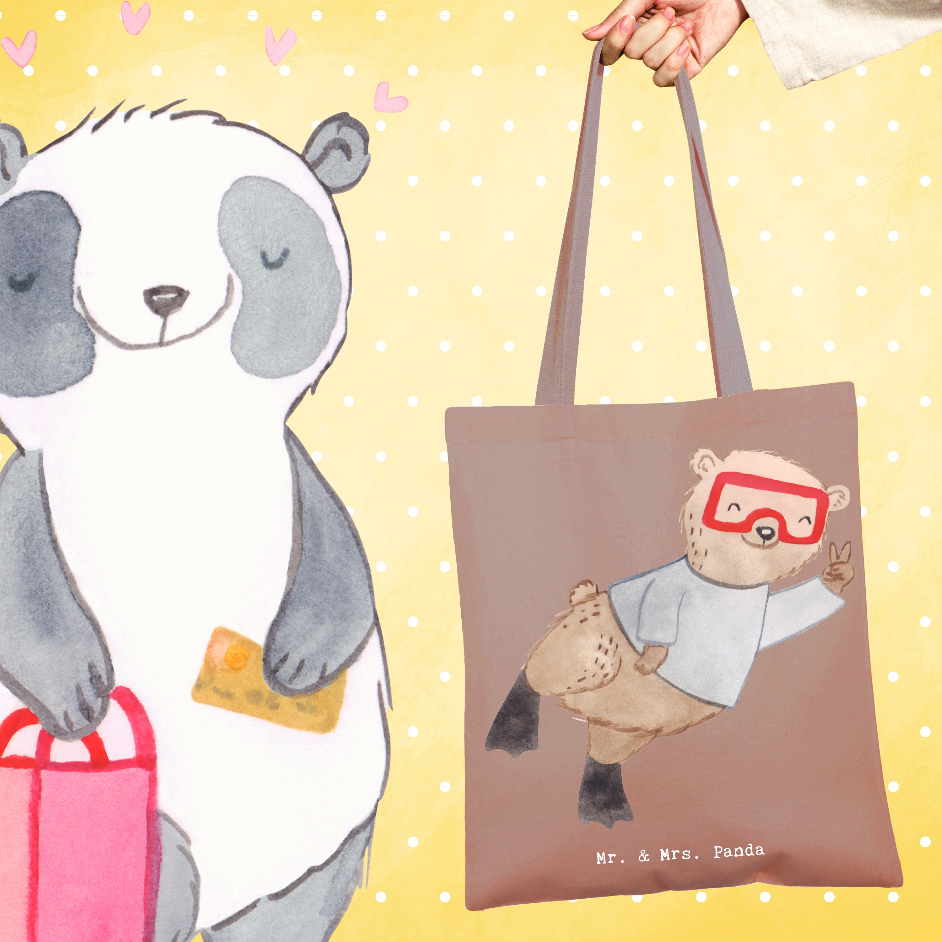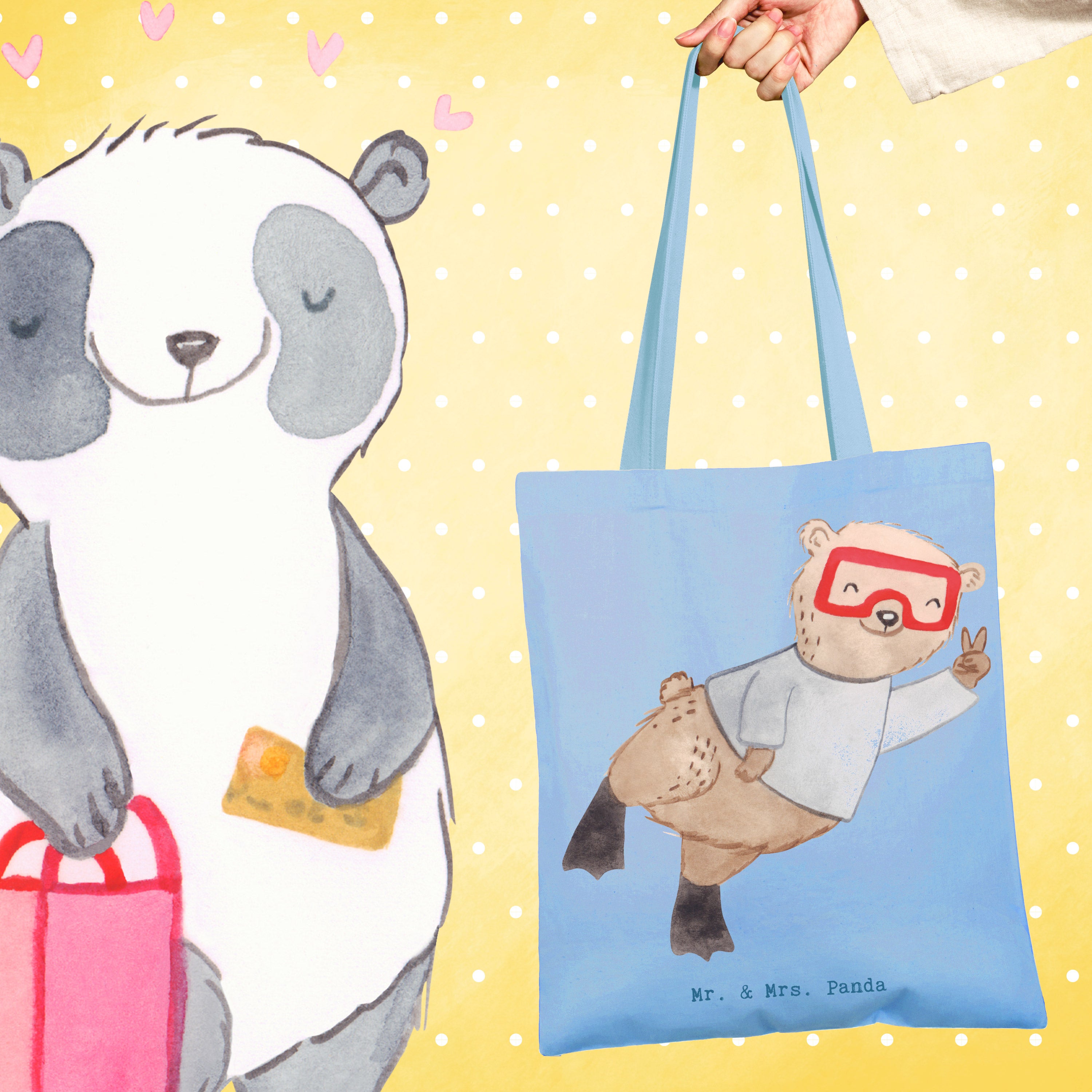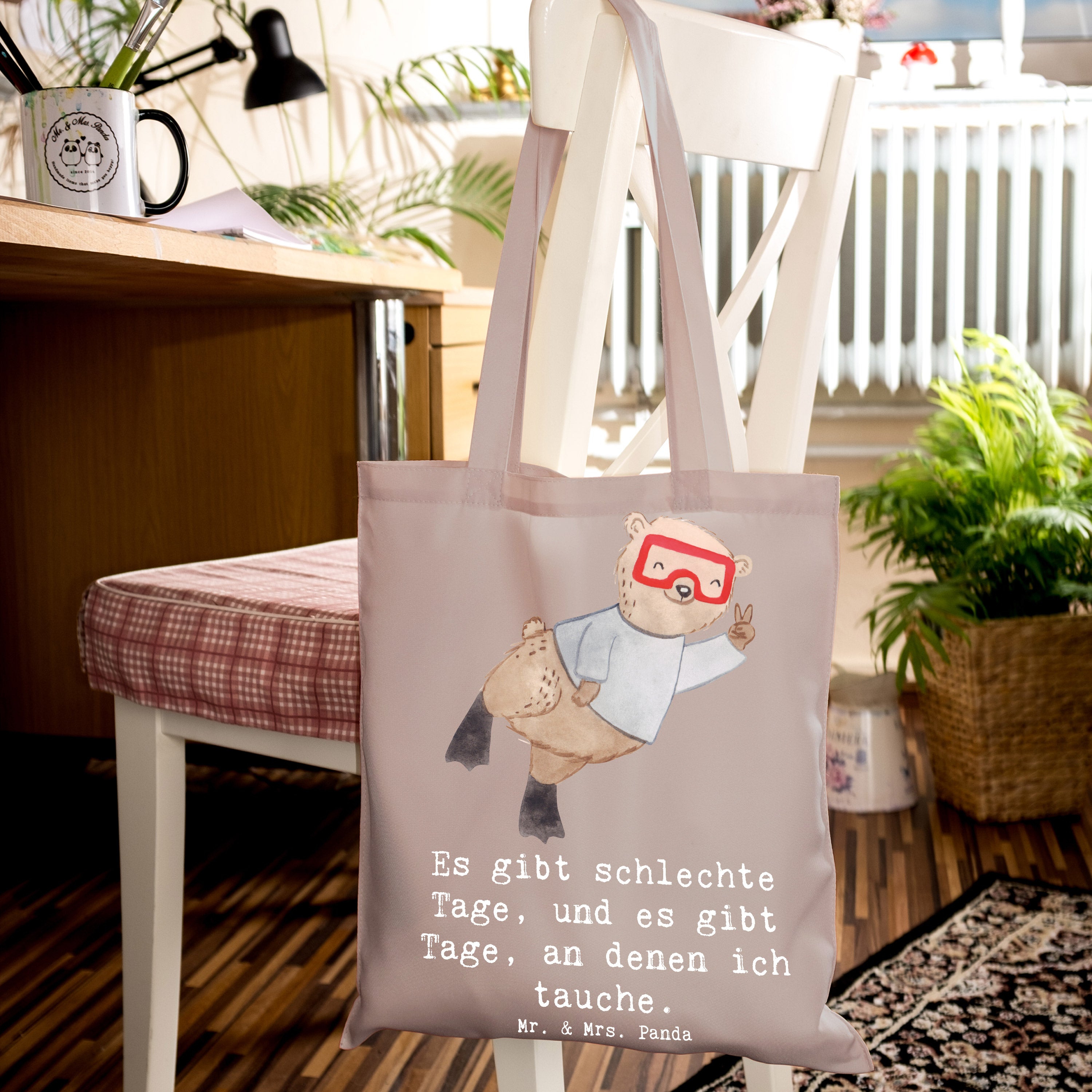 Das ideale Geschenk: Verschenke diese Tragetasche als Dankeschön für Tauchlehrer, als Geschenk für Hobby-Sportler, als Mitbringsel nach dem Tauchkurs oder als lustige Aufmerksamkeit für Freunde, die das Tauchen lieben. Die Hobby & Sport Kollektion von Mr. & Mrs. Panda bietet viele weitere Motive für jeden Anlass.