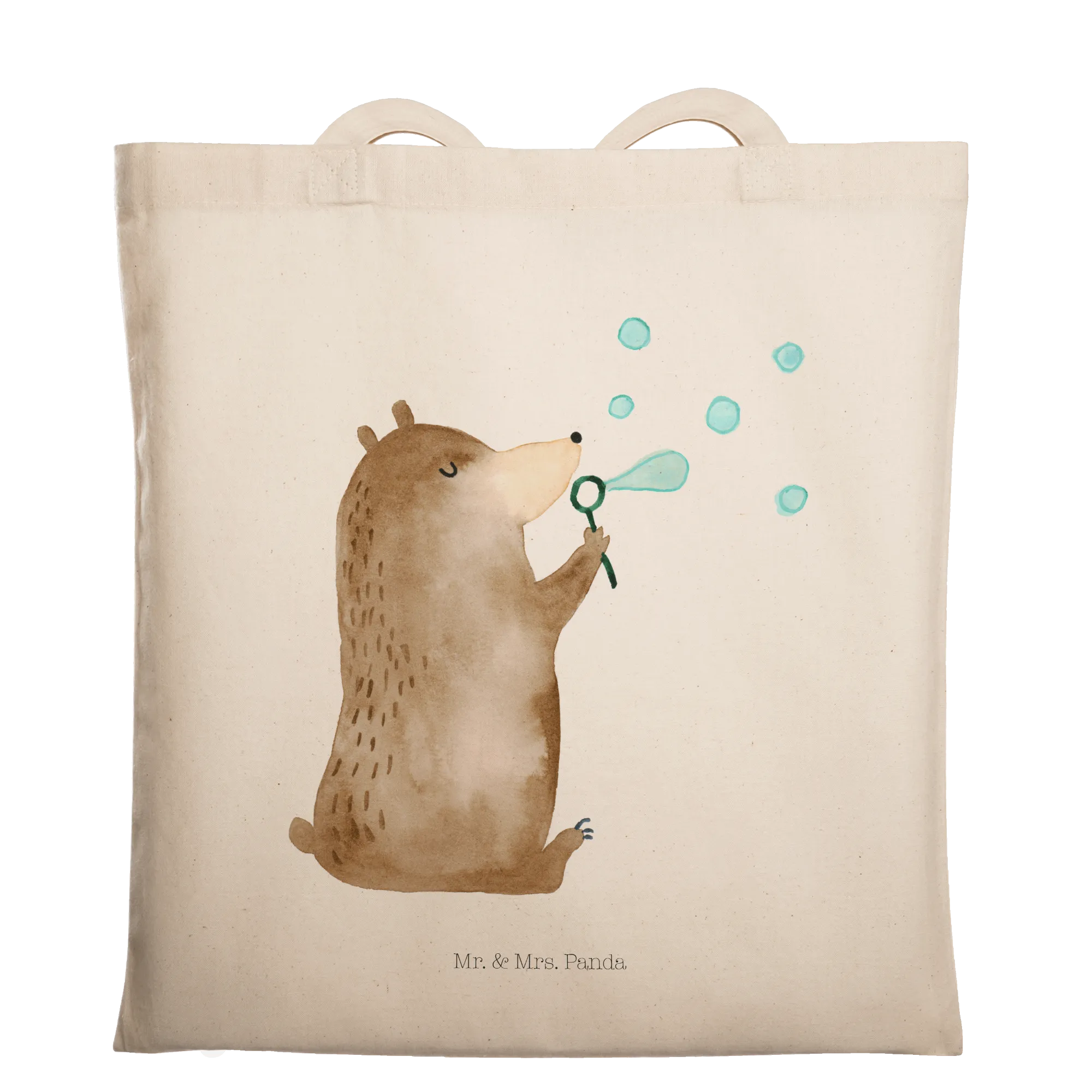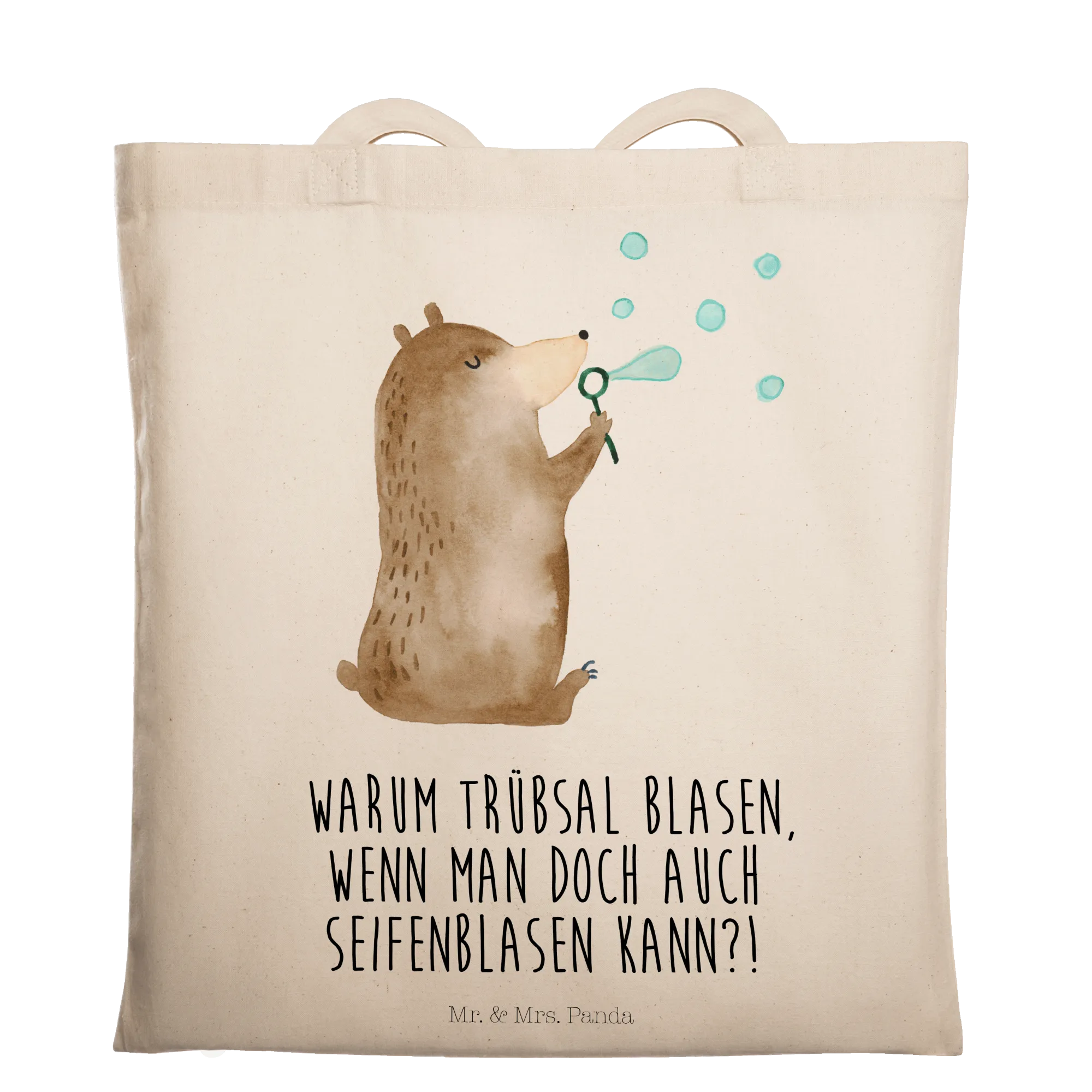 Warum Trübsal blasen, wenn man doch auch Seifenblasen kann?! Genau dieses Gefühl fängt unsere liebevoll gestaltete Tragetasche „Bär Seifenblasen“ von Mr. & Mrs. Panda ein. Das hübsche Motiv zeigt einen niedlichen Teddybär, der mit freudigem Blick Seifenblasen in die Luft pustet – ein kleiner Moment voller Leichtigkeit und Glück.