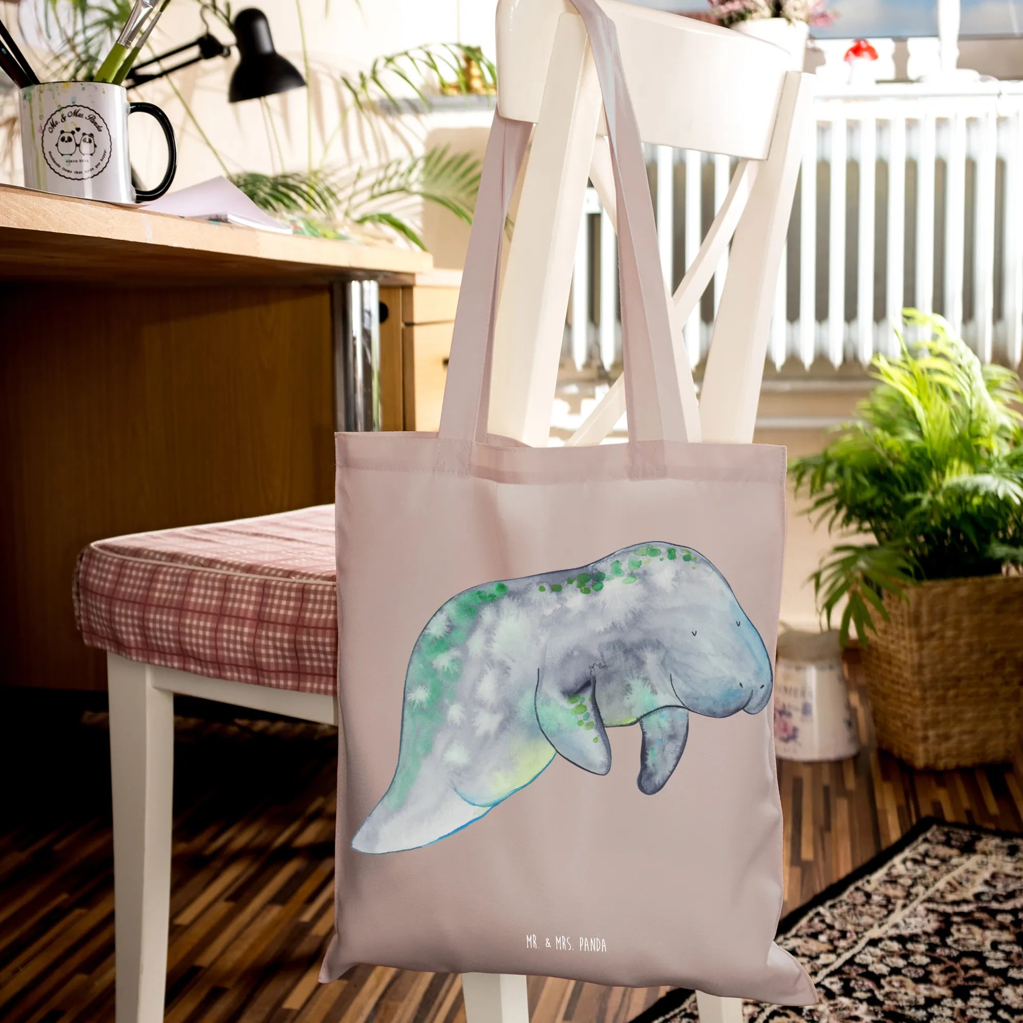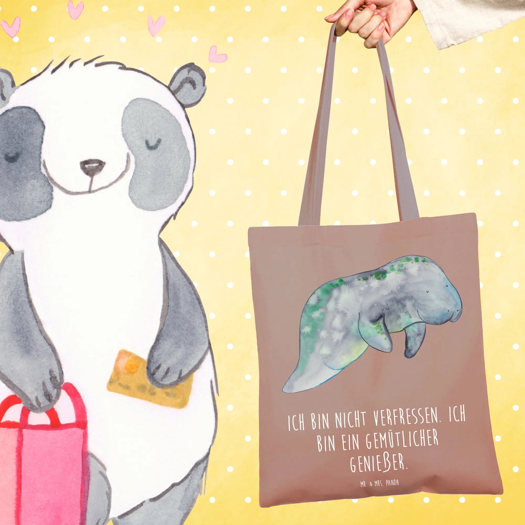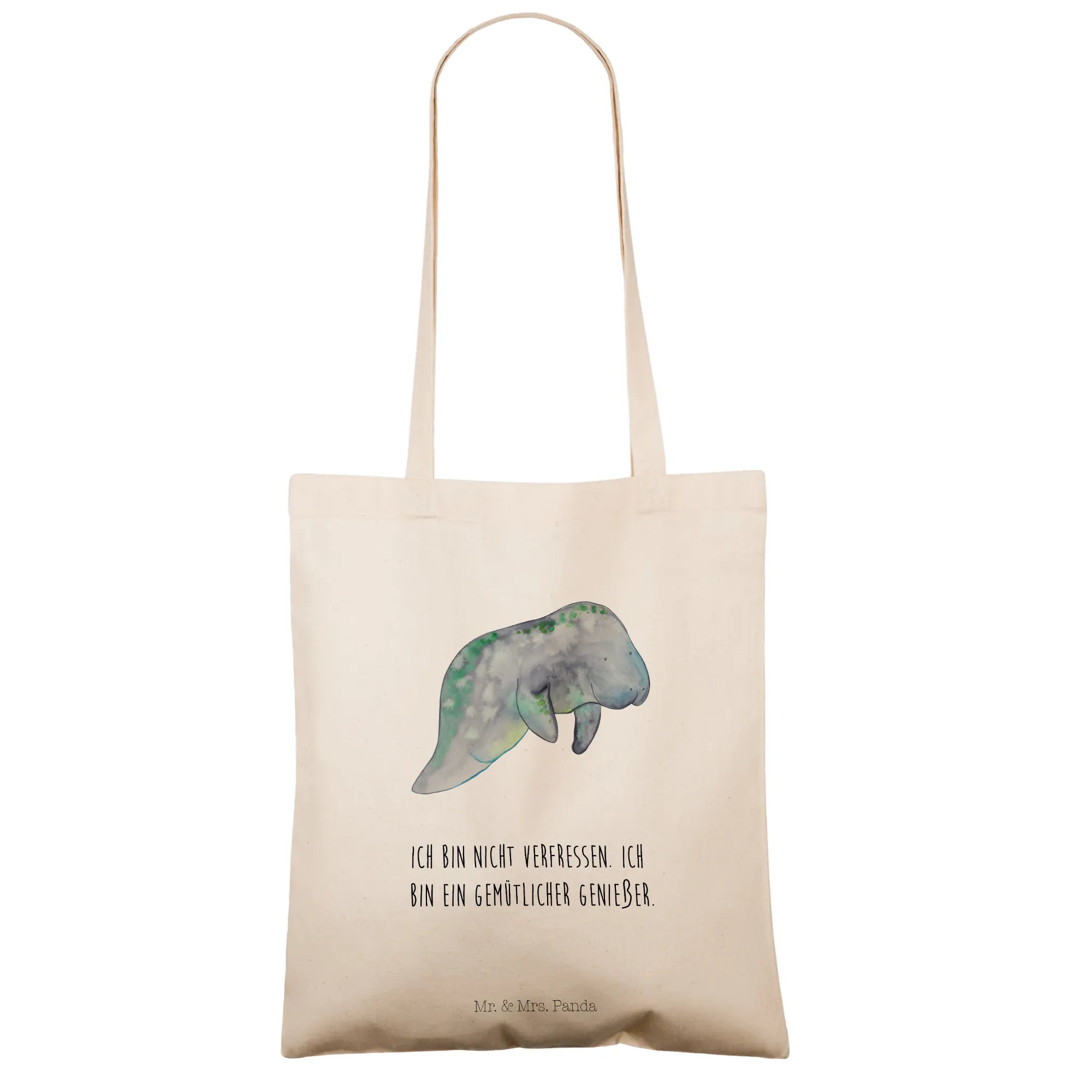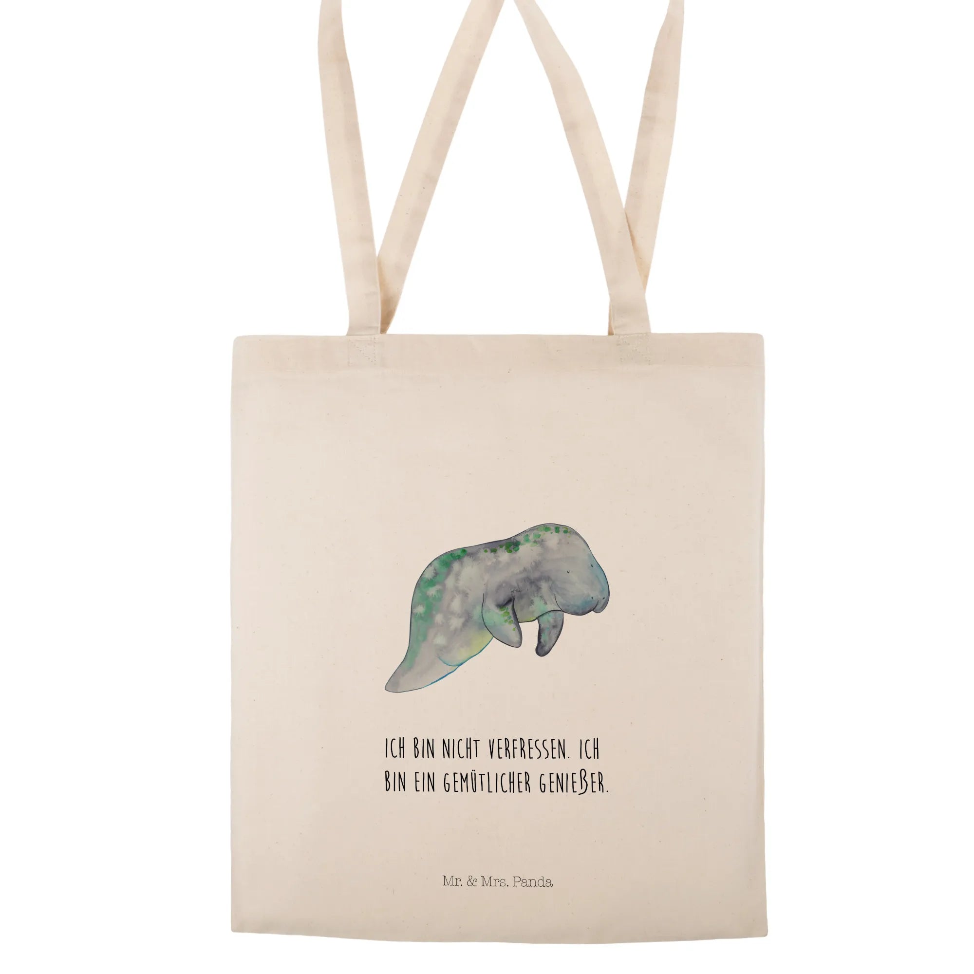The design features soft blues and greens in a watercolor effect, creating a calming aesthetic reminiscent of the ocean depths—ideal for anyone who finds joy in the mesmerizing underwater world. The cute manatee chilling on the bag also comes with the charming slogan, "Ich bin nicht Verfressen. Ich bin ein gemütlicher Genießer," which translates to "I am not greedy. I’m a cozy enjoyer." This makes it an excellent gift for birthday celebrations, holiday presents, or even a special treat for yourself when you're enjoying a relaxing day at home.