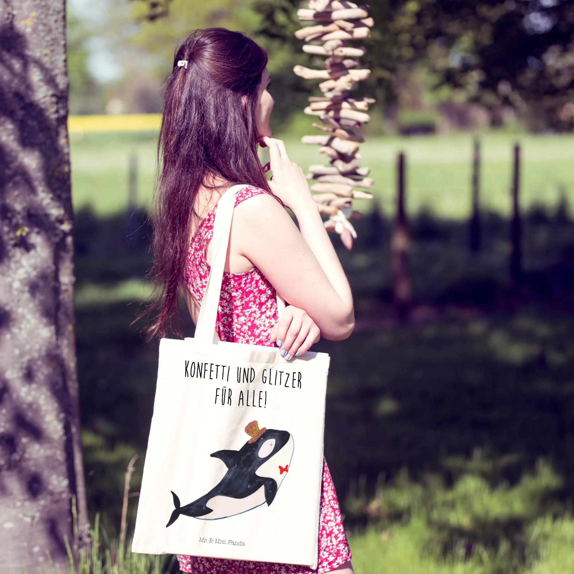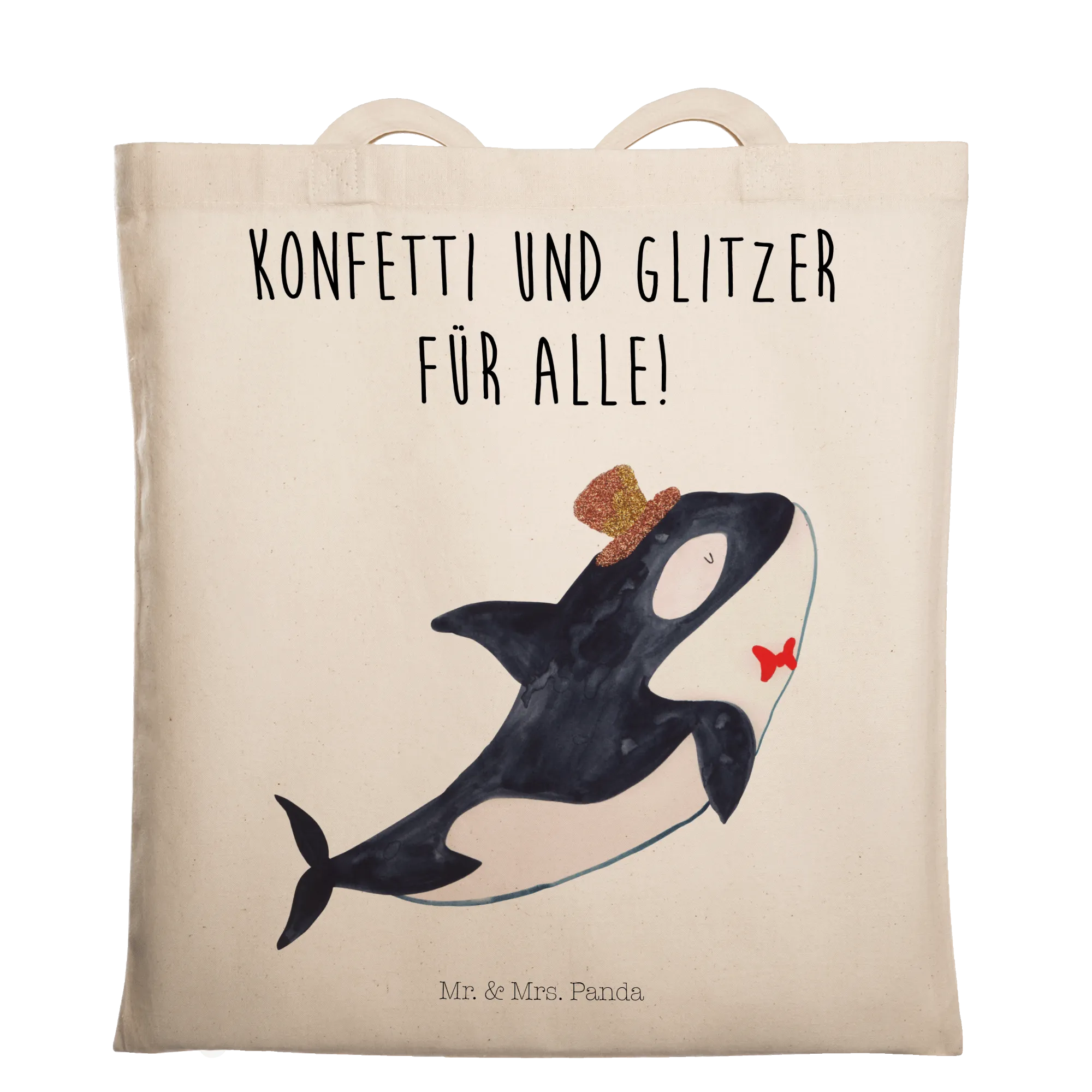 Dive into a world of celebration with our whimsical orca! It joyfully showcases a stunning contrast of black and white, topped with a floral cylinder hat that is pure delight. A cheerful little red fish adds just the right amount of charm to this festive motif. With the saying 'Konfetti und Glitzer für alle!', this orca brings an uplifting vibe to any birthday party or celebration. It perfectly embodies the spirit of fun and togetherness, making every gathering a feast of joy.